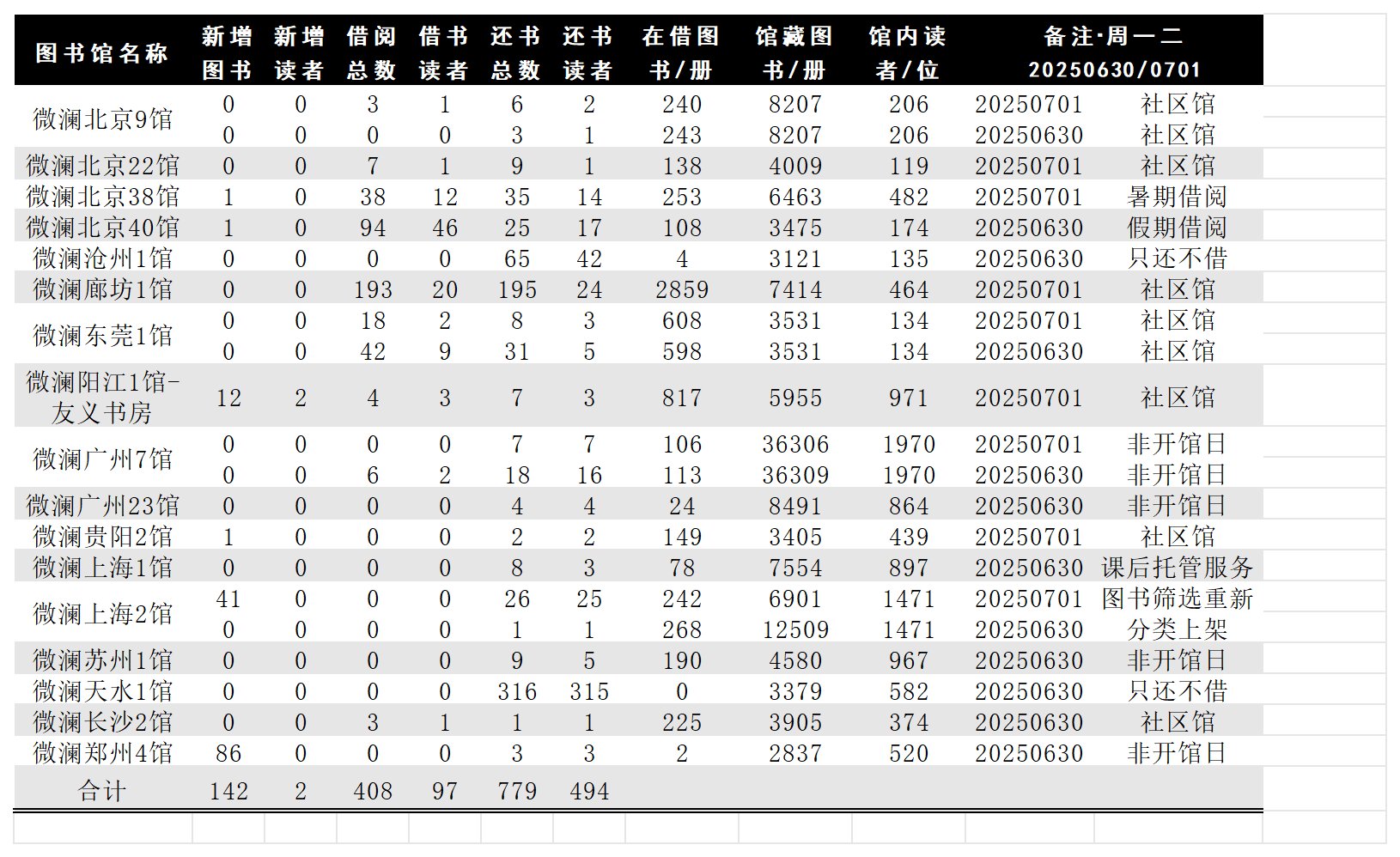 上海2馆图书筛选和重新分类上架,北京38、40馆本学期闭馆日,社区馆日常开放等,为97位读者借阅图书408册次,处理归还图书779册(494人);购买/受捐/学校馆藏等录入上架图书142册,新增读者2位。
