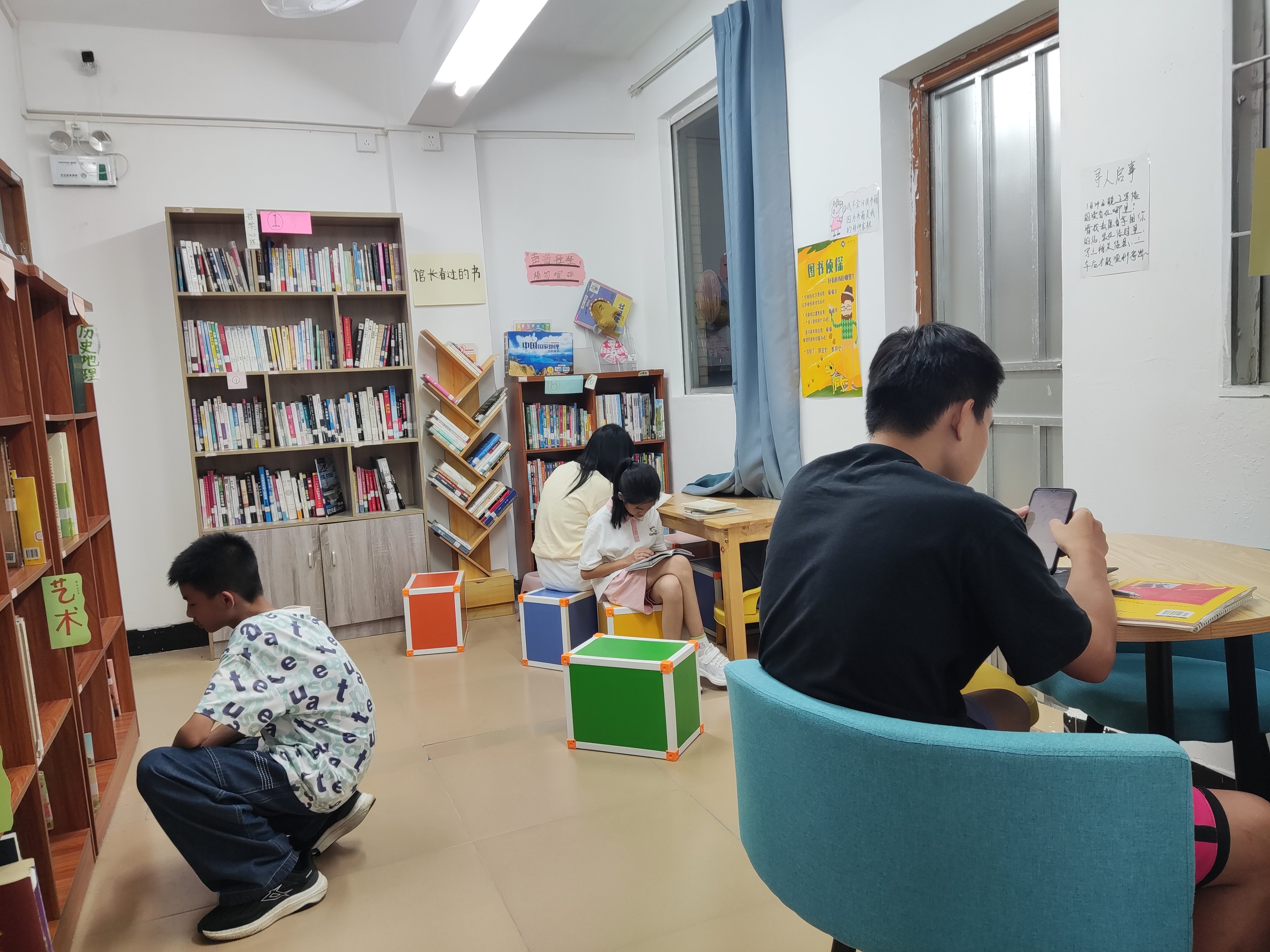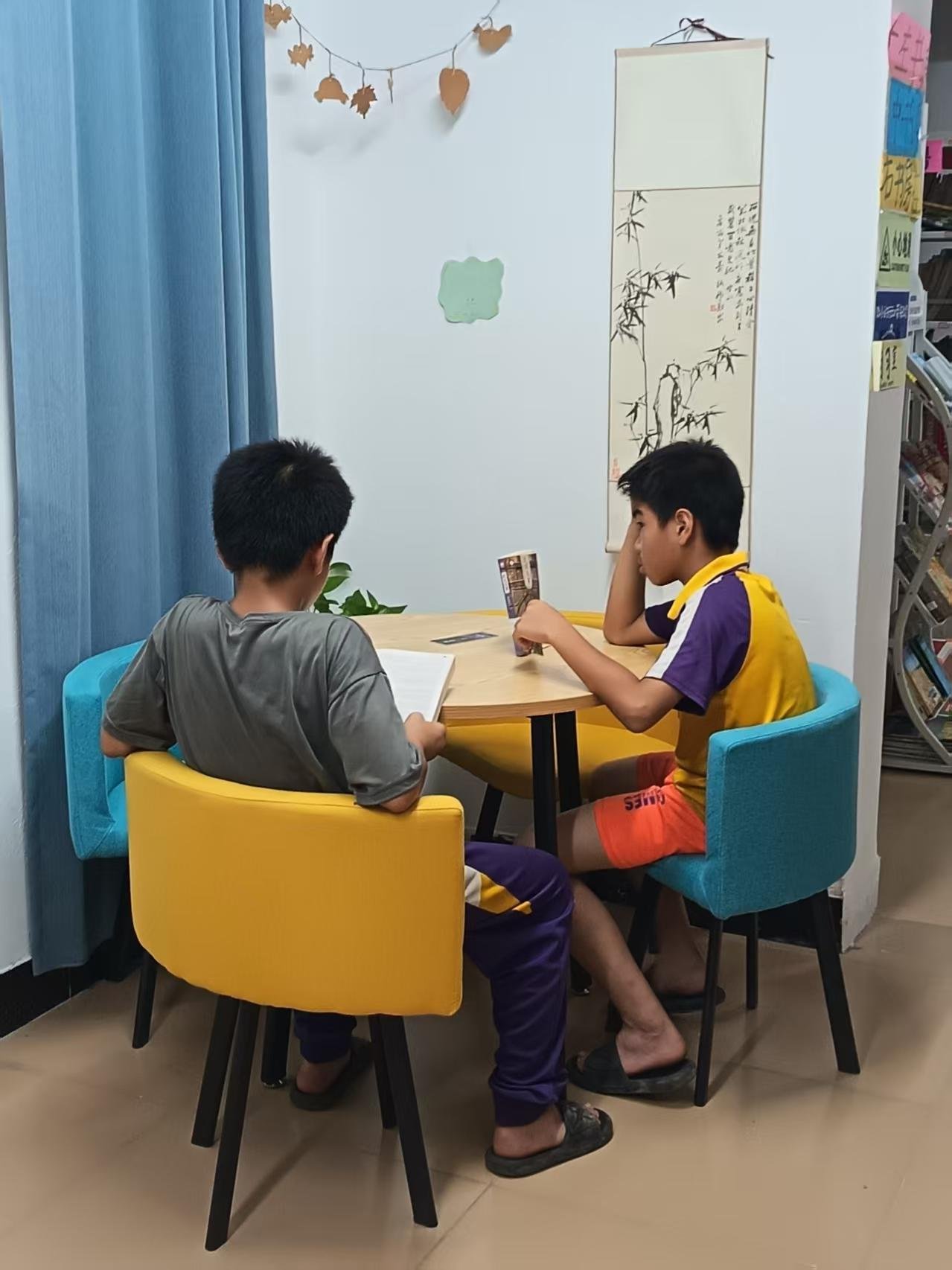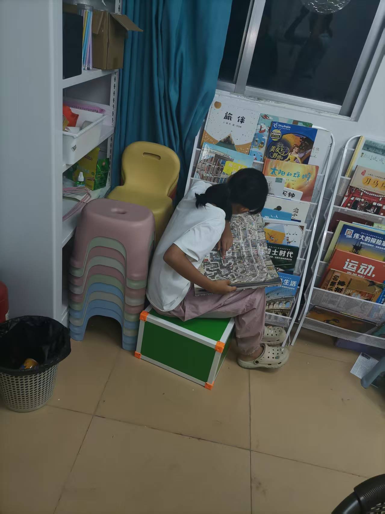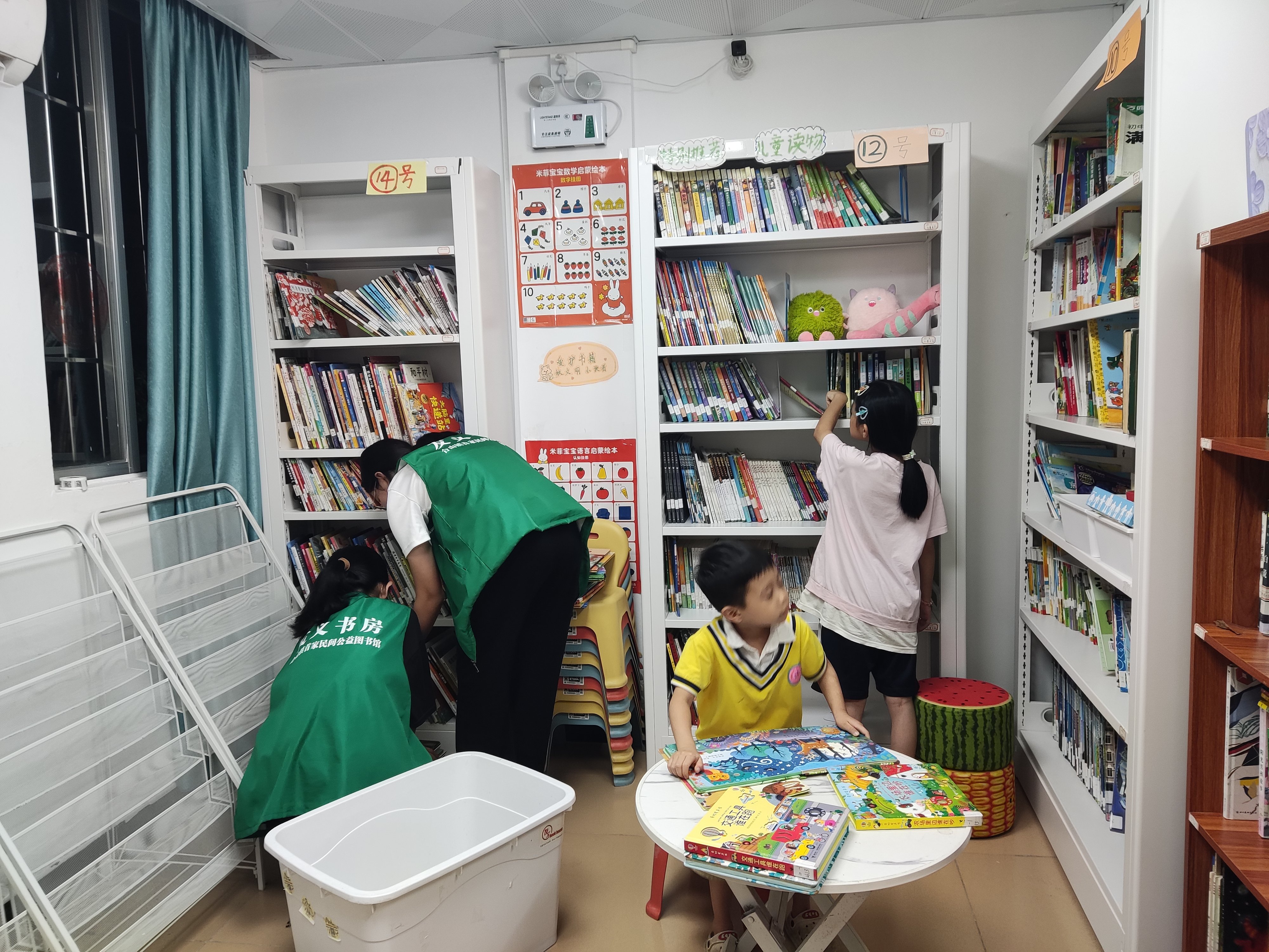 大桌子小椅子都是满满当当的身影,电脑桌前的高桌子前面都站着写字的呢。小哥哥小姐姐们结伴同行,看书、写作业、互动下棋,乐在其中…小小志愿者们忙里忙外整理书籍、打扫卫生…认真细致,点赞!