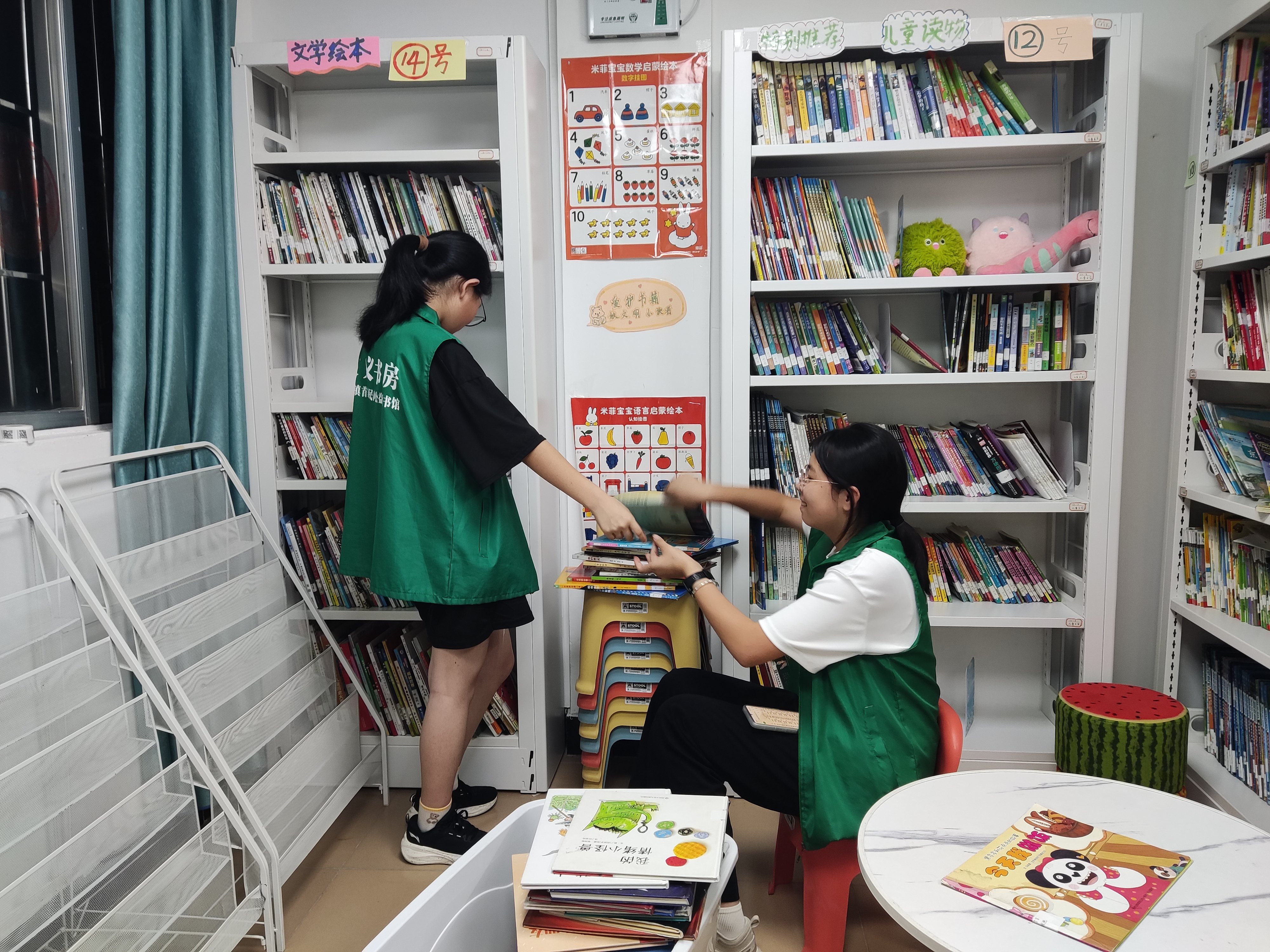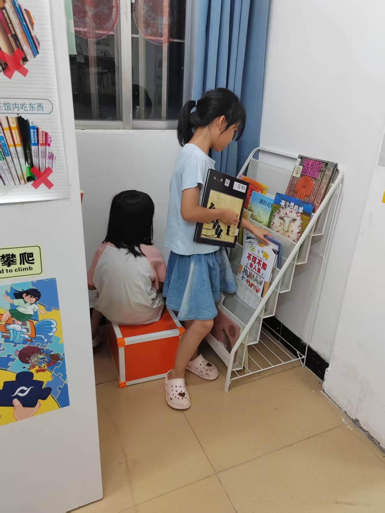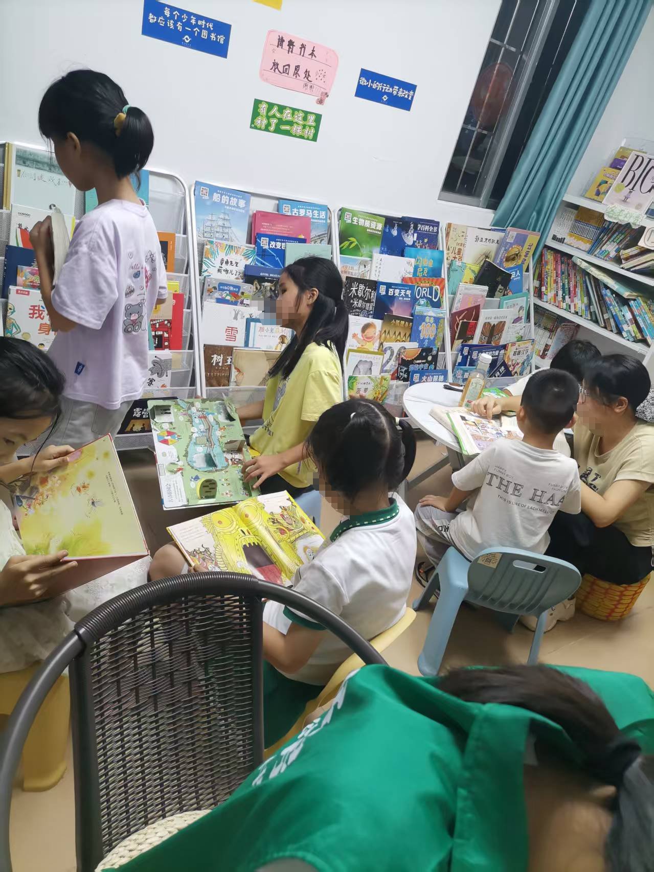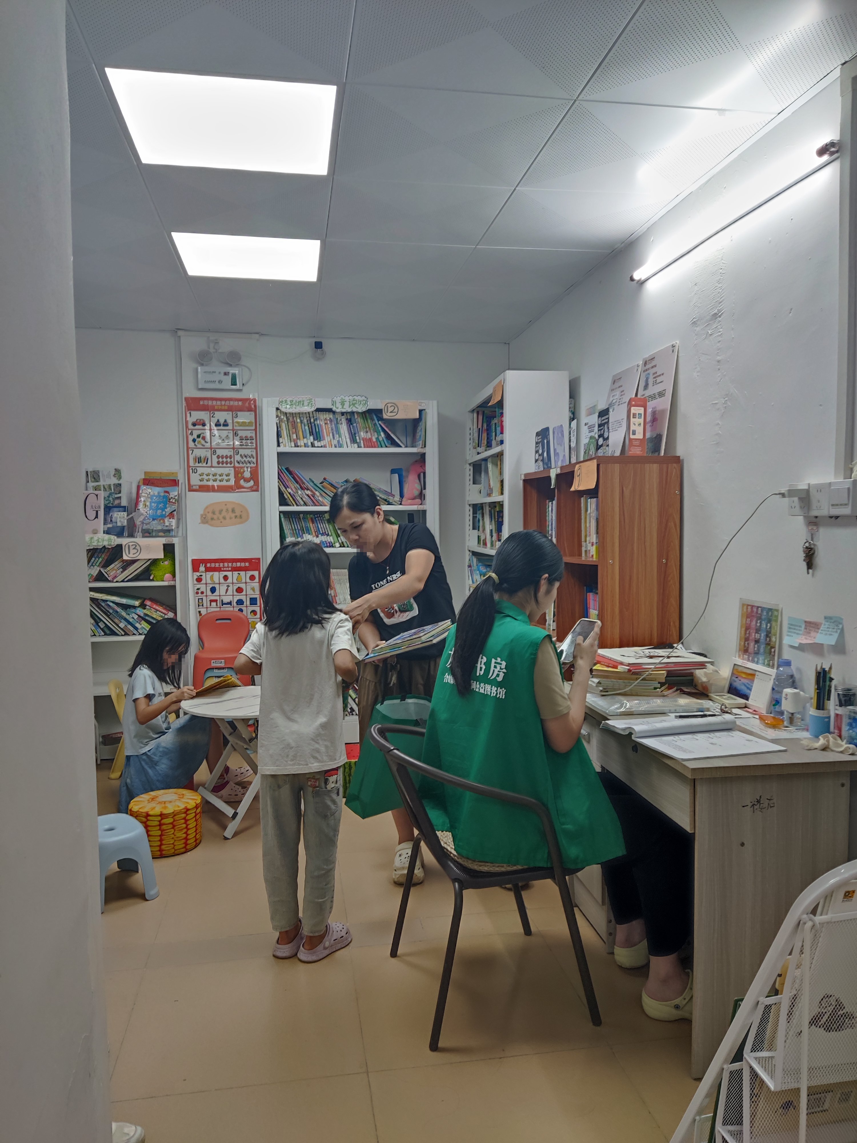 大桌子小椅子都是满满当当的身影,电脑桌前的高桌子前面都站着写字的呢。小哥哥小姐姐们结伴同行,看书、写作业、互动下棋,乐在其中…小小志愿者们忙里忙外整理书籍、打扫卫生…认真细致,点赞!