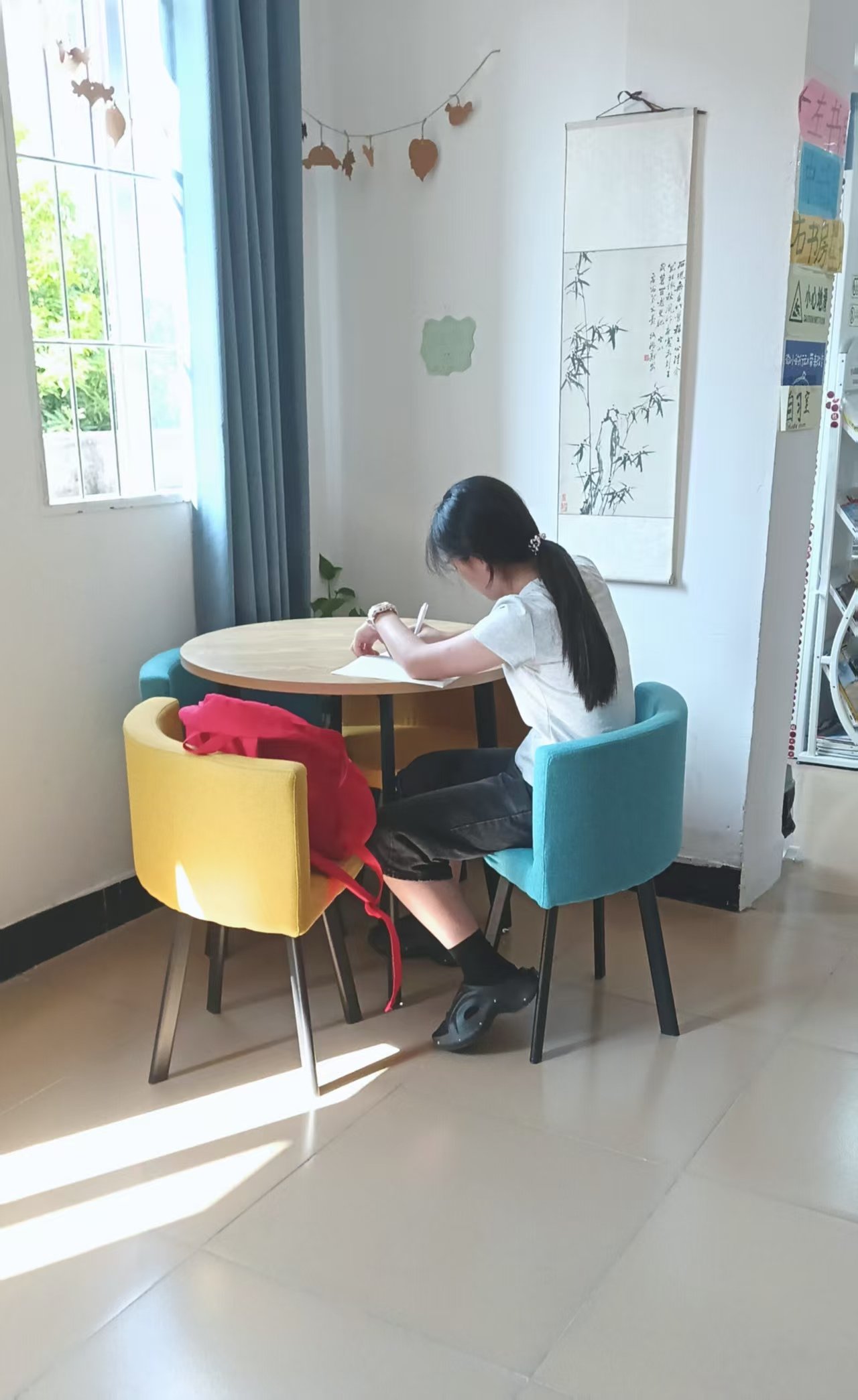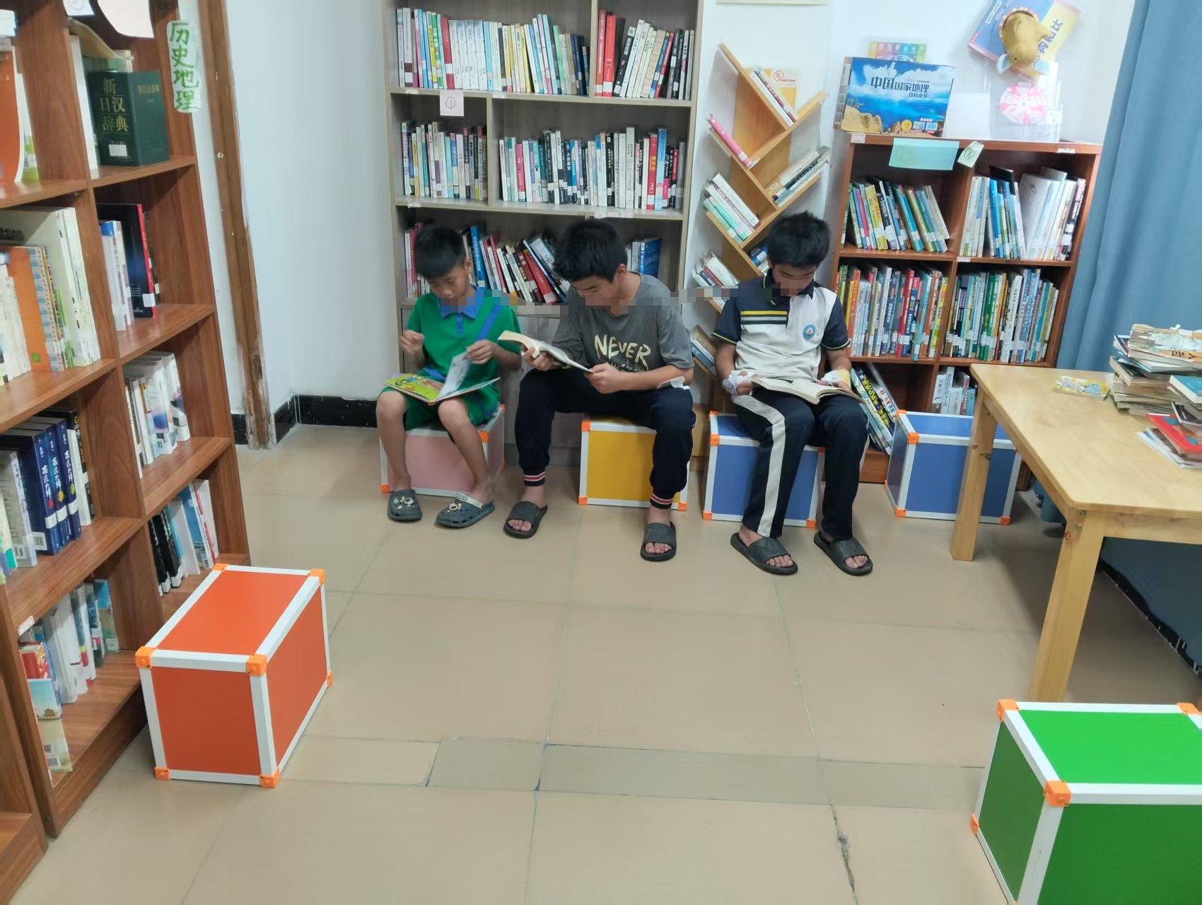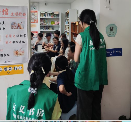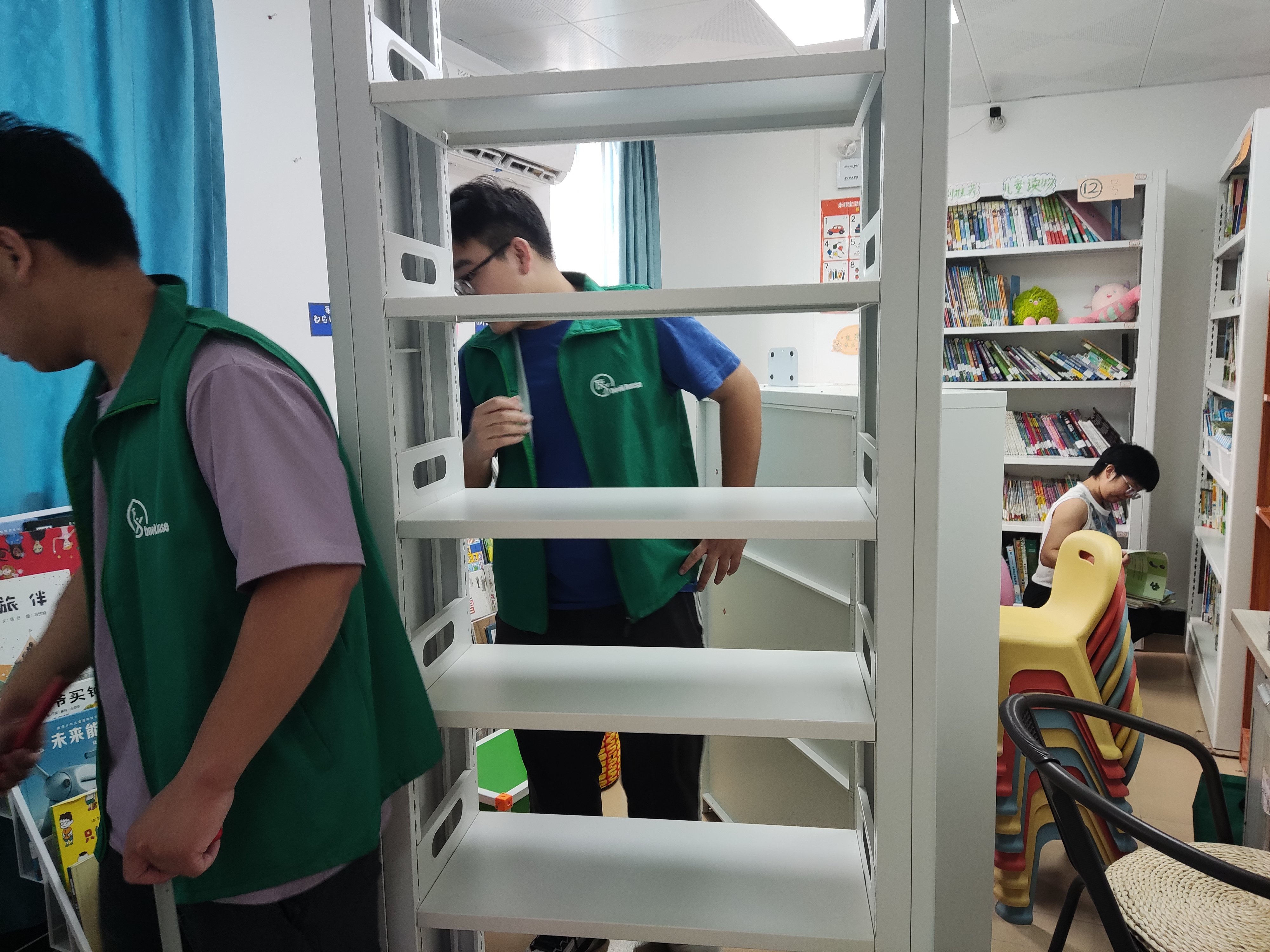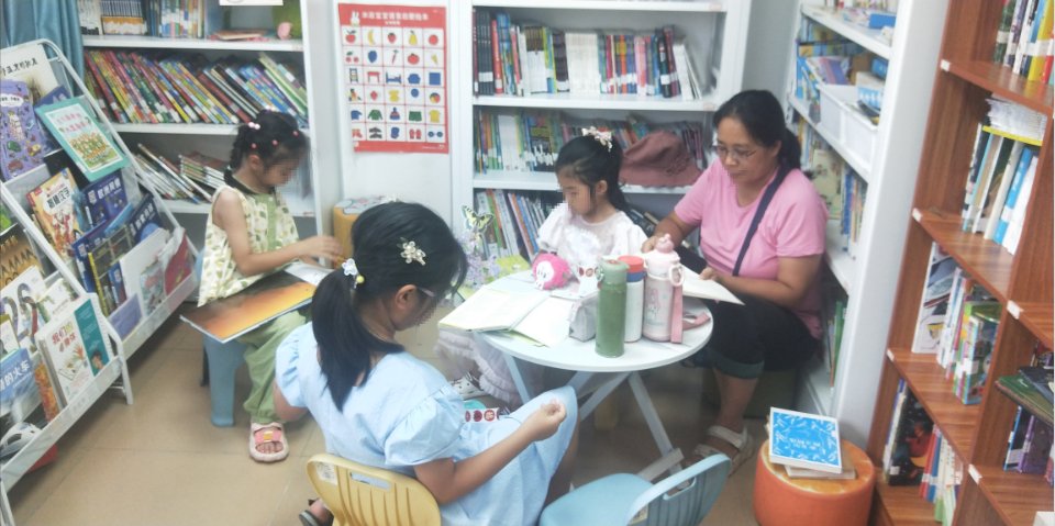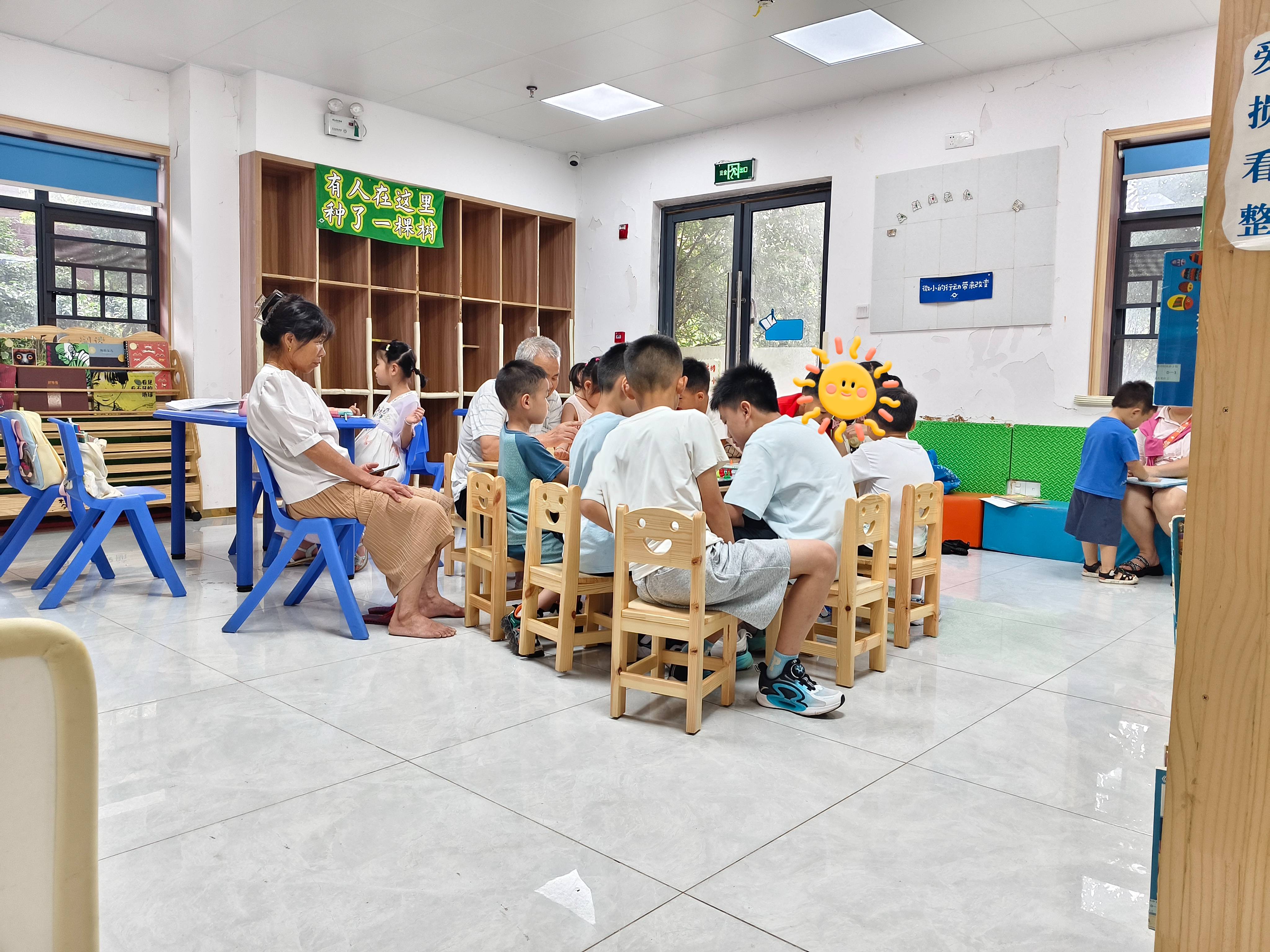 大桌子小椅子都是满满当当的身影,电脑桌前的高桌子前面都站着写字的呢。小哥哥小姐姐们结伴同行,看书、写作业、互动下棋,乐在其中…小小志愿者们忙里忙外整理书籍、打扫卫生…认真细致,点赞!
