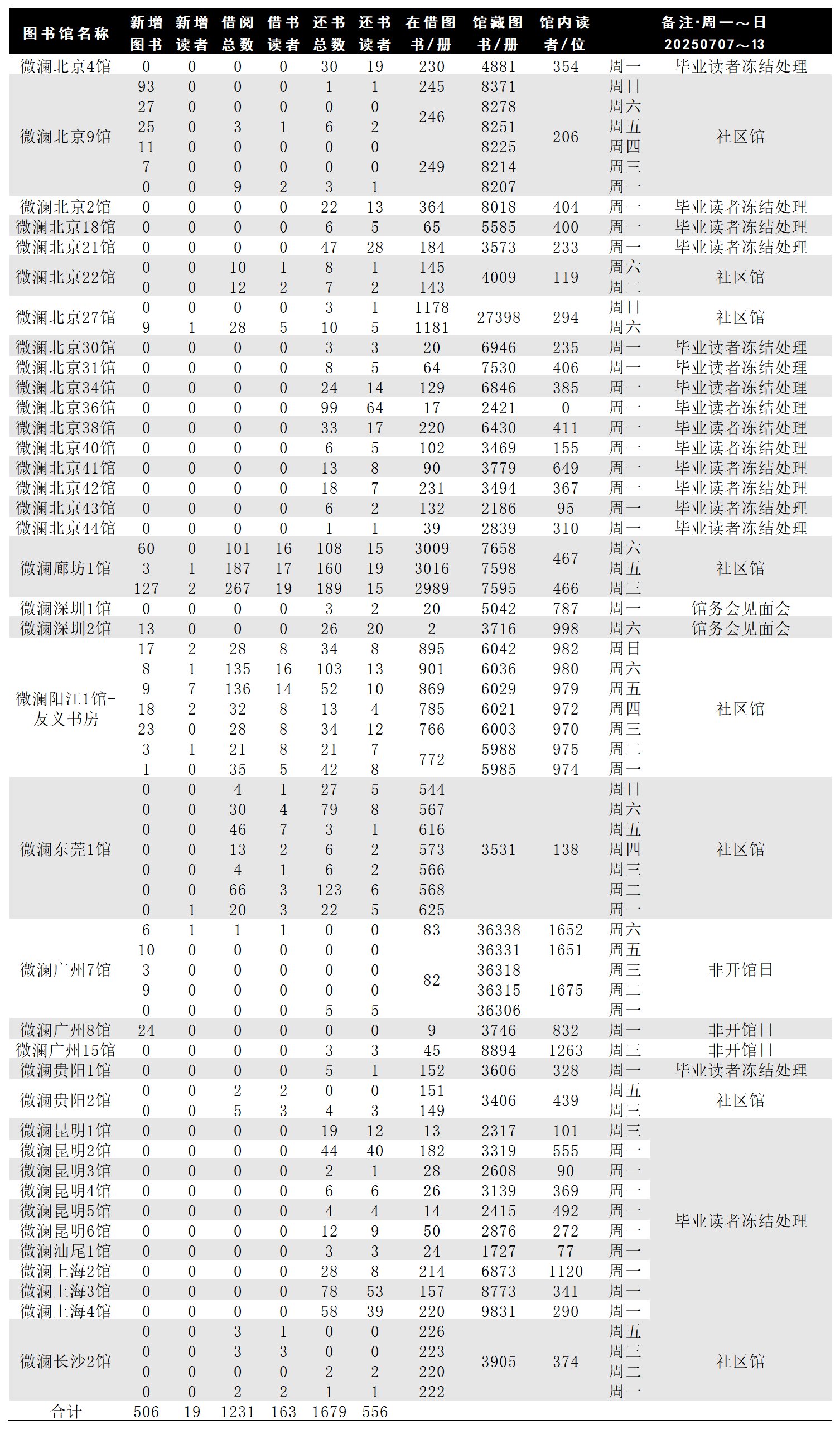 8家社区馆日常开放,为163位读者借阅图书1231册次,处理归还图1679册(556人,38个图书馆冻结毕业读者,其中575册为毕业冻结下架);购买/受捐/学校馆藏等录入上架图书506册,新增读者19位。