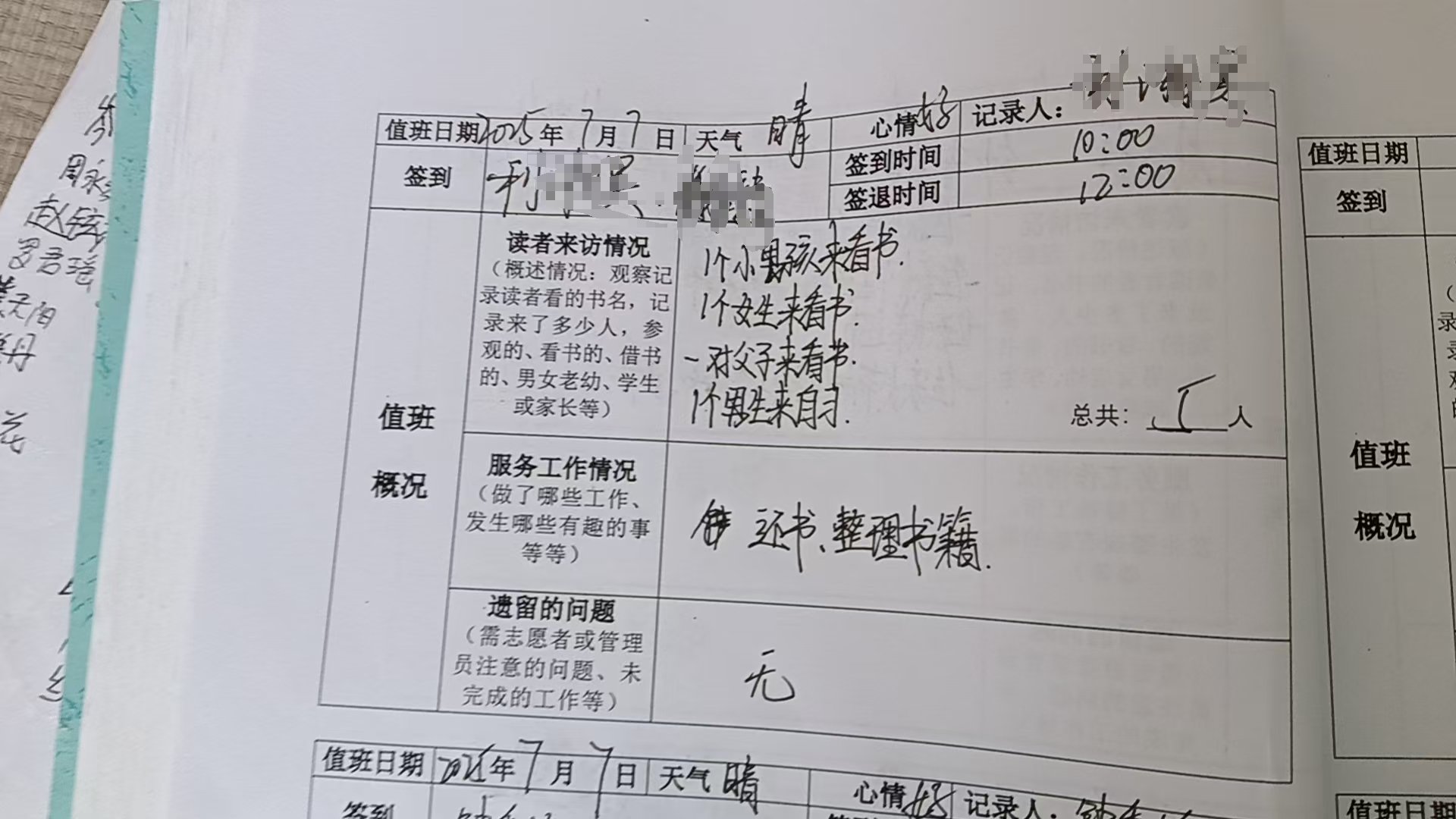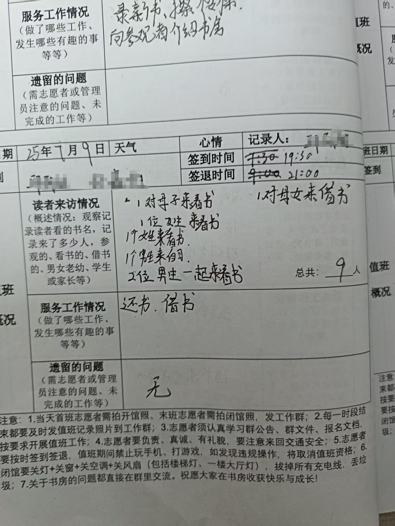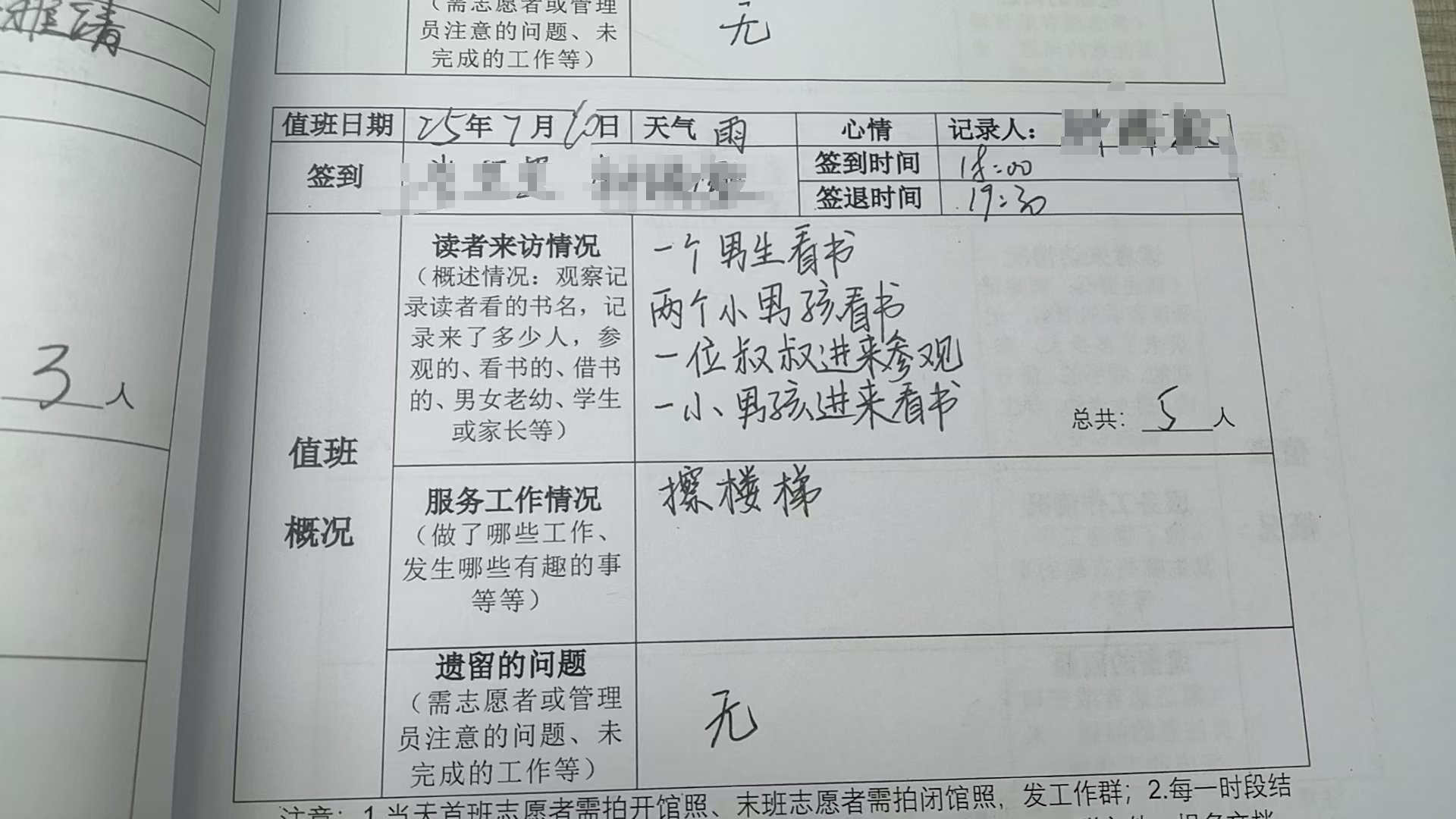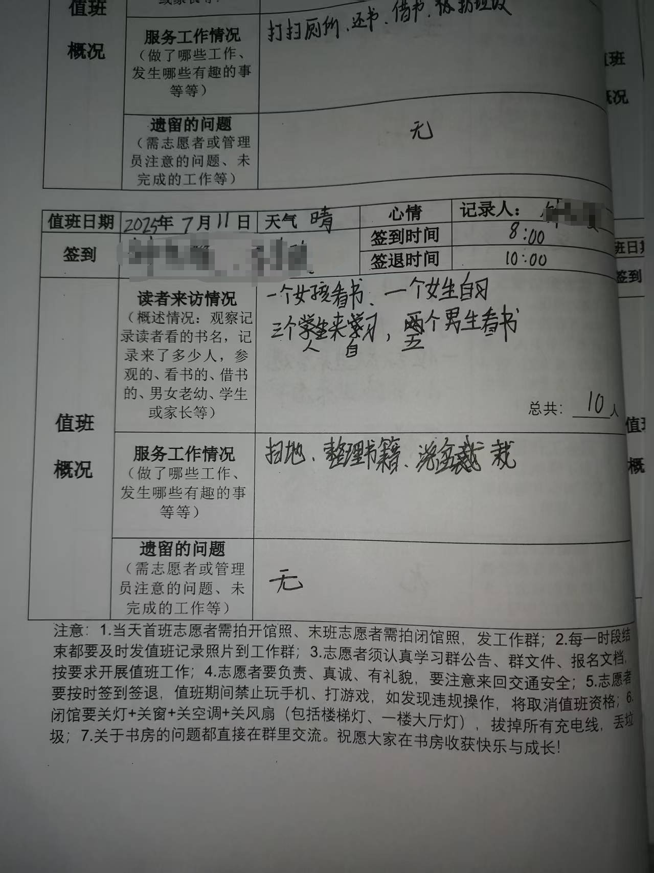 日常开馆服务,一开始开了空调,后来有风,就大厅门和侧门打开,有对流的风,一晚上还好。来借阅不少,有些孩子要回老家,来归还了不少书,部分为超期,没有借阅.