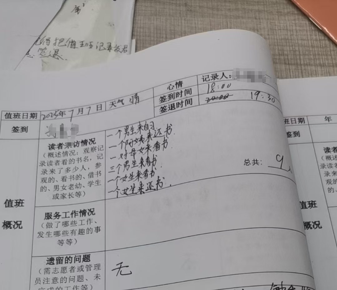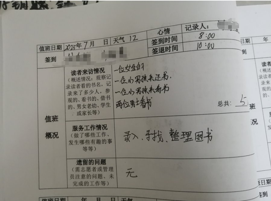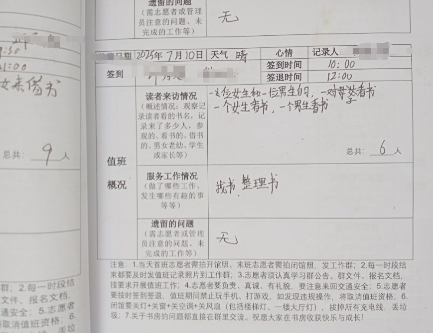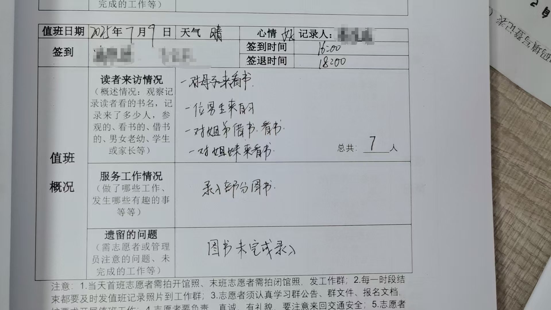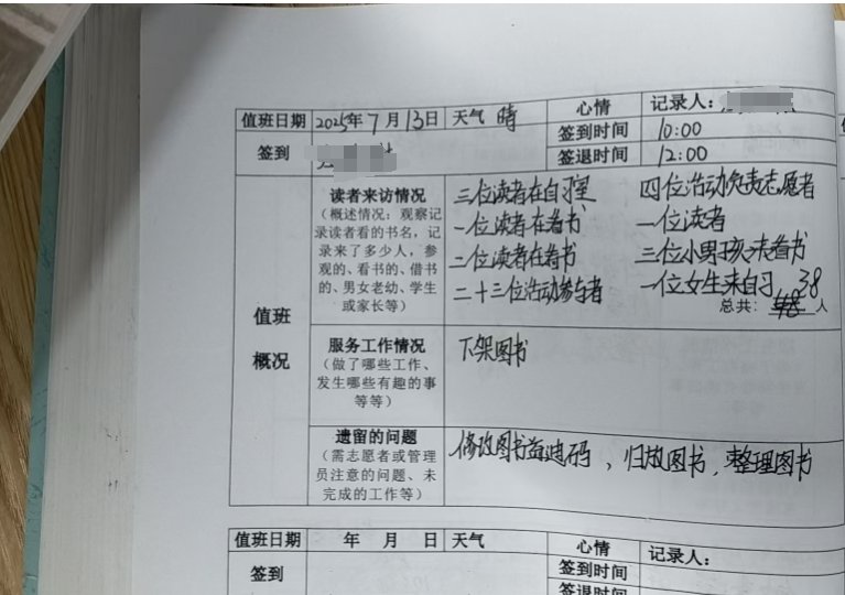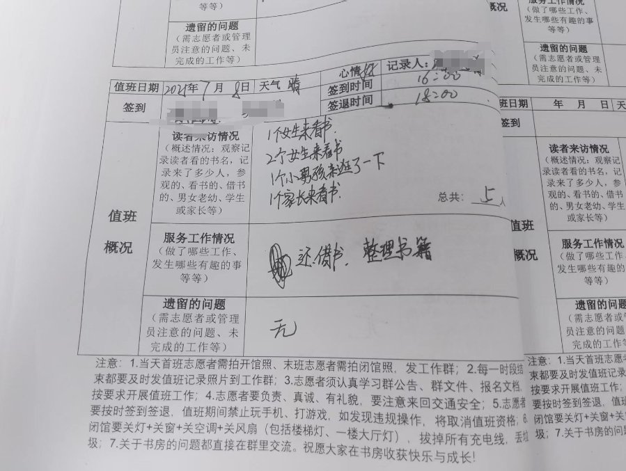 日常开馆服务,一开始开了空调,后来有风,就大厅门和侧门打开,有对流的风,一晚上还好。来借阅不少,有些孩子要回老家,来归还了不少书,部分为超期,没有借阅.