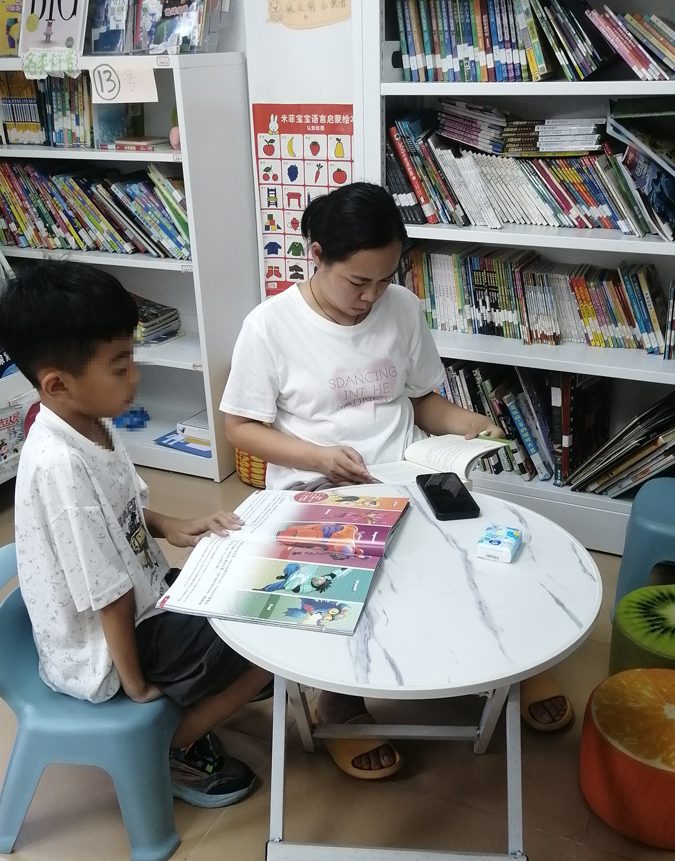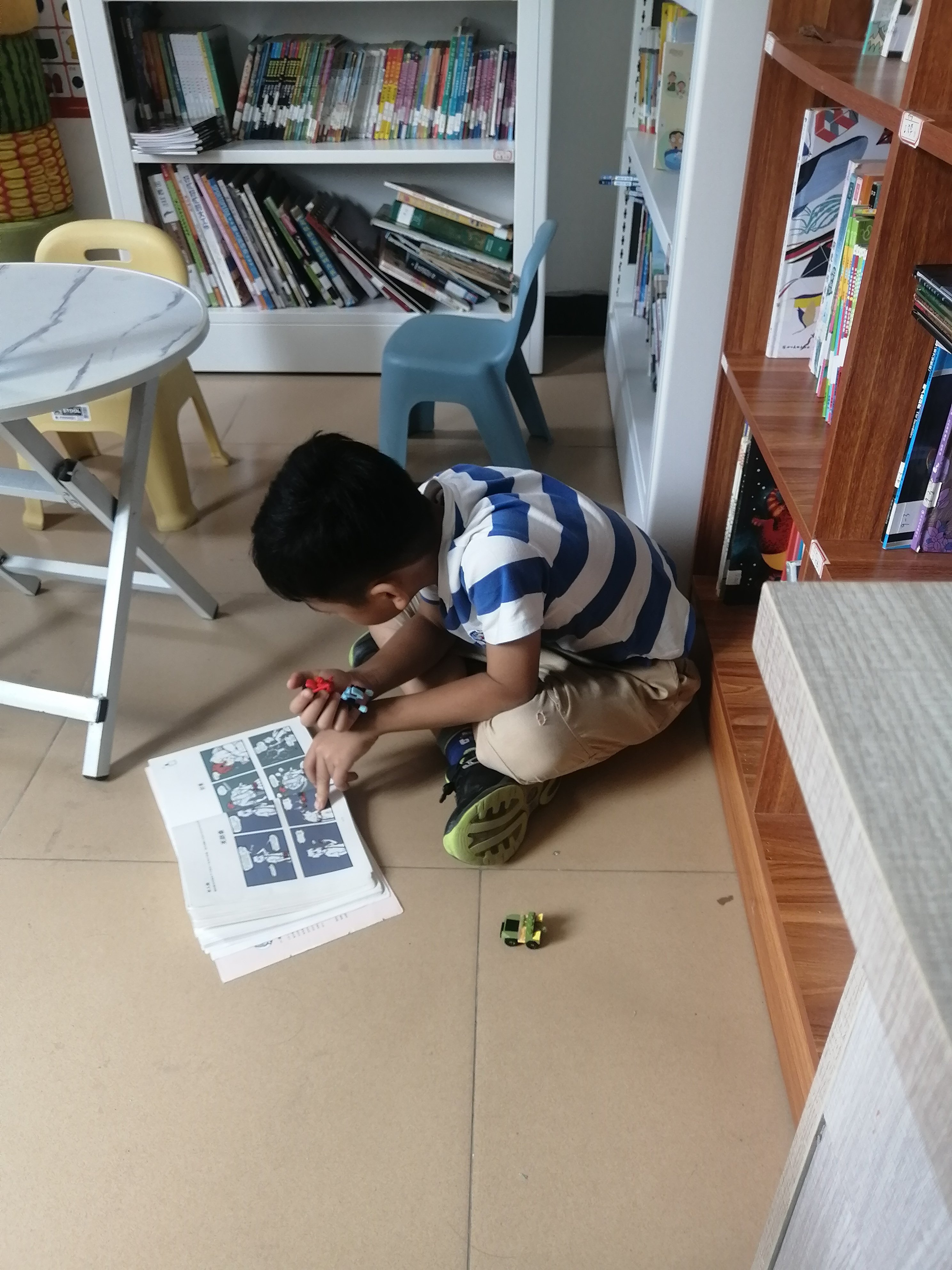 稚嫩的声音传来:大恐龙它干什么呢?要上去吗?寻声望去:原来是绘本架旁有一对亲子互动共读绘本,2岁8个月的小男孩听的很投入,边听边动脑筋思考,和妈妈不停地表达自己的想法,可以给妈妈讲故事,看到妈妈满眼都是爱意和开心,真的好!