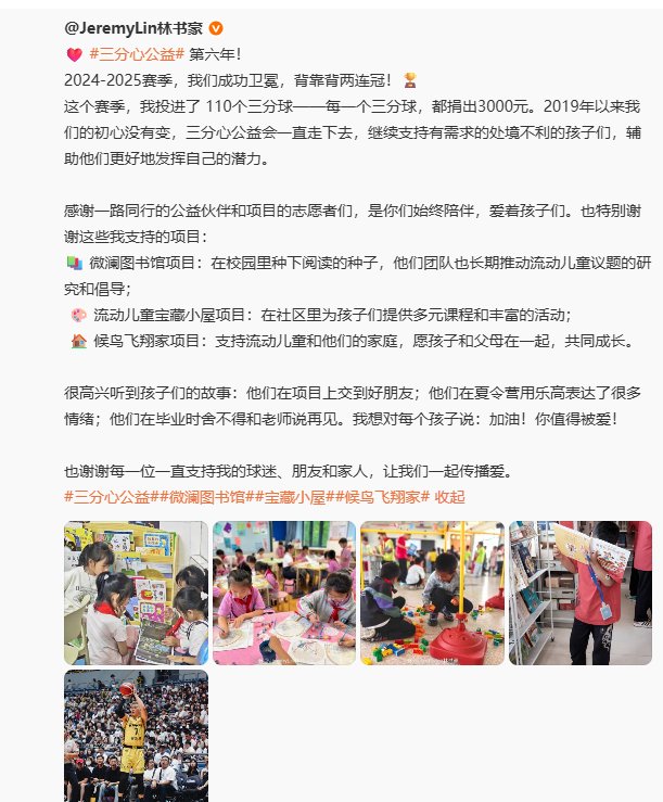 7月11日,林书豪发布2024-2025赛季三分心成绩,他个人投进110三分球,每一个三分球,都捐出3000元。也同步公布了此次三分心公益将支持的项目,微澜图书馆也是自2019年三分心公益启动六年来,第三次获得三分心的支持。