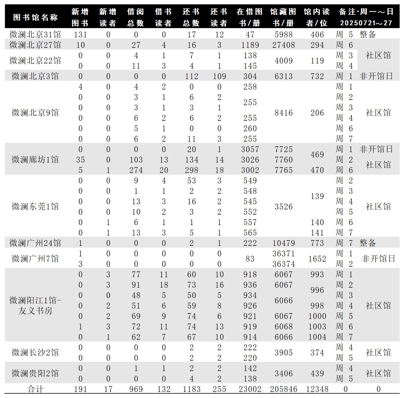 北京31馆、广州24馆整备优化图书分类,8家社区馆日常开放,为132位读者借阅图书969册次,处理归还图1183册(255人,含北京3馆毕业读者处理归还下架);各馆购买/受捐/学校馆藏等录入上架图书191册,新增读者17位。