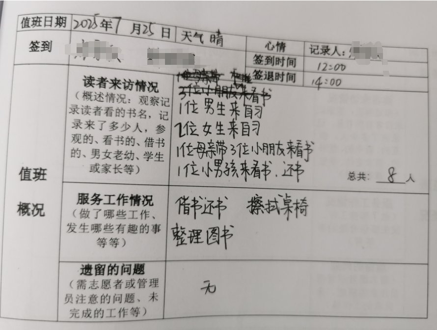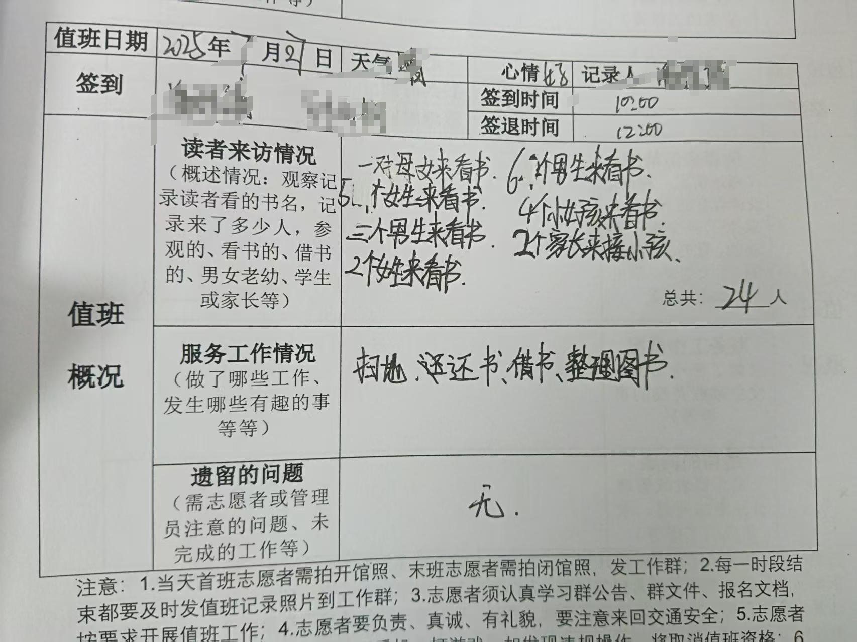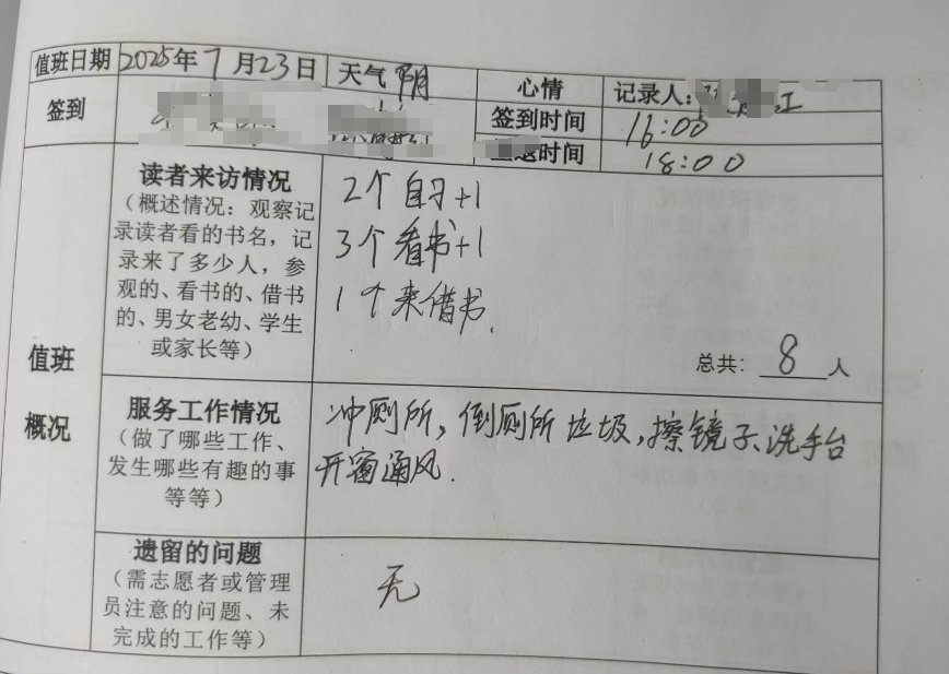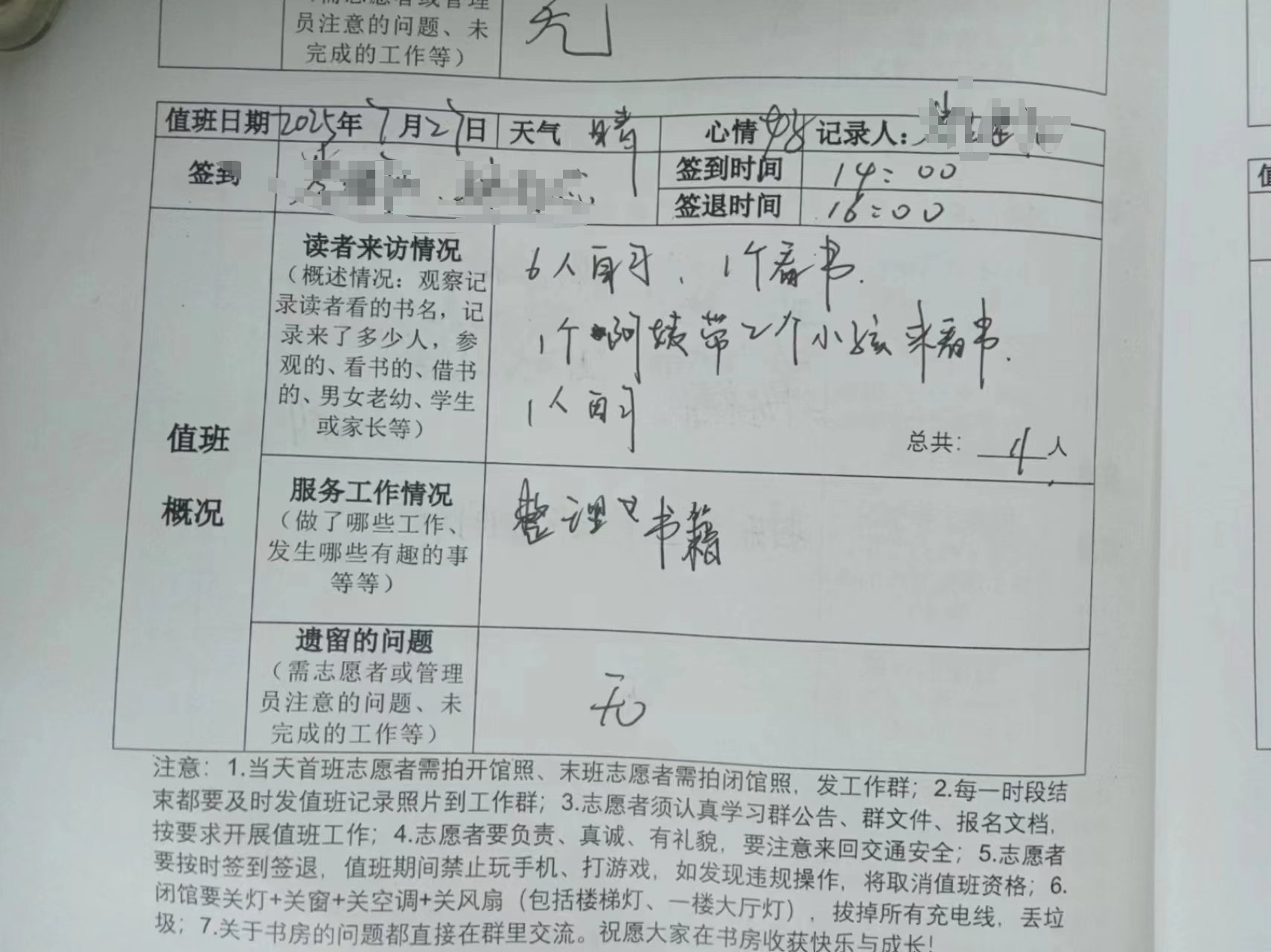 之前也一直有点小想法,书房志愿者工作手册又需要更新了,但总是忘记修改。昨天也终于修改了一下,所以说书房志愿者也不容易,整个手册有8000+字数,而志愿者中很多还是初中生,他们需要自主学习工作手册再报名参加值班,而暑假以来,相信自主学习手册的志愿者比例有所上升。毕竟从大家在工作群里的交流就看得出来谁看了手册、谁没看。志愿者招募工作换人以来,也一直和喵喵交流相关的事项,把一些疑问抛给工作手册,也减少了密切相关的几位管理员的工作强度。上半年以来,志愿者招募、考勤发码、志愿者录用这三个维持有序开关的管理员特别稳定发挥,书房开馆也有稳定的保障。到暑假至今,书房的开馆工作还是挺平稳顺利的。
