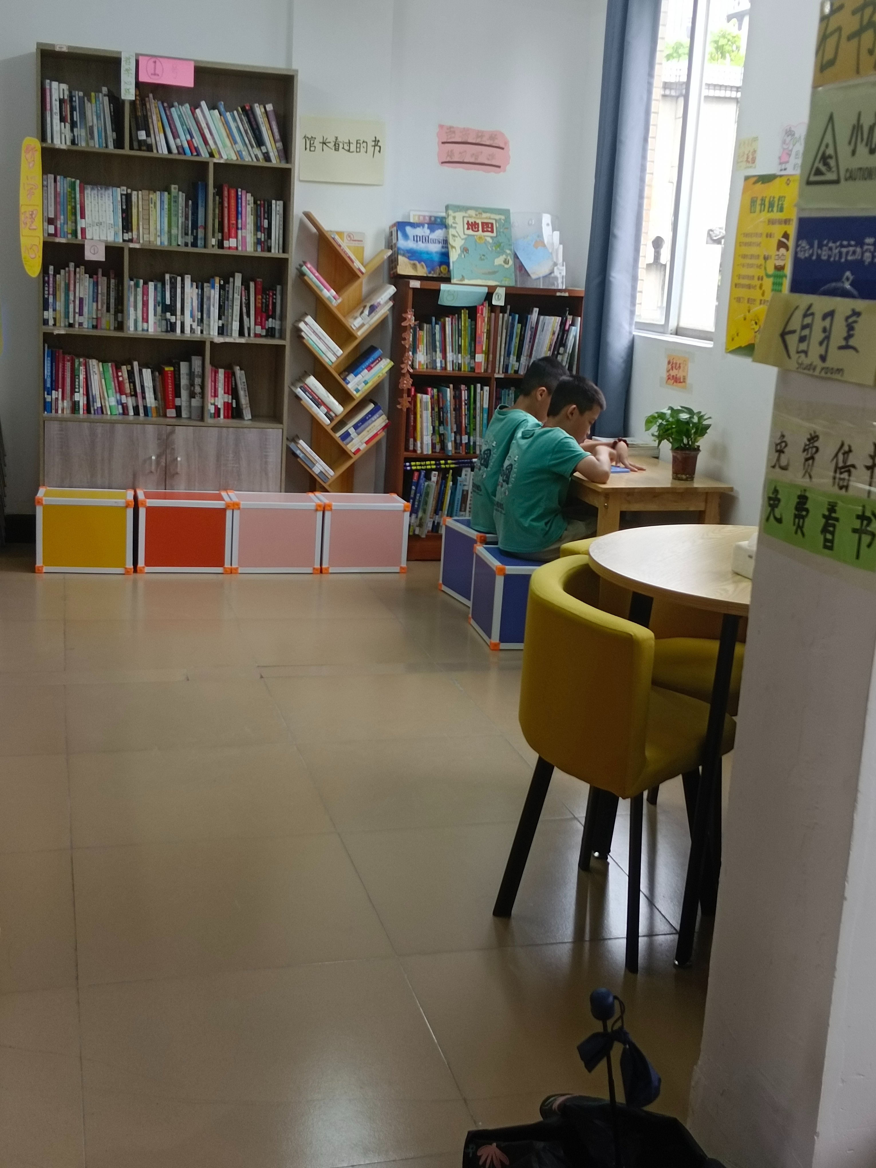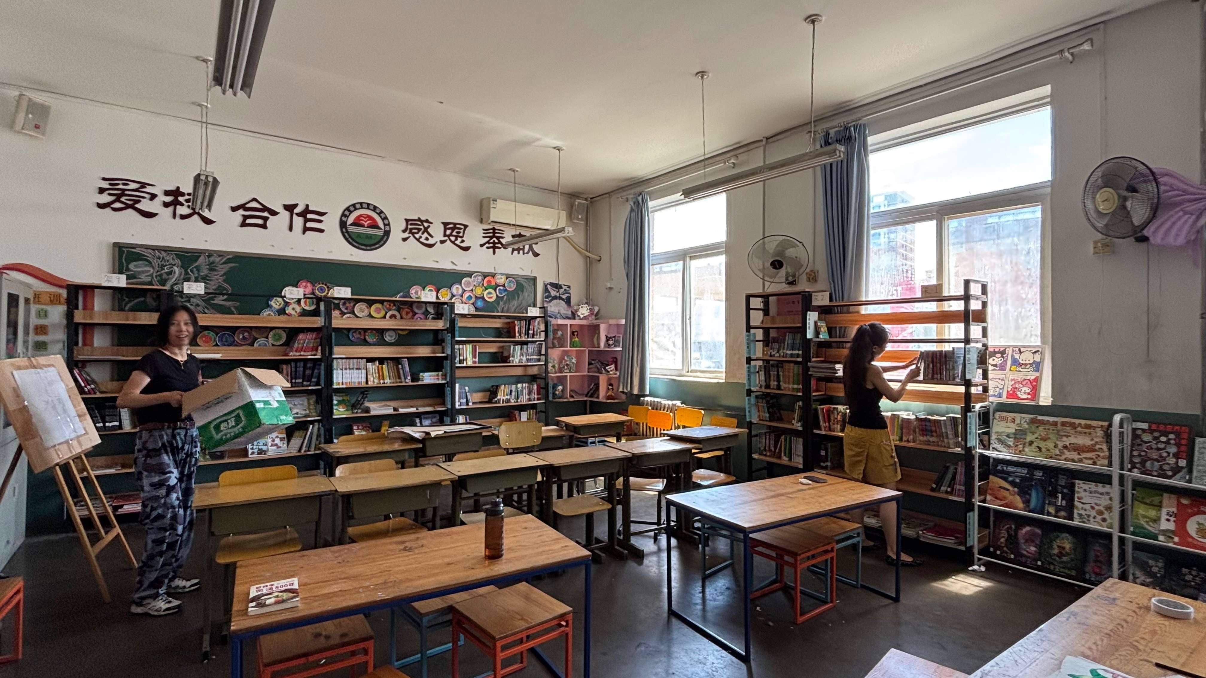 学校把教学楼二楼一间美术社团活动室提供给图书馆共享。之前伙伴们已经把36馆撤过来的书架搬到位,今天yh、xn、xw和我去固定、清洁、填空,一间图书馆的模样有啦!
