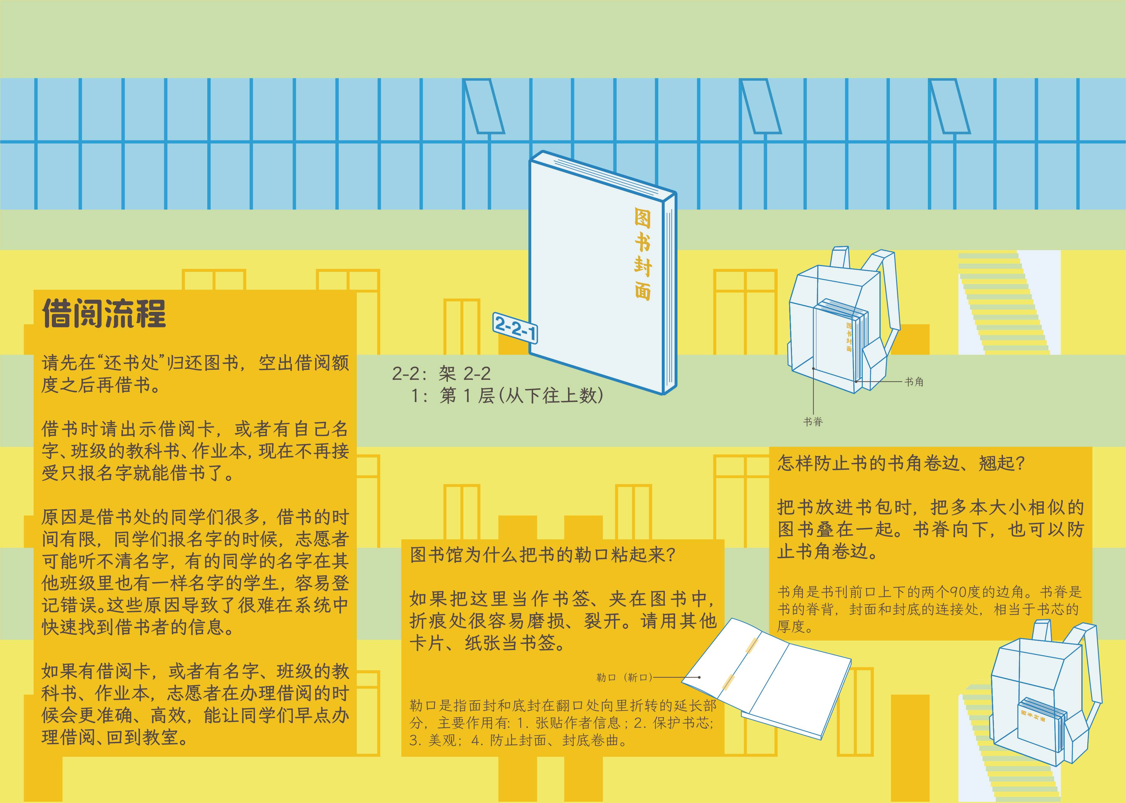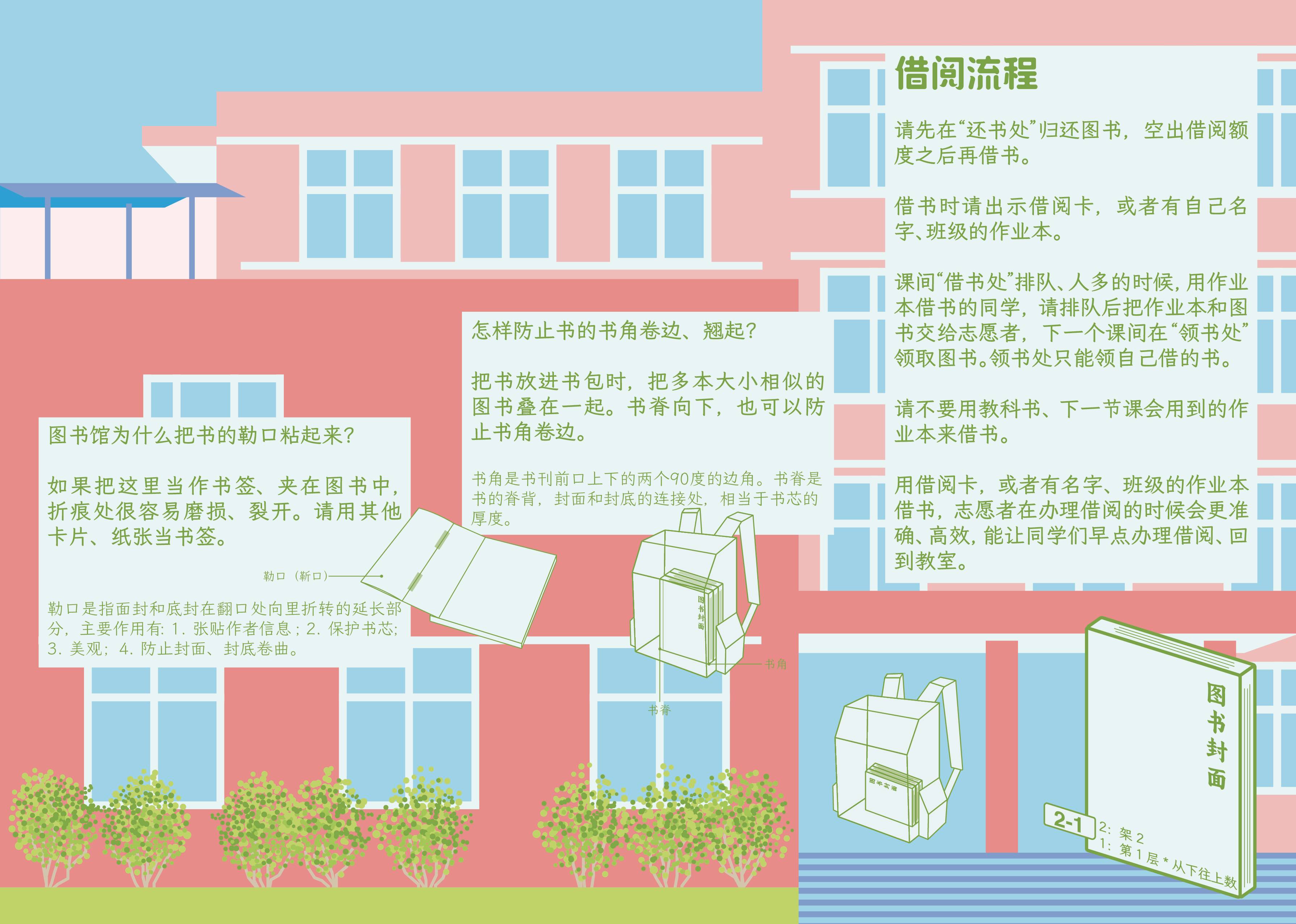 (原因是借书处的同学们很多,借书的时间有限,同学们报名字的时候,志愿者可能听不清名字,有的同学的名字在其他班级里也有一样名字的学生,容易登记错误。这些原因导致了很难在系统中快速找到借书者的信息。如果有借阅卡,或者有名字、班级的教科书、作业本,志愿者在办理借阅的时候会更准确、高效,能让同学们早点办理借阅、回到教室。)看见还有空间,暂时把“图书馆为什么把书的勒口粘起来?”“怎样防止书的书角卷边、翘起?”也贴了上去。其实主要是想把1馆那栋楼的建筑描下来作为背景图,终于借机用最原始的办法描下来了(在 ai 上一点点堆几何色块)。