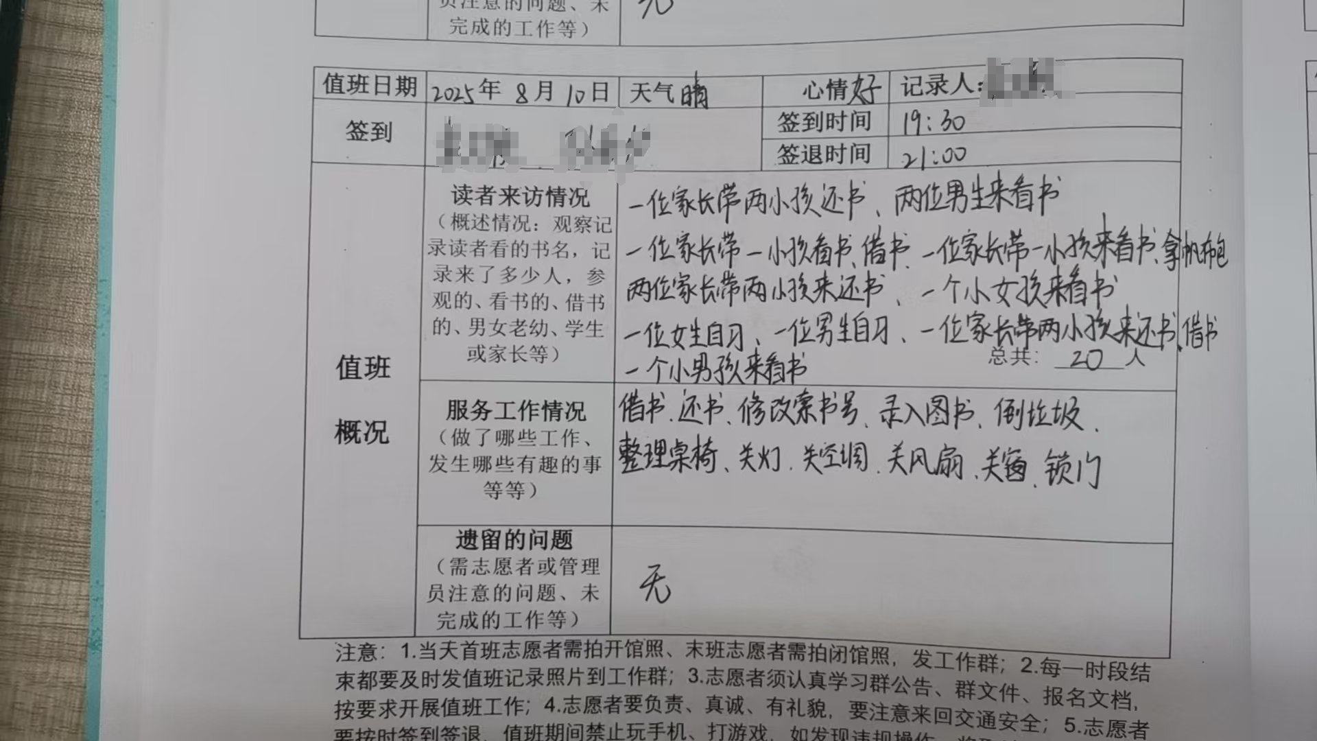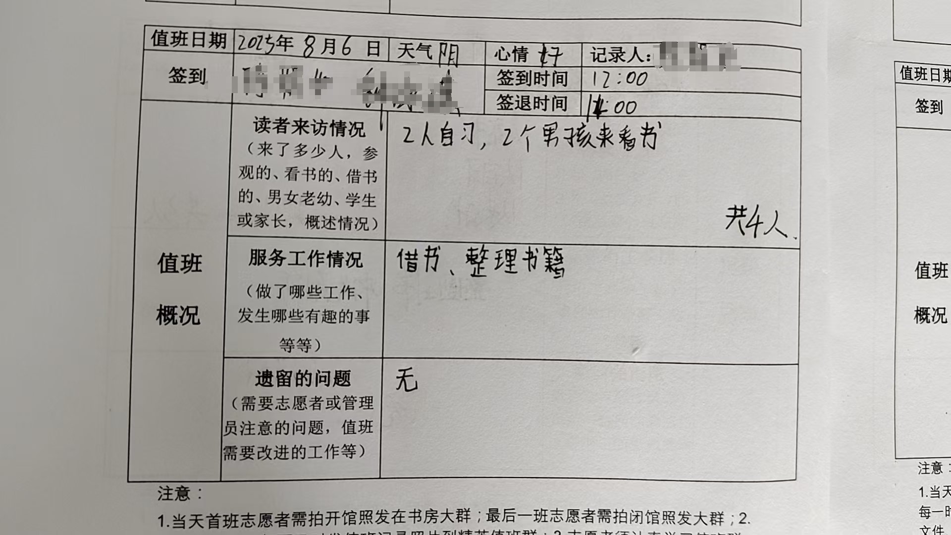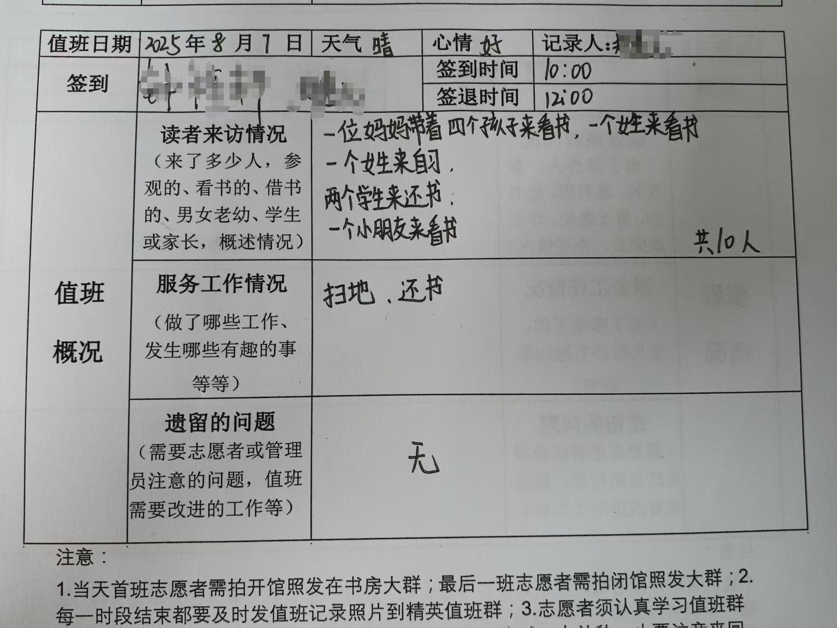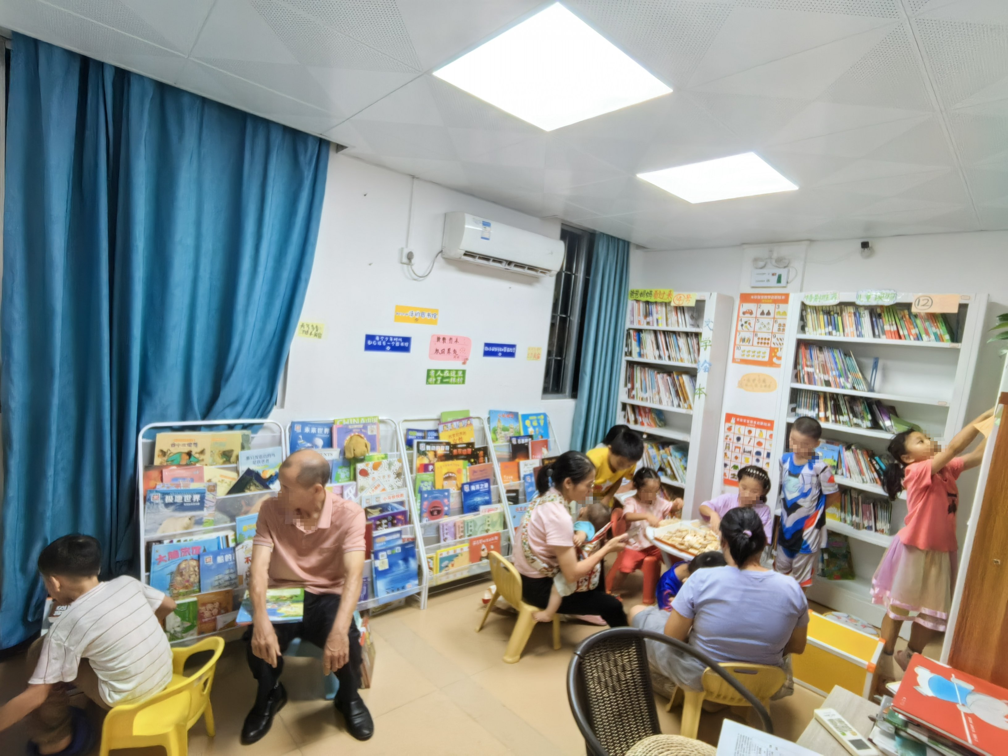 一开始不算太忙,但人慢慢多起来,瑶瑶和鑫彤帮忙借还,人一多,我基本就是借还,和大家的互动少了。好在家长们也都很熟悉,快傍晚,大家离开。晚上依然人多。