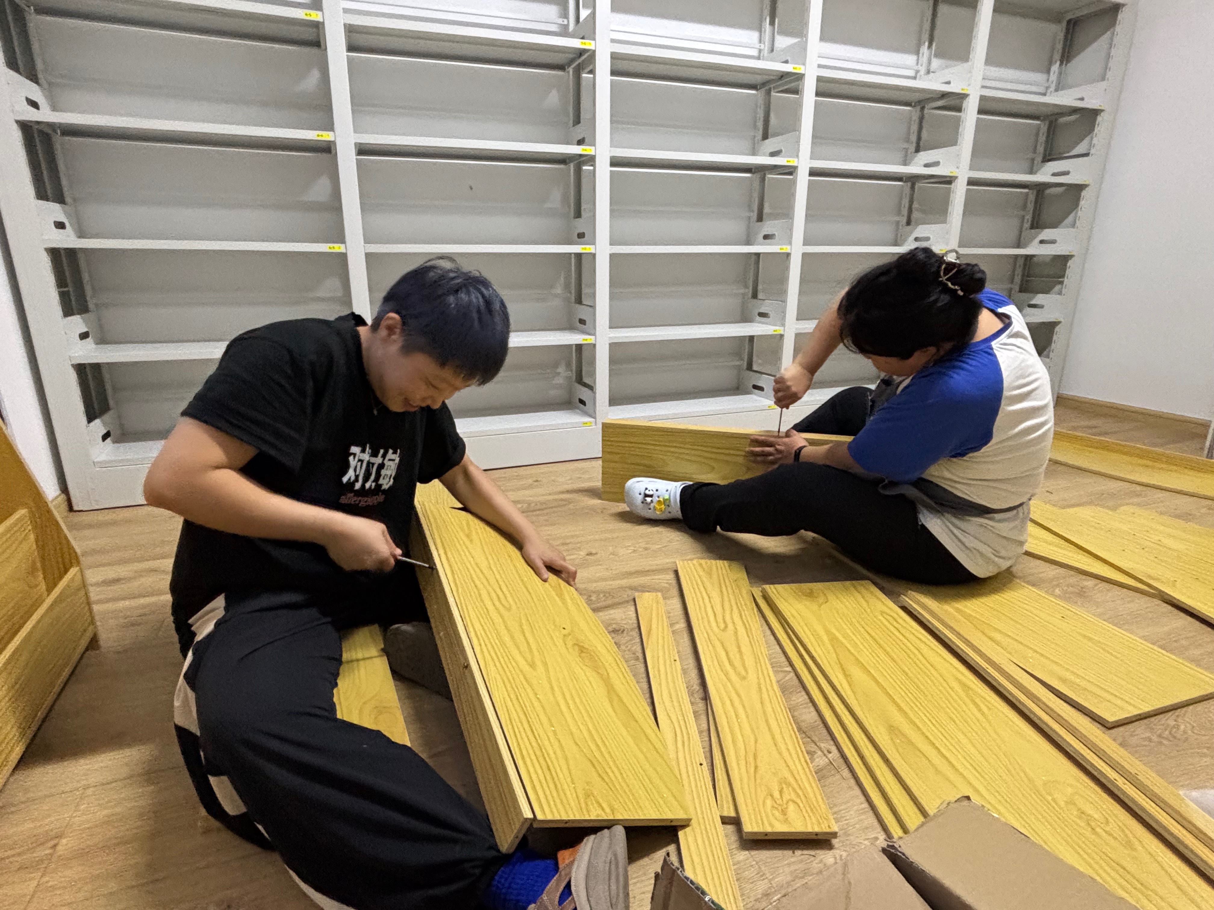 我们先把书挪到走廊,然后开始拆箱组装书架。铁架比较容易,难在木架。毅桦和雨辰边看视频教程边琢磨,我这个手残党主要当个下手。商家配的“一次性”螺丝刀用到一半就开始滑扣,只好下死力连挤压带拧,等全部完成,手掌心都红肿了。