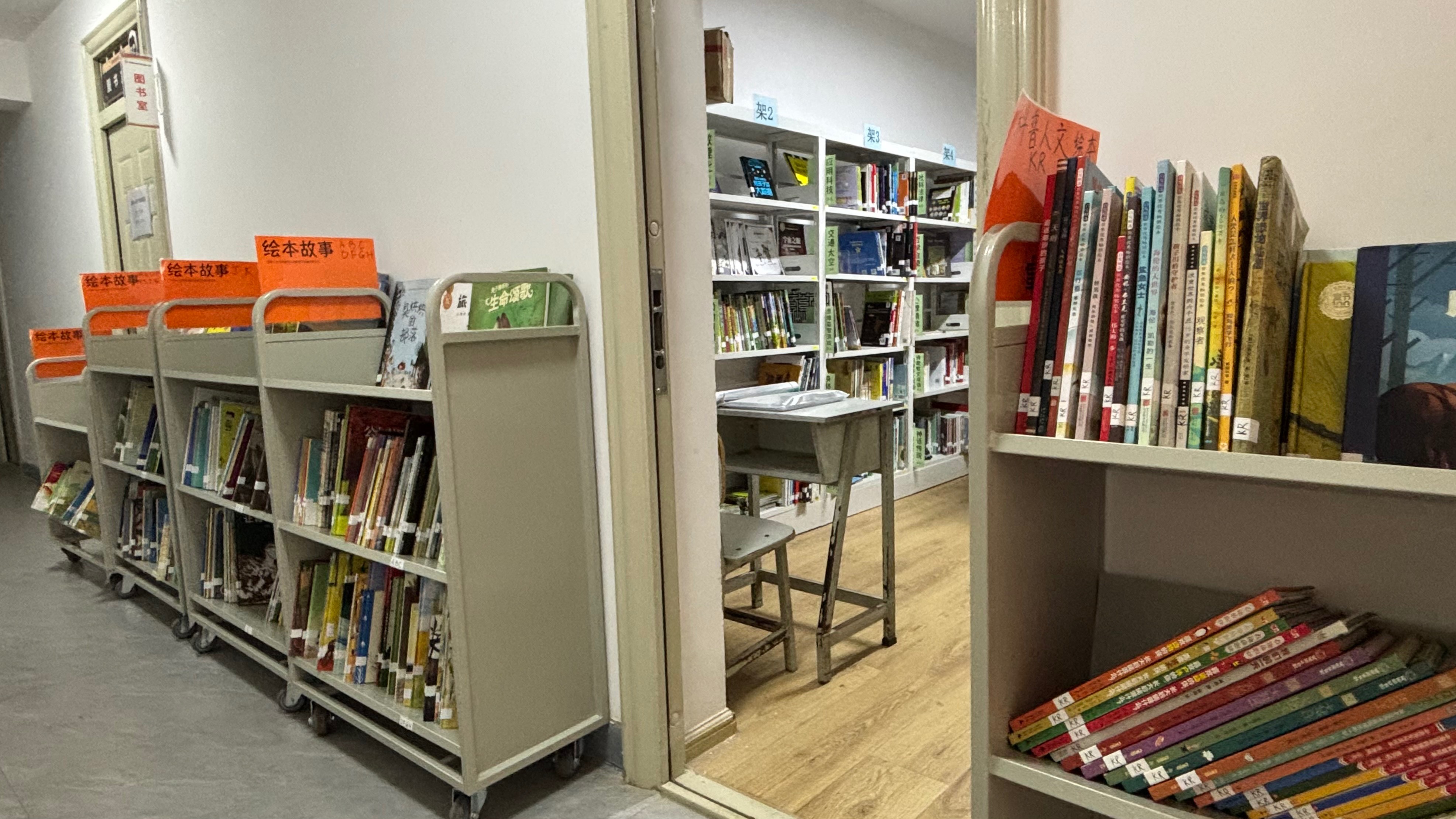 1馆新近刚搬到现在的学校。小小的房间里堆满了搬过来的书和新买的书架。