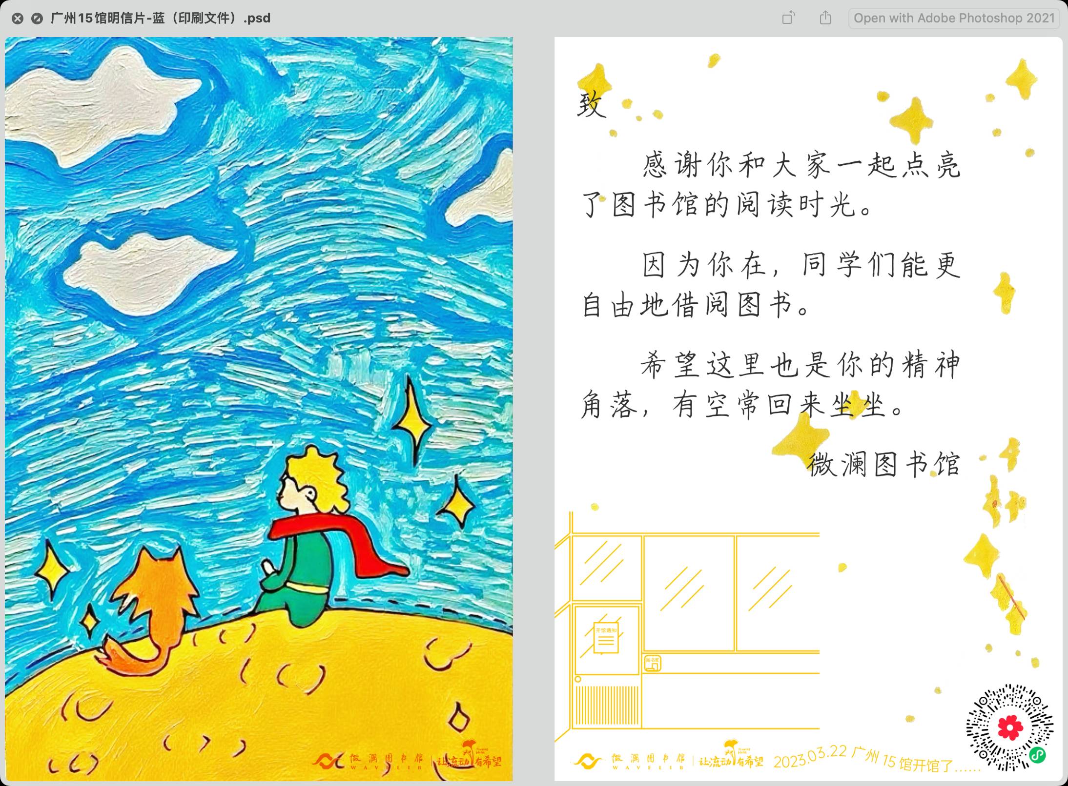 接杰西的任务清单,把广州15馆的“毕业纪念卡”改了改,改了一版“读者留念”卡,因为有的同学可能中途转学离开,不算是正式毕业。新放了腾讯公益的小程序码,和15馆的简笔画(之前用PPT描的,印卡的精度要求比较高,这次重新用ai描了矢量图版本的)。又根据杰西给的两张同学们画的《小王子》书签图,改了两版给志愿者留作纪念的明信片。本来想做书签的,但书签的比例太窄,放不下同学们的图画的全部,就还是改成了明信片……查看更多