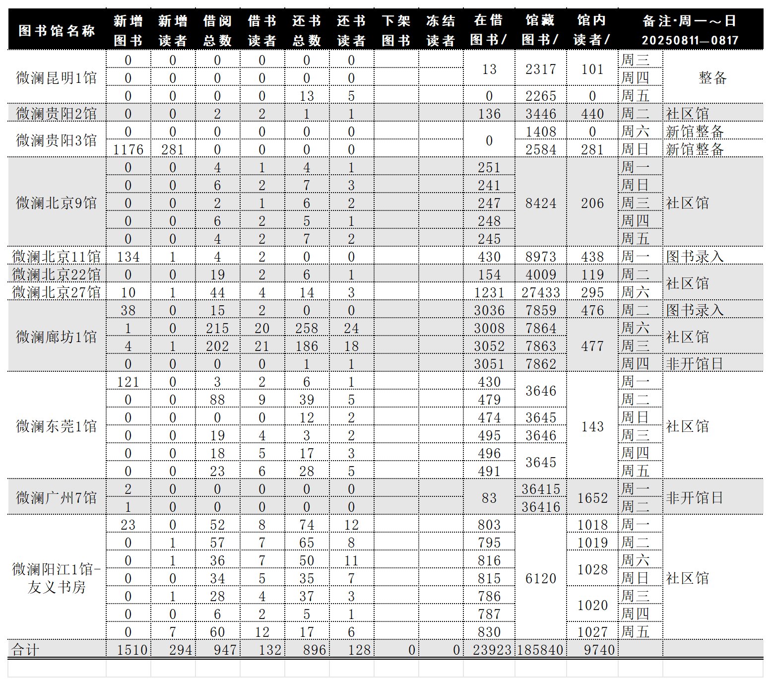 昆明1馆(新)、贵阳3馆整备,深圳市集线下推广义卖,7家社区馆日常开放,为132位读者借阅图书947册次,处理归还图896册(128人);各馆购买/受捐/学校馆藏等录入上架图书1510册,新增读者294位。
