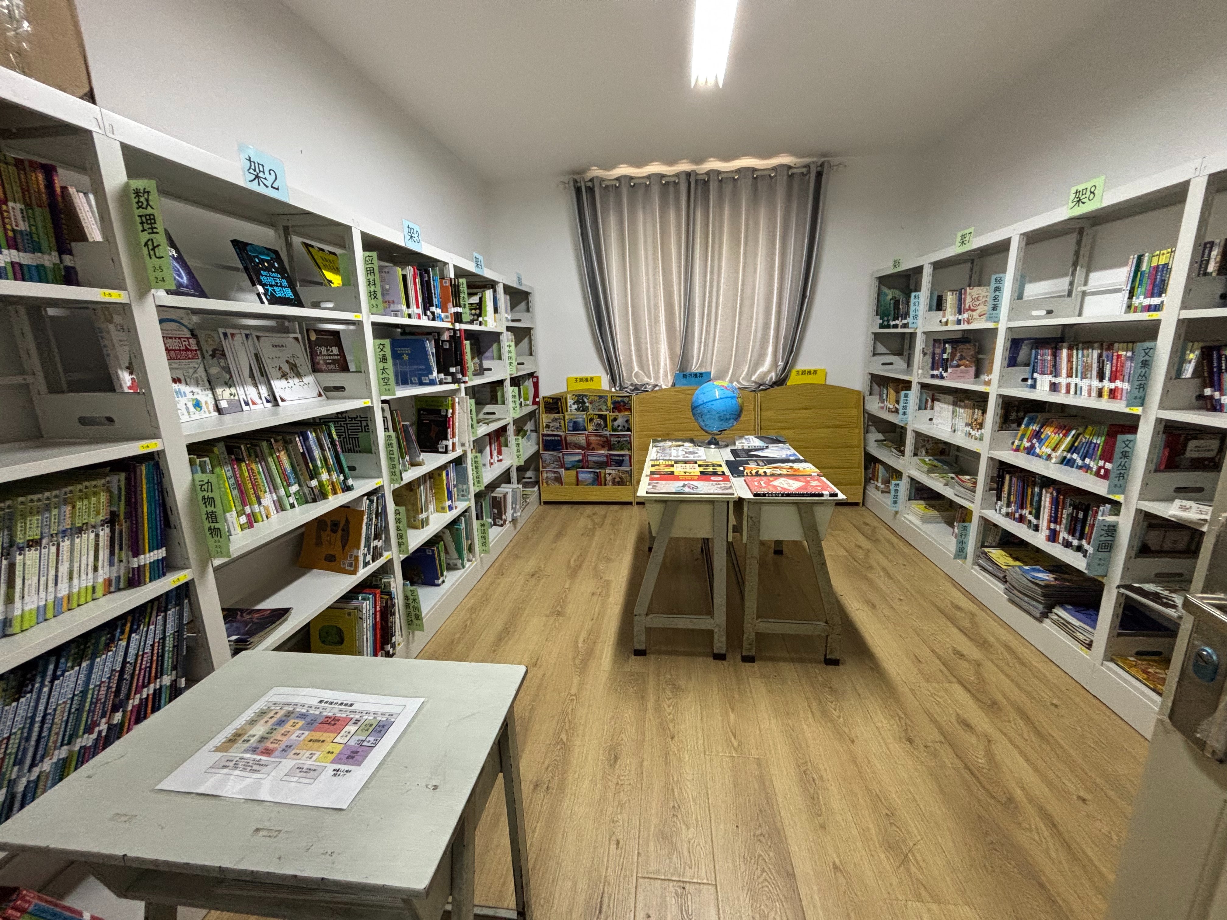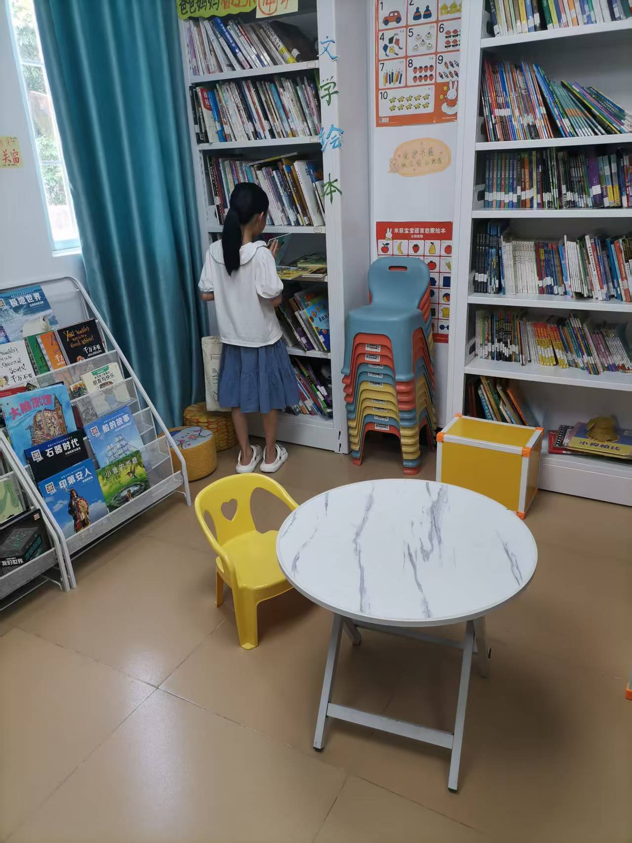 三是简单布置图书馆。利用楼梯扶手当滑梯,从四楼运了两个双人桌下来,放在图书馆中间,可以区隔动线,也可以摆一些不适合外借的书、其他阅读活动相关物料等等。