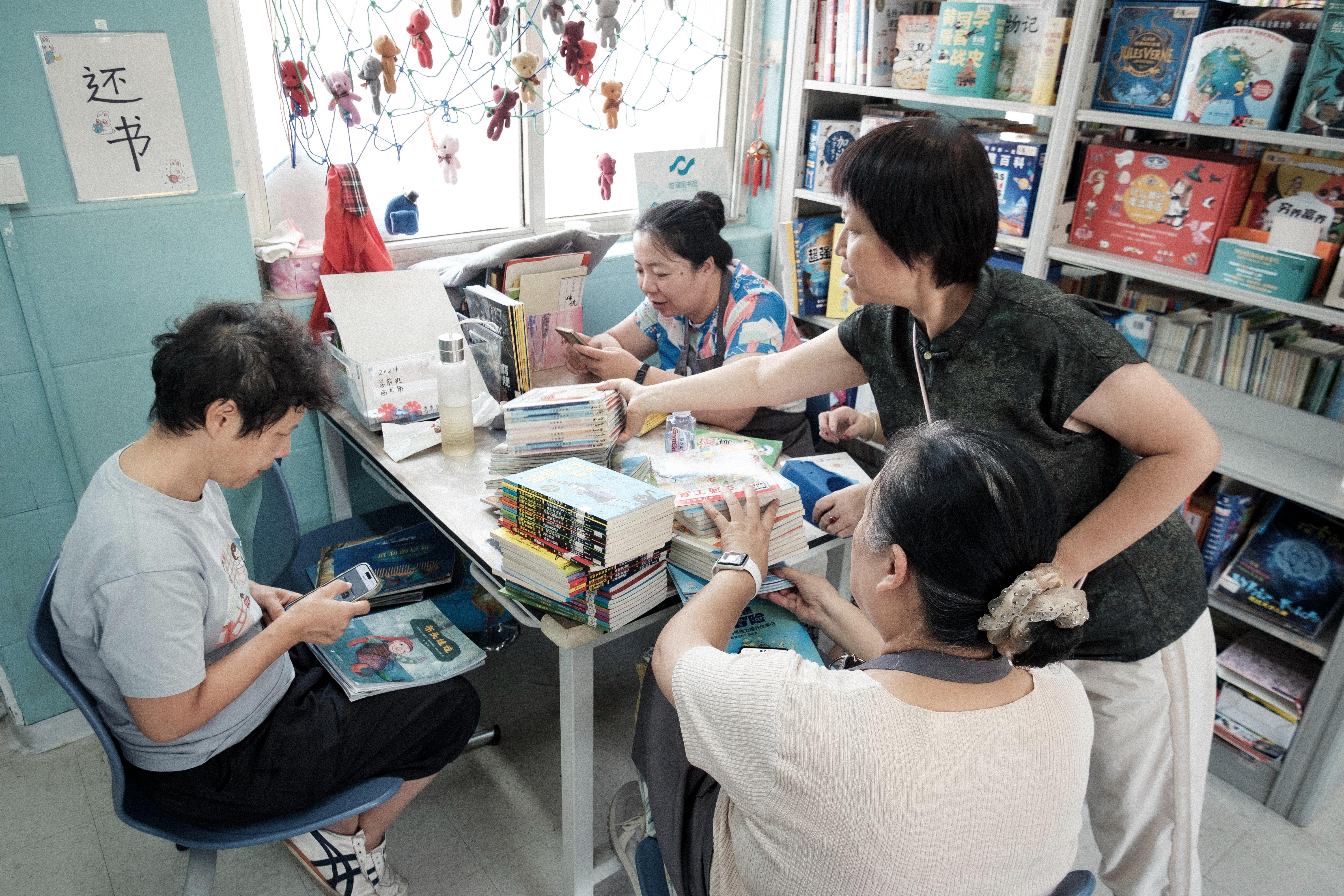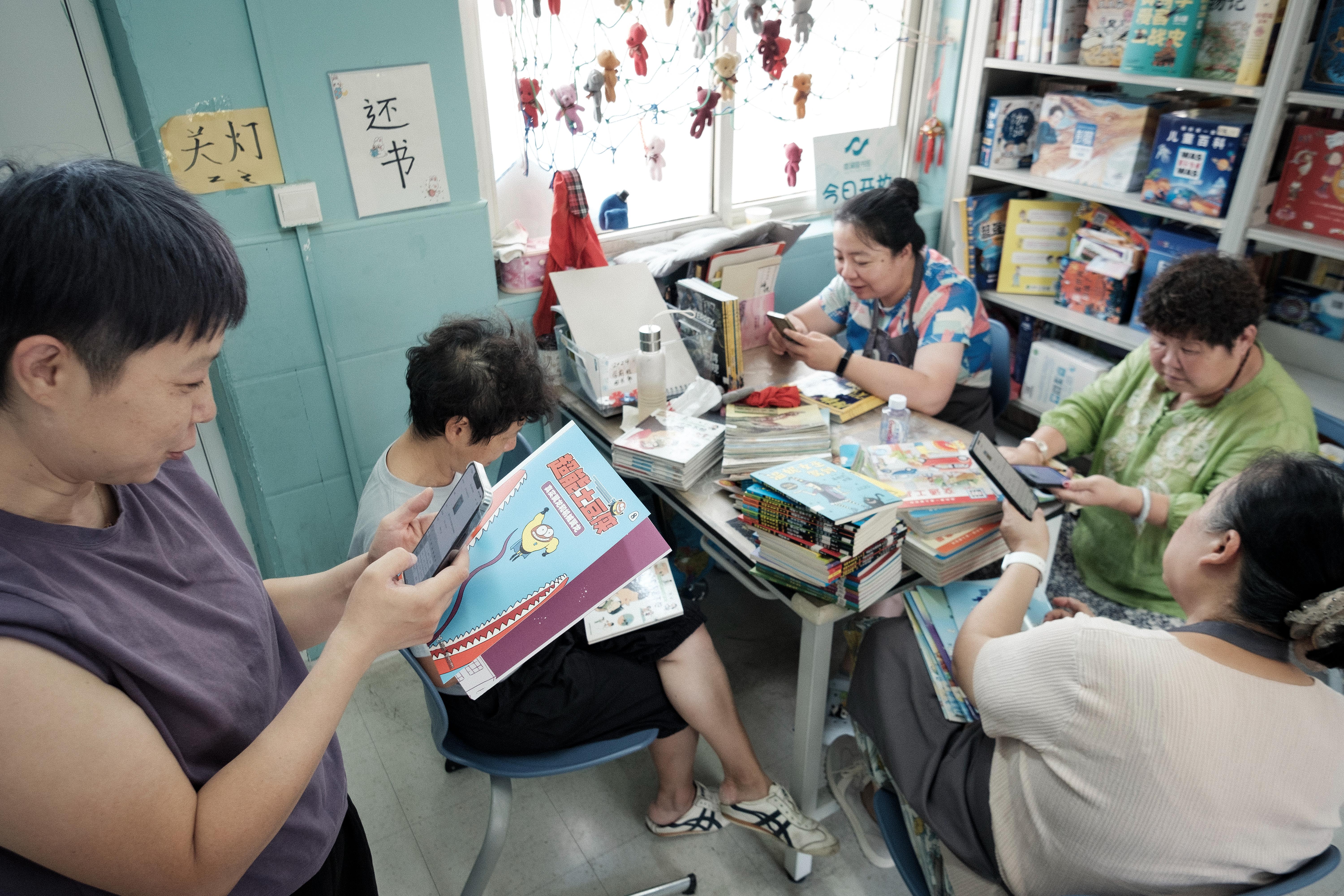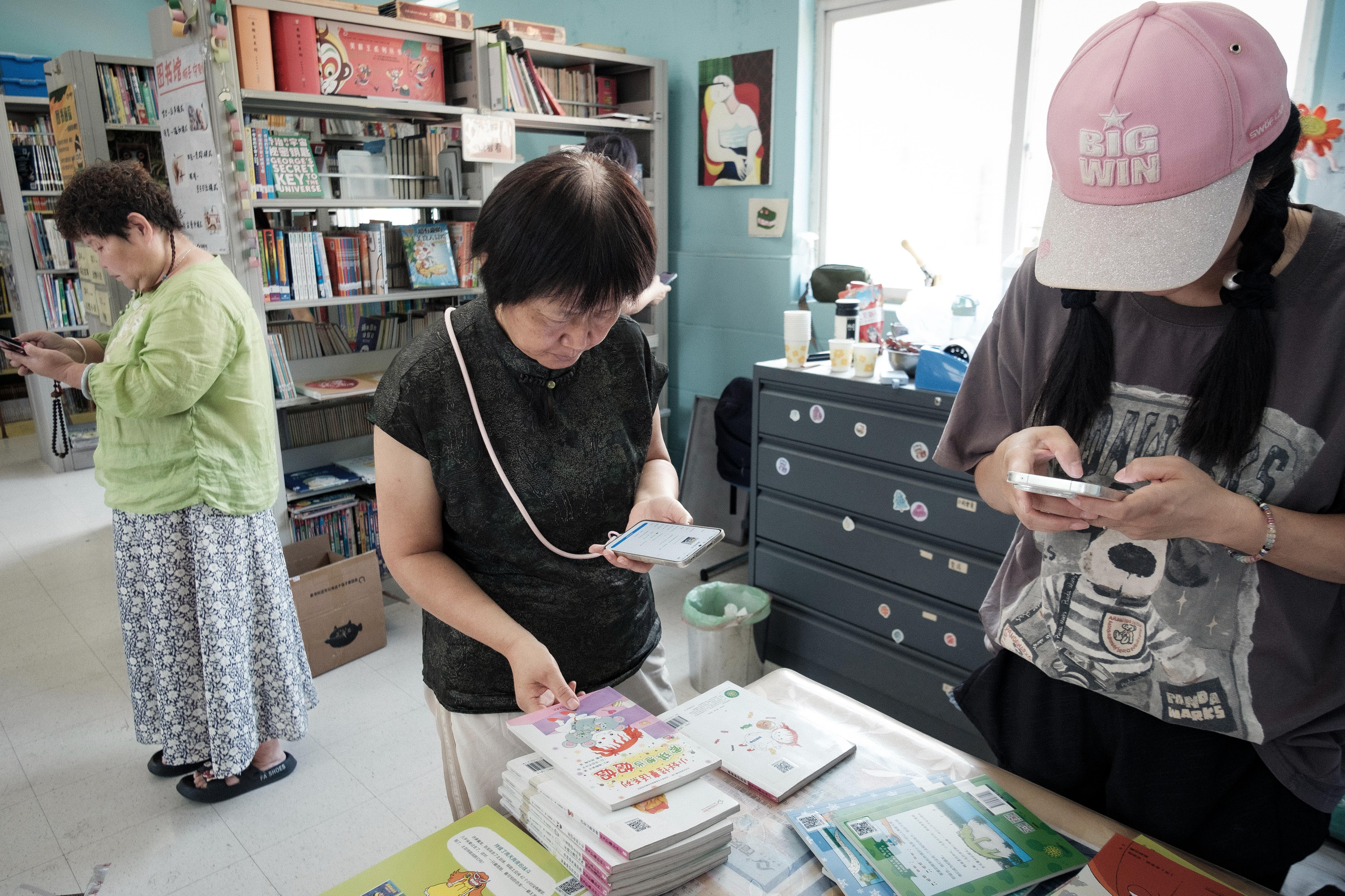 因为图书馆小,采购了4个带轮书车放绘本,开馆时推到屋外,充分利用走廊空间。今天书车发挥了运输功能,几个人在走廊贴白标签,运到屋里分类上架(兼修补破损书)。