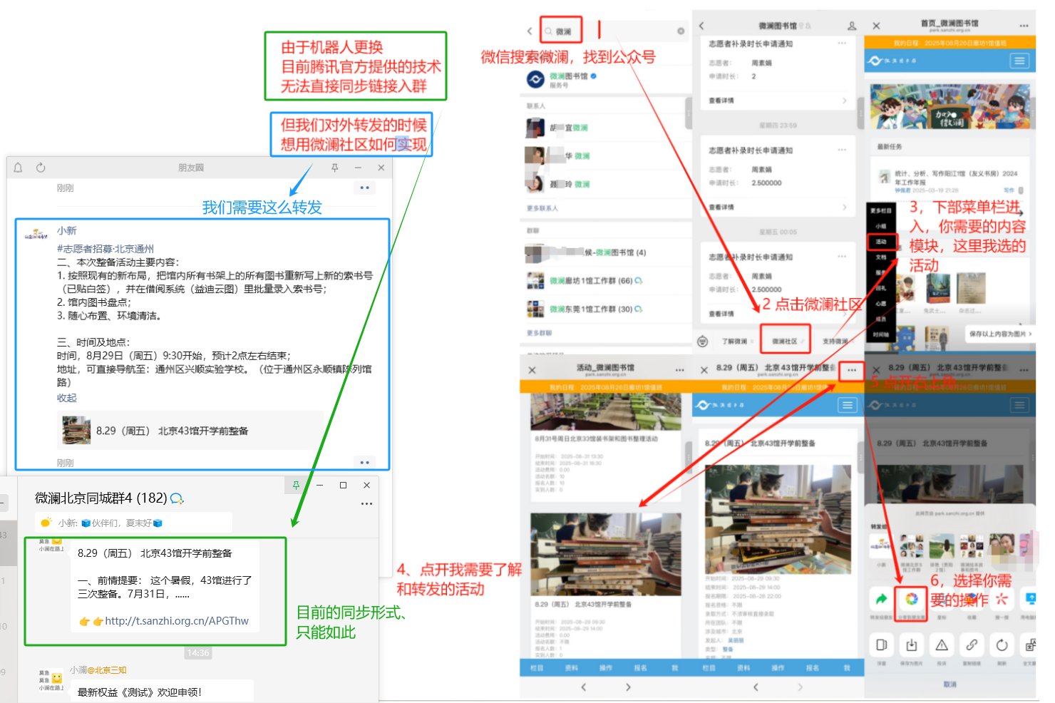 微信机器人恢复使用(新的)后,目前信息的同步是文字+文字链接的方式;如果发朋友圈,想实现直接转链接,可以先通过微澜图书馆公众号进入微澜社区,再找到相应的内容转发,就可以实现直接转链接的方式。