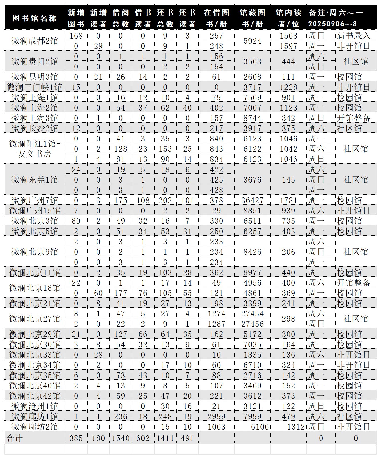 14所校园馆开馆、2所整备,7个社区馆日常开放,为945人次读者借阅图书1447册次,处理归还图691册(487人);各馆购买/受捐/学校馆藏等录入上架图书148册,各馆录入新读者314位。