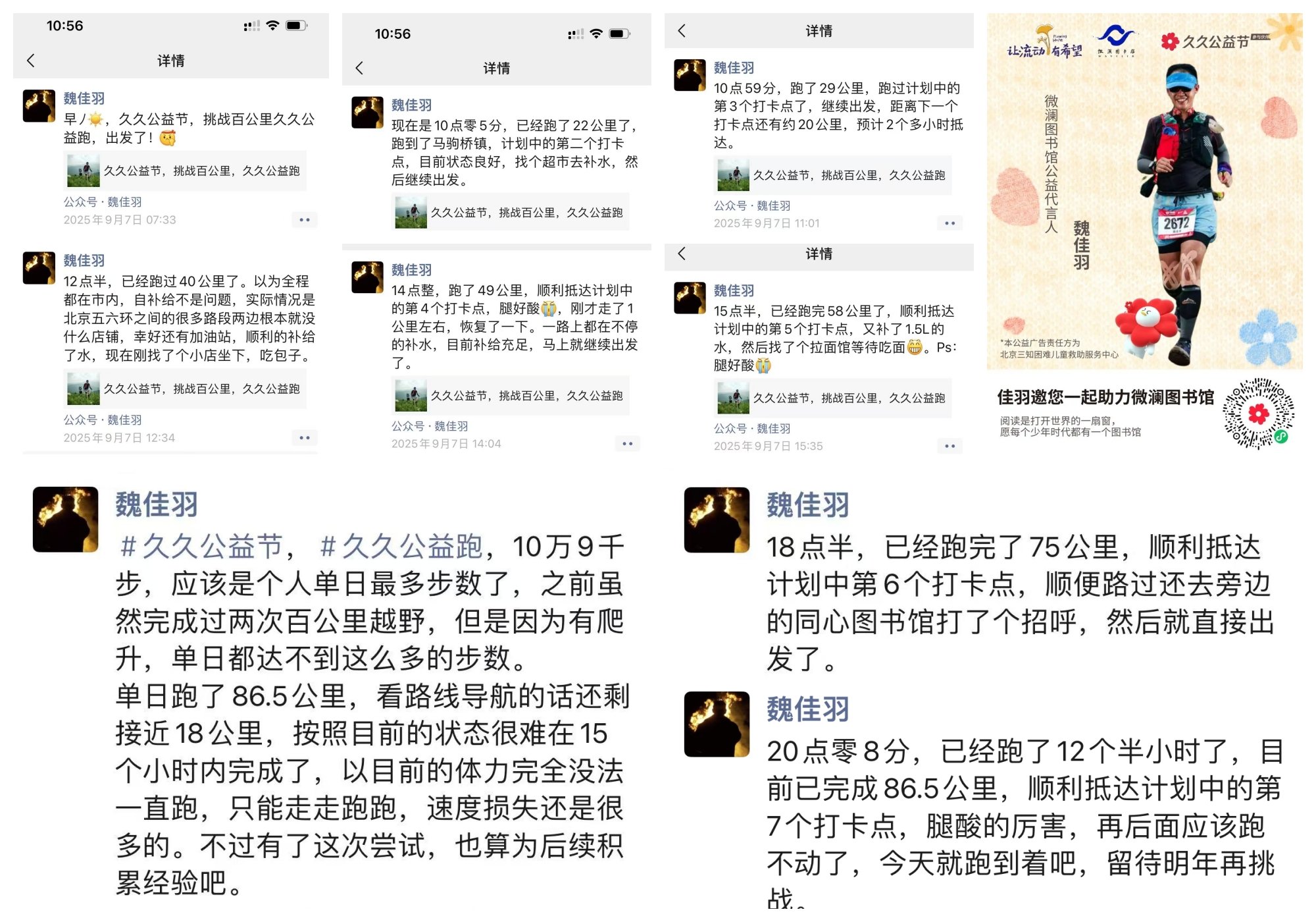 二、9月7日 ,北京三知总干事魏佳羽,独自发起了 久久公益节,挑战百公里,久久公益跑,为微澜图书馆筹款