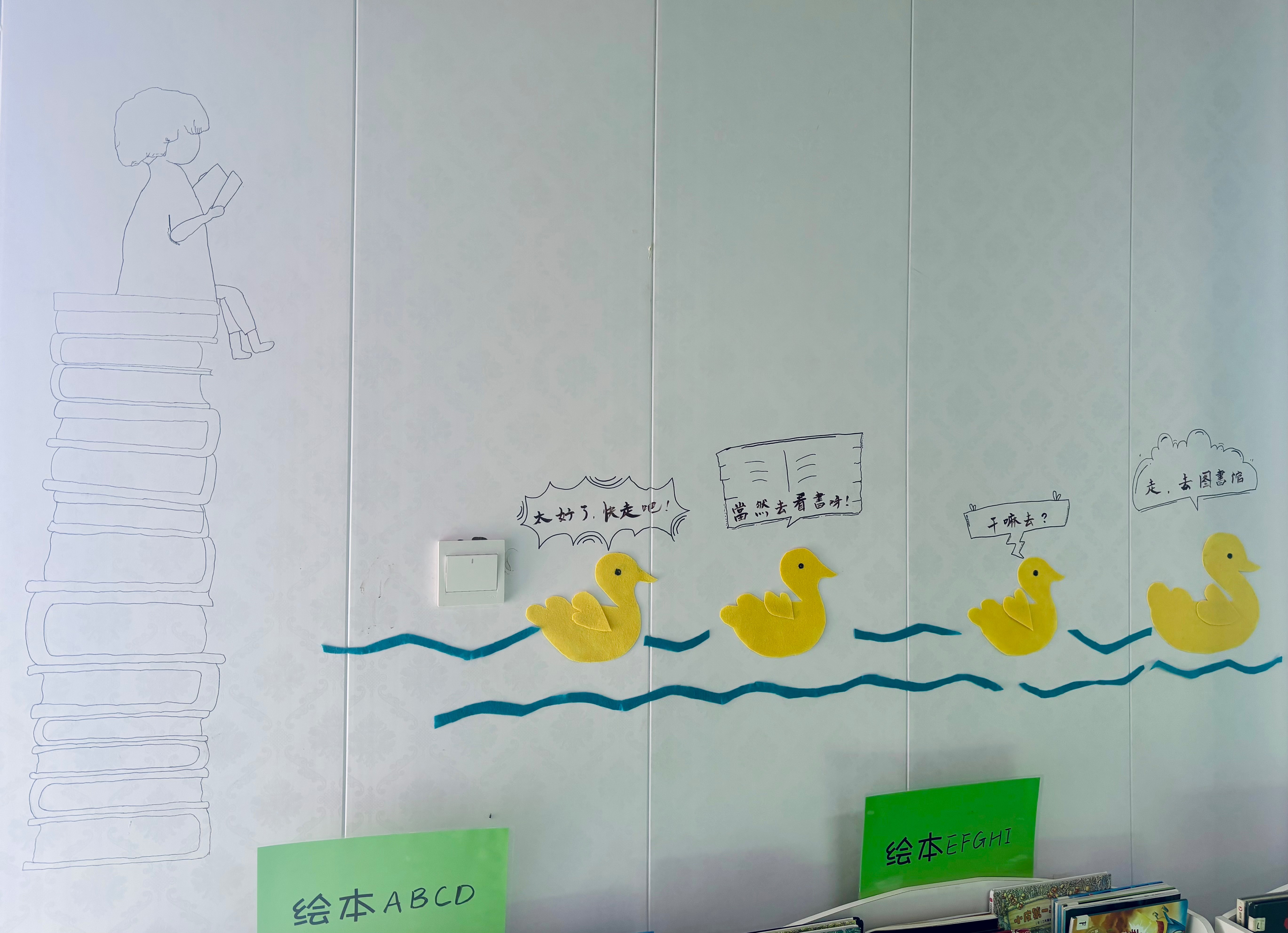 两位伙伴好辛苦,还带着一位患病的小朋友。她们初步装饰了东门西侧墙面,另对西墙的布置做了初步设想。真不错,可惜忘记拍照了。她们还更新了一二年级四个班的图书角。