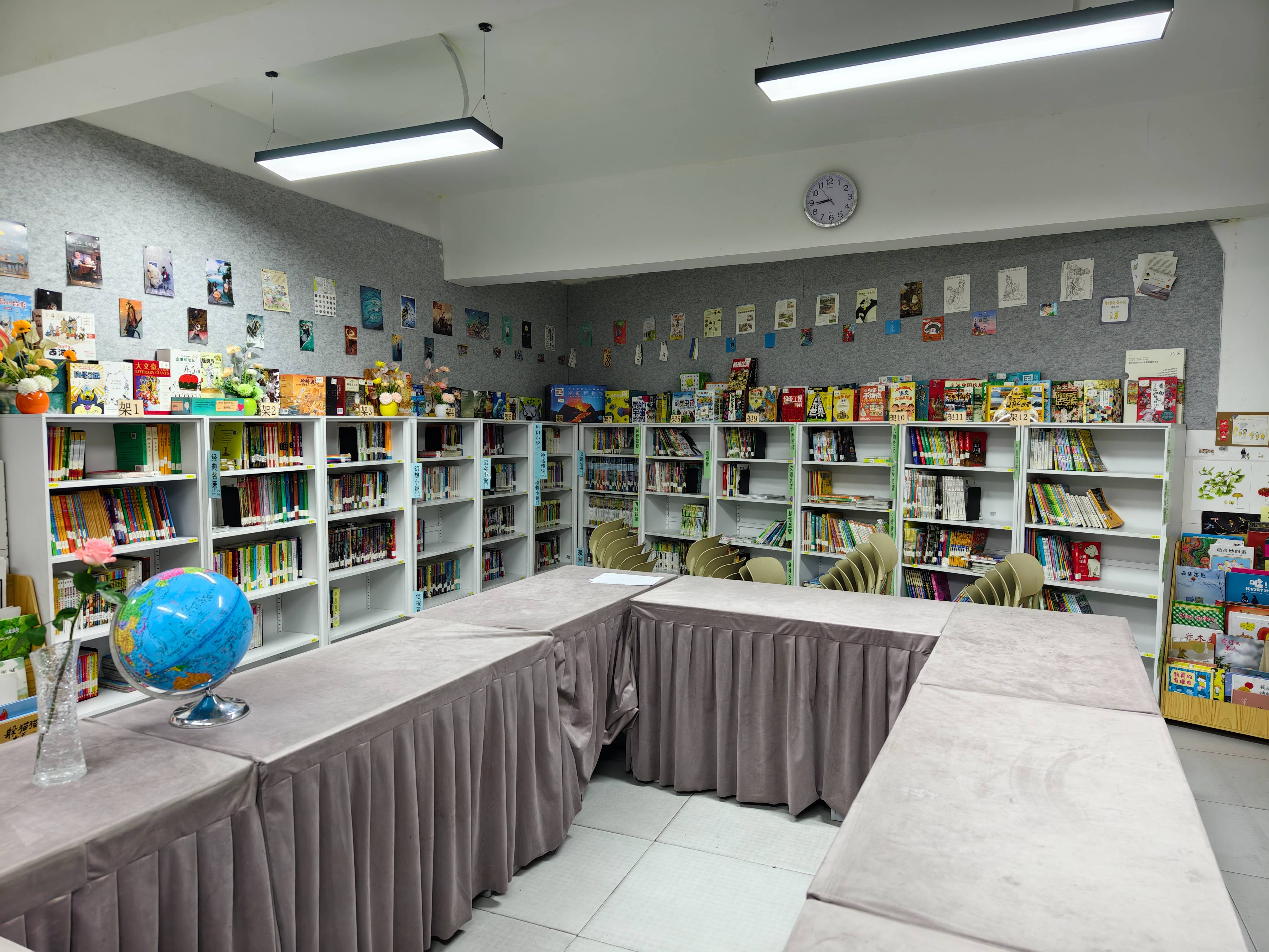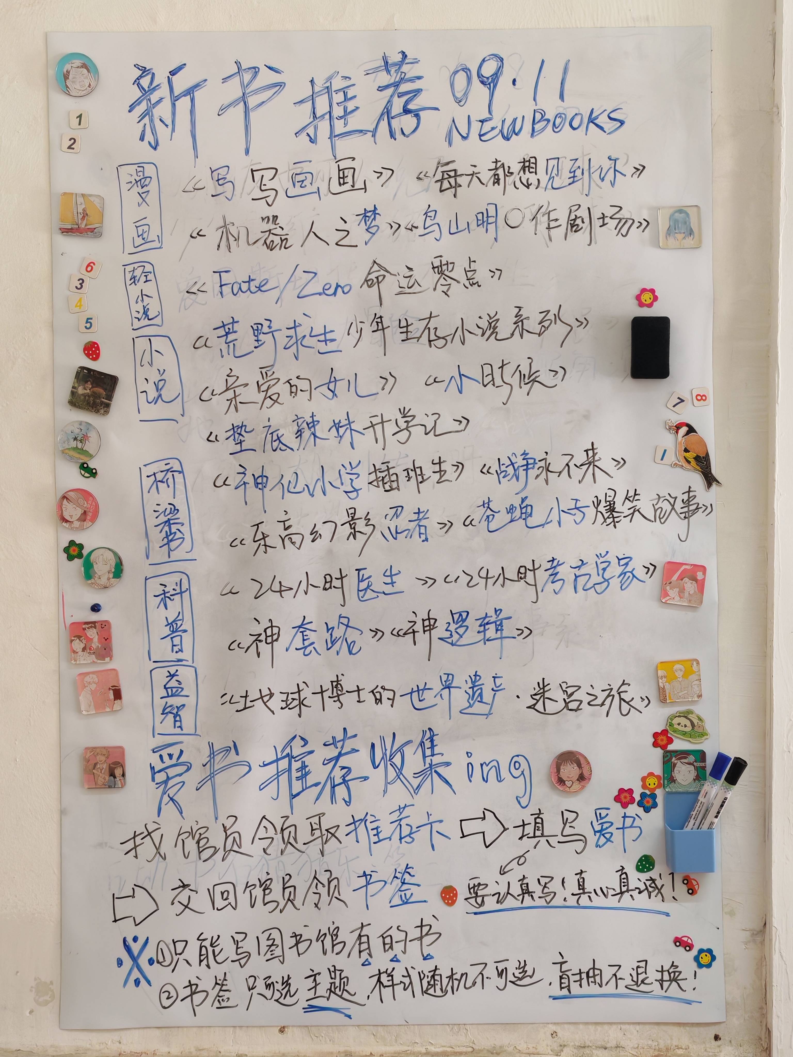 今天到馆时王燕老师已经到了,在整理抽屉里给孩子们打印的借书卡标签。我和一宁着手开始装饰墙面,从家里带了些材料,趁着孩子们上课的时间我们动手开始干活。午餐后的图书馆依然热闹非凡,很多孩子一个假期过完卡都找不到了,重新发卡的同时,也发现有的同学在反复办卡,我们商量下周把借书及借书卡的规则重新整理一下挂起来,提醒孩子们遵守规则。