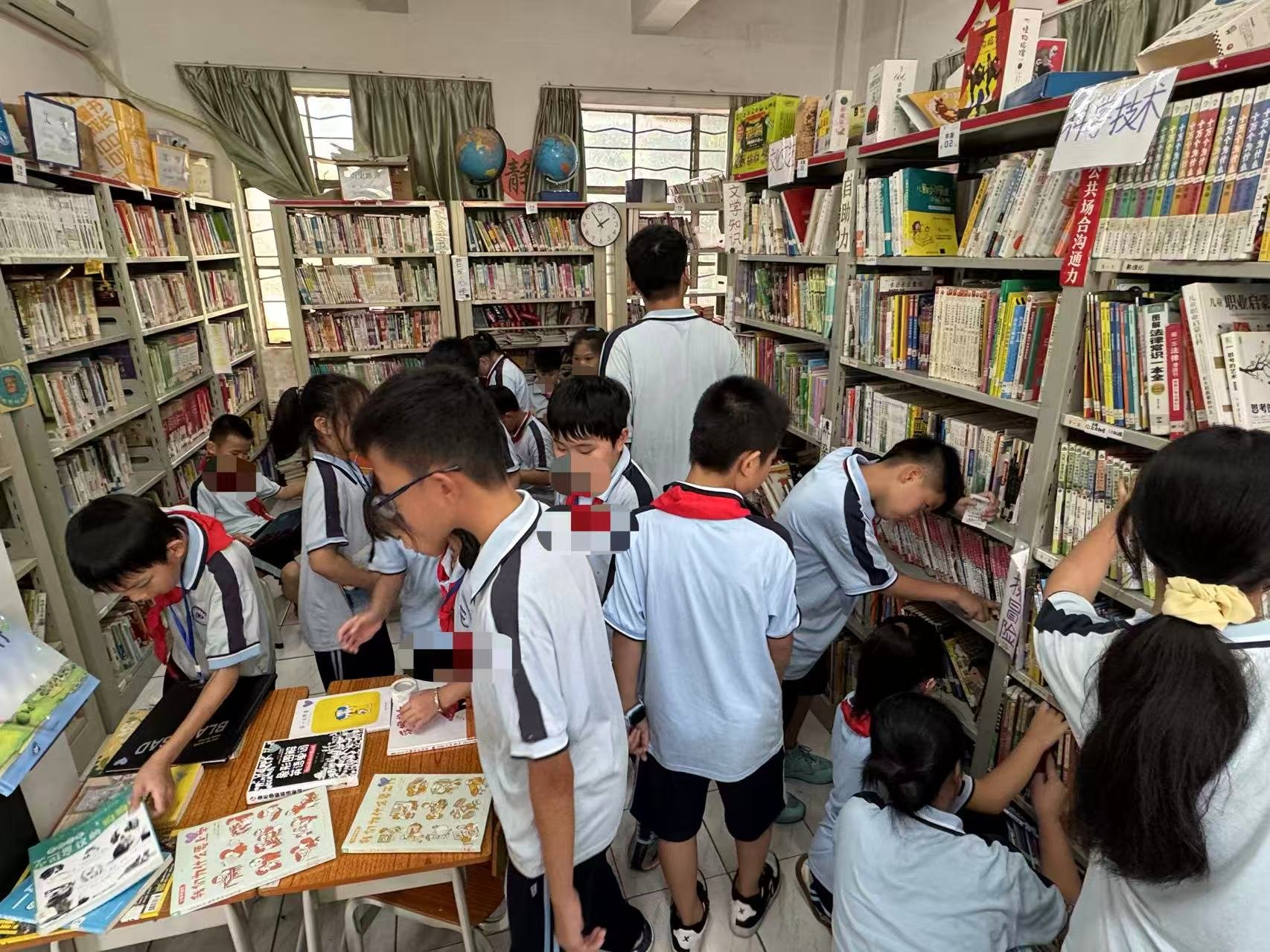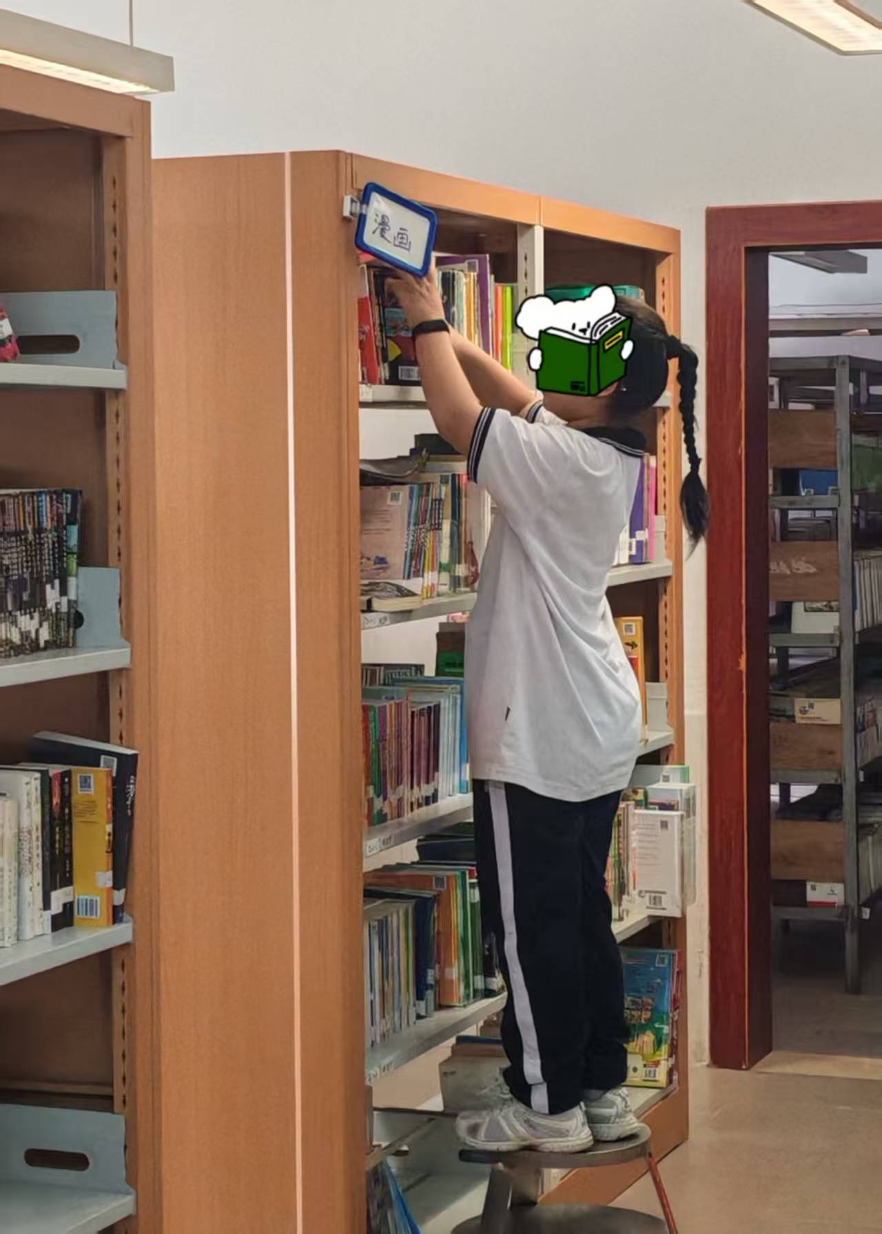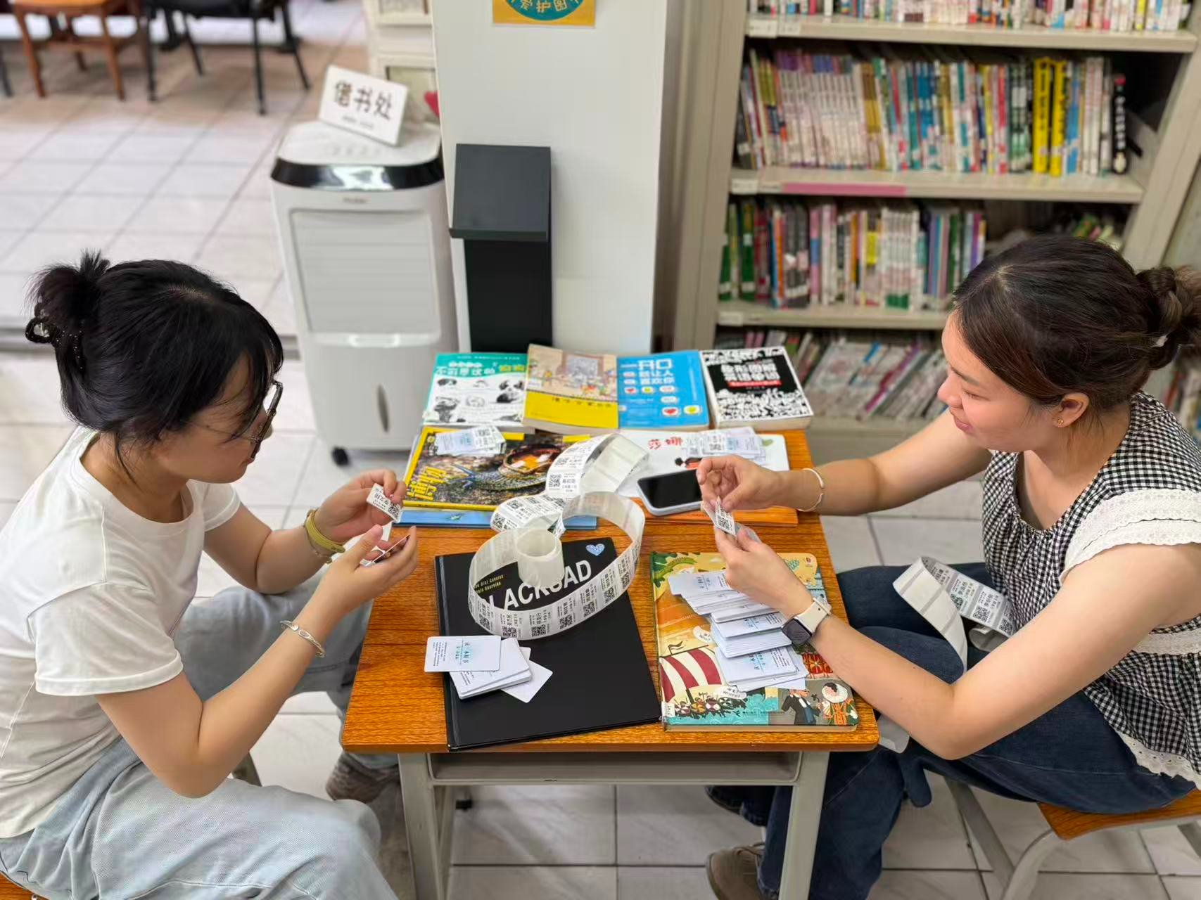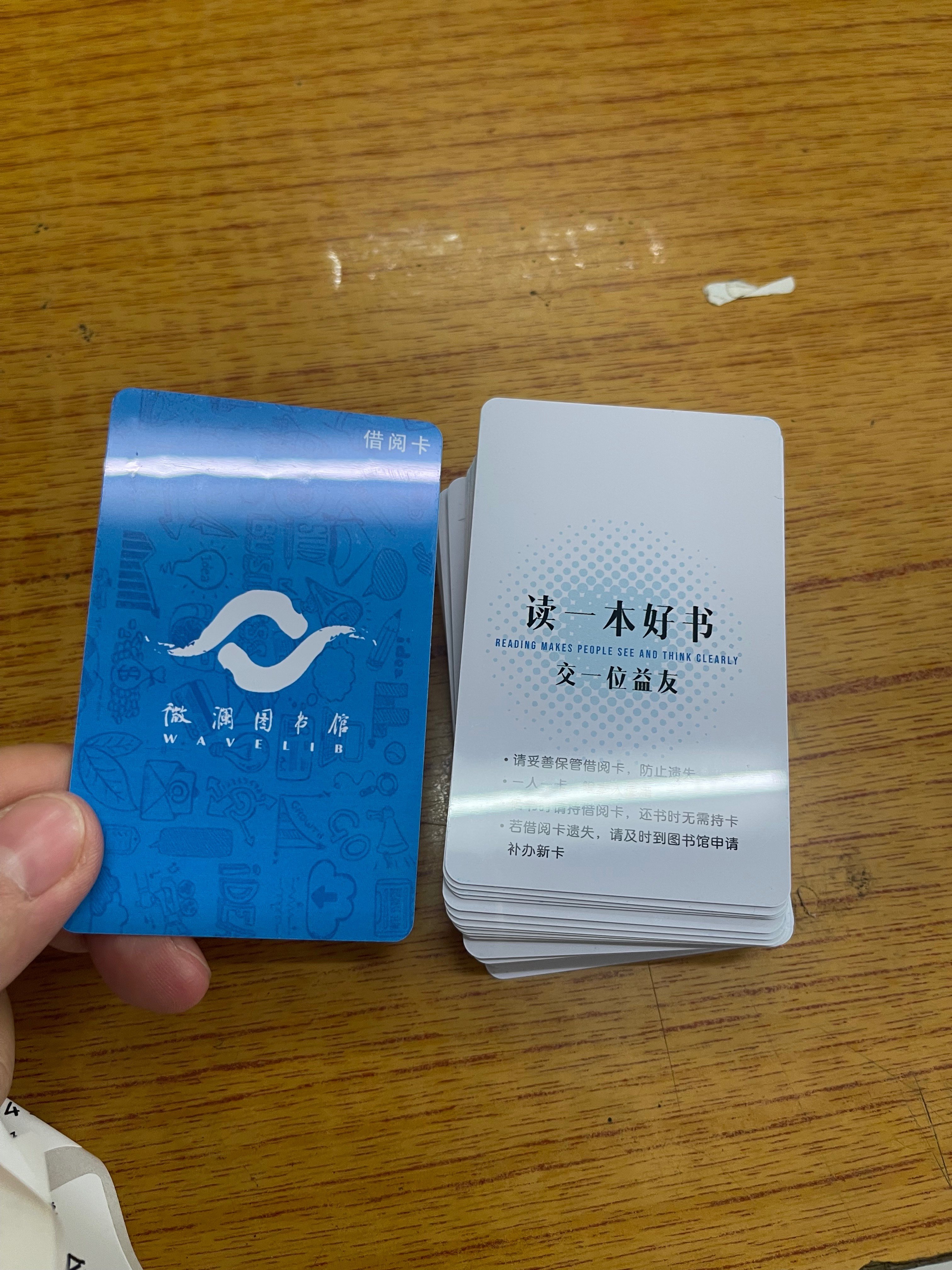 整个上午几乎没怎么停下来。不仅要修改书脊标签上的层架号,还要帮所有新生和插班生统一办理借书卡。不然三年级的同学就会一直跟在你身后,盯着你,问什么时候能办好卡。每个课间都会跑来问一次,真的挺忙的。还好今天刚好有四位志愿者,所以每个时间段都能游刃有余地应对。