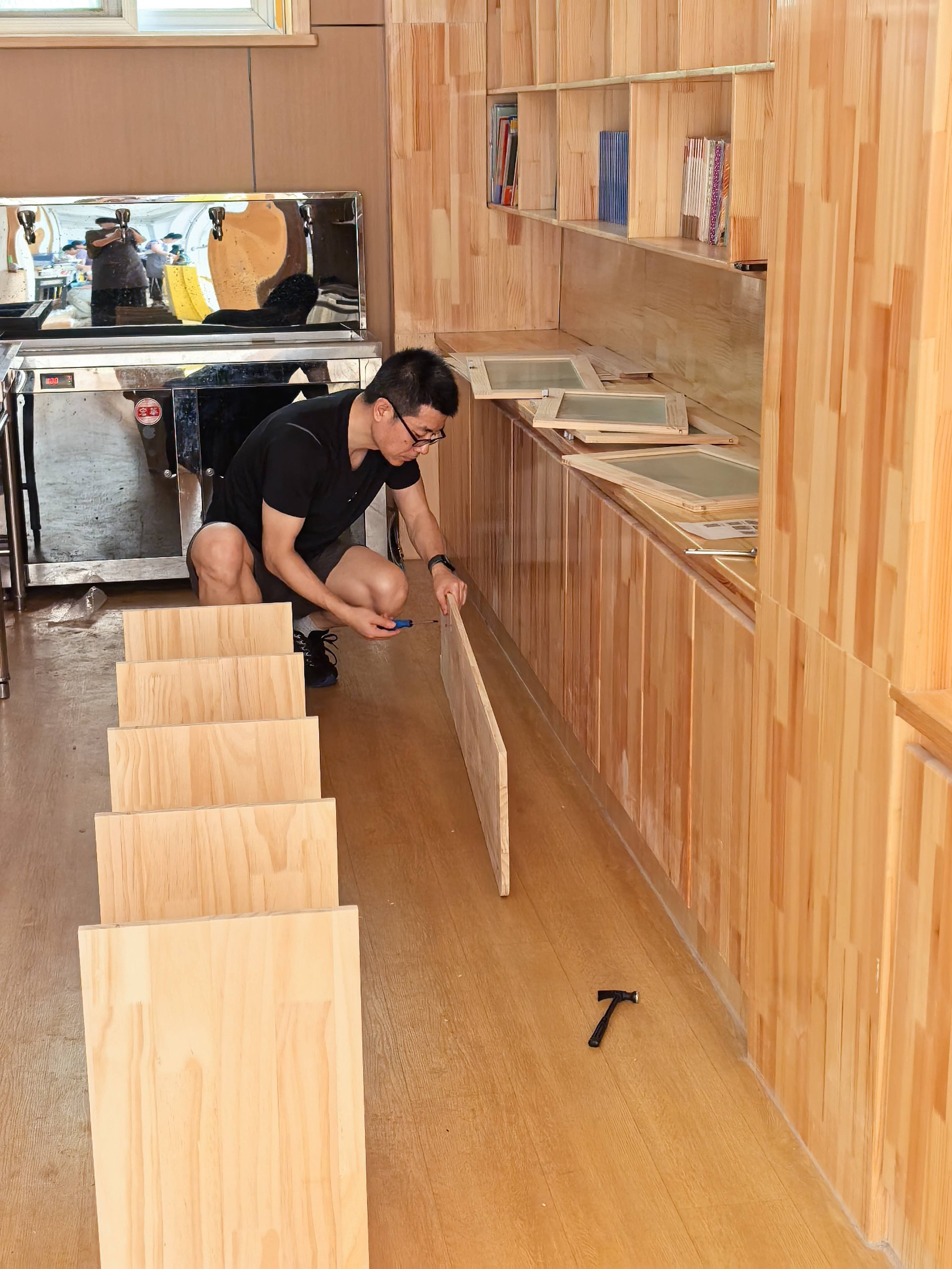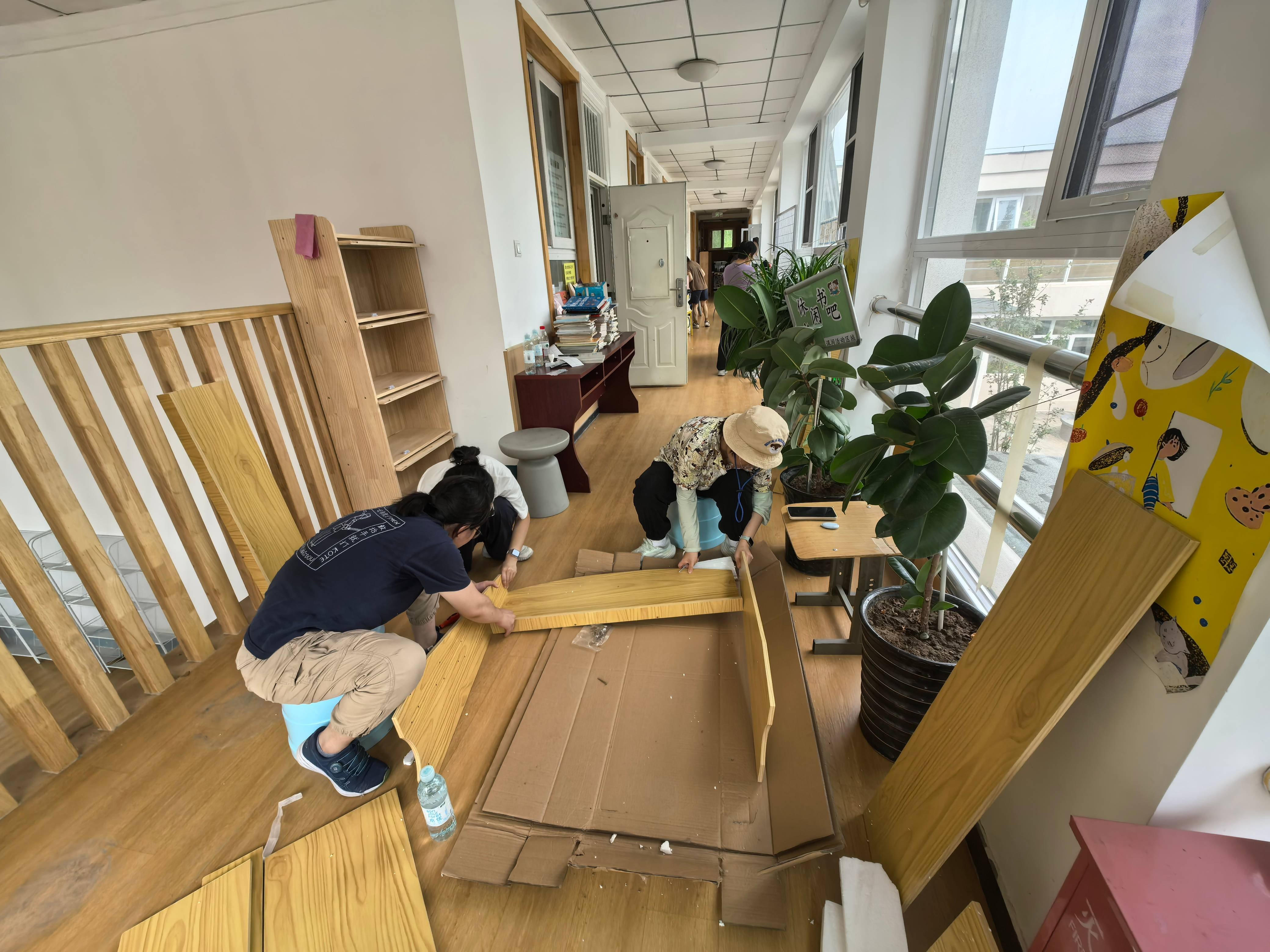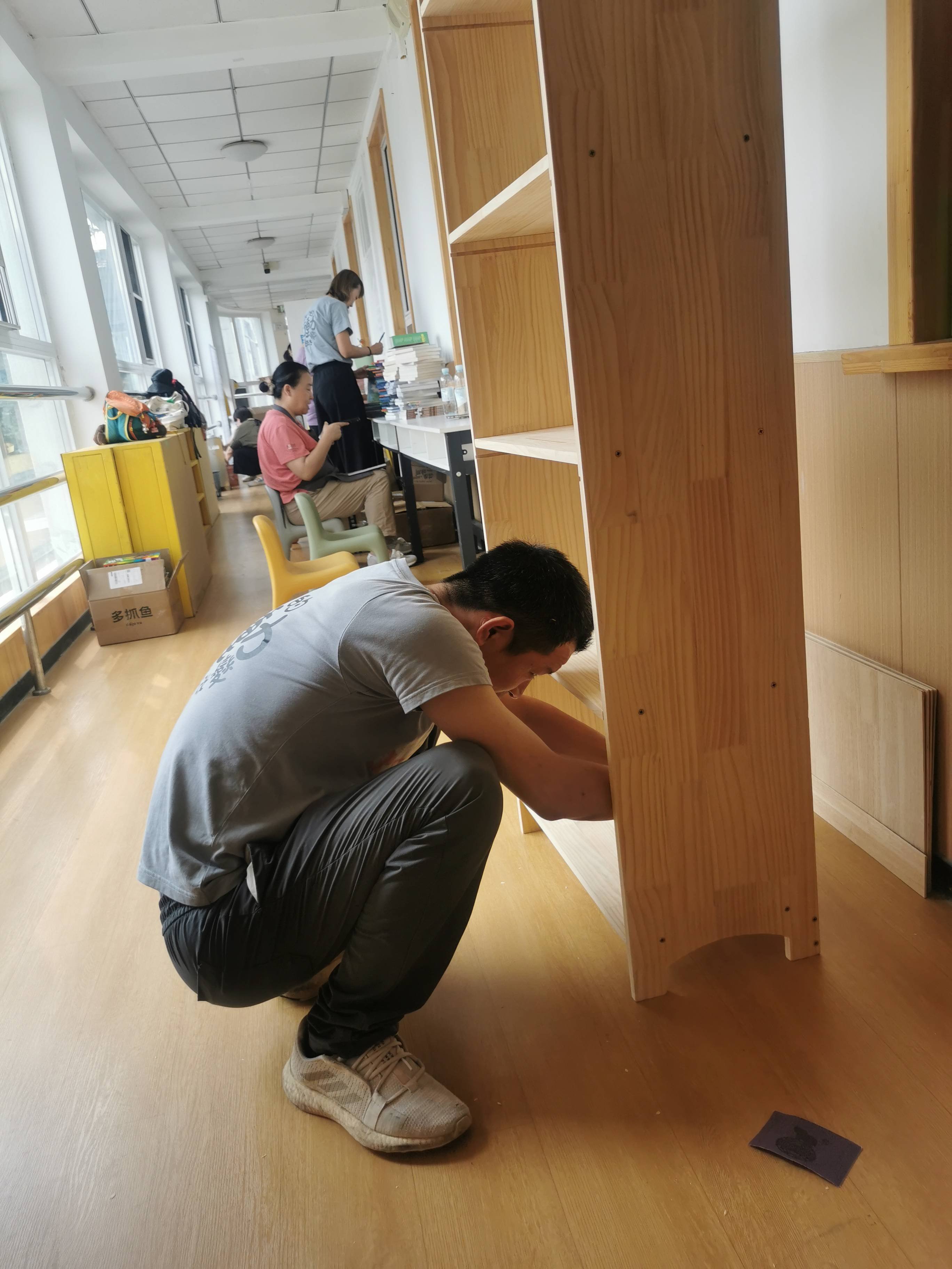 我今天去了先安装了展示架,然后图书录入(流程是贴微澜码,给微澜码上覆盖透明膜以便保护,书脊贴白标签,根据馆内地图写书架位置号码。然后登陆益迪小程序录入图书),然后和刘彬在丸子哥的指导下合作完成了一个木制书柜的安装,安完后没有钉子裸露在书柜內,超完美,感觉棒棒的。