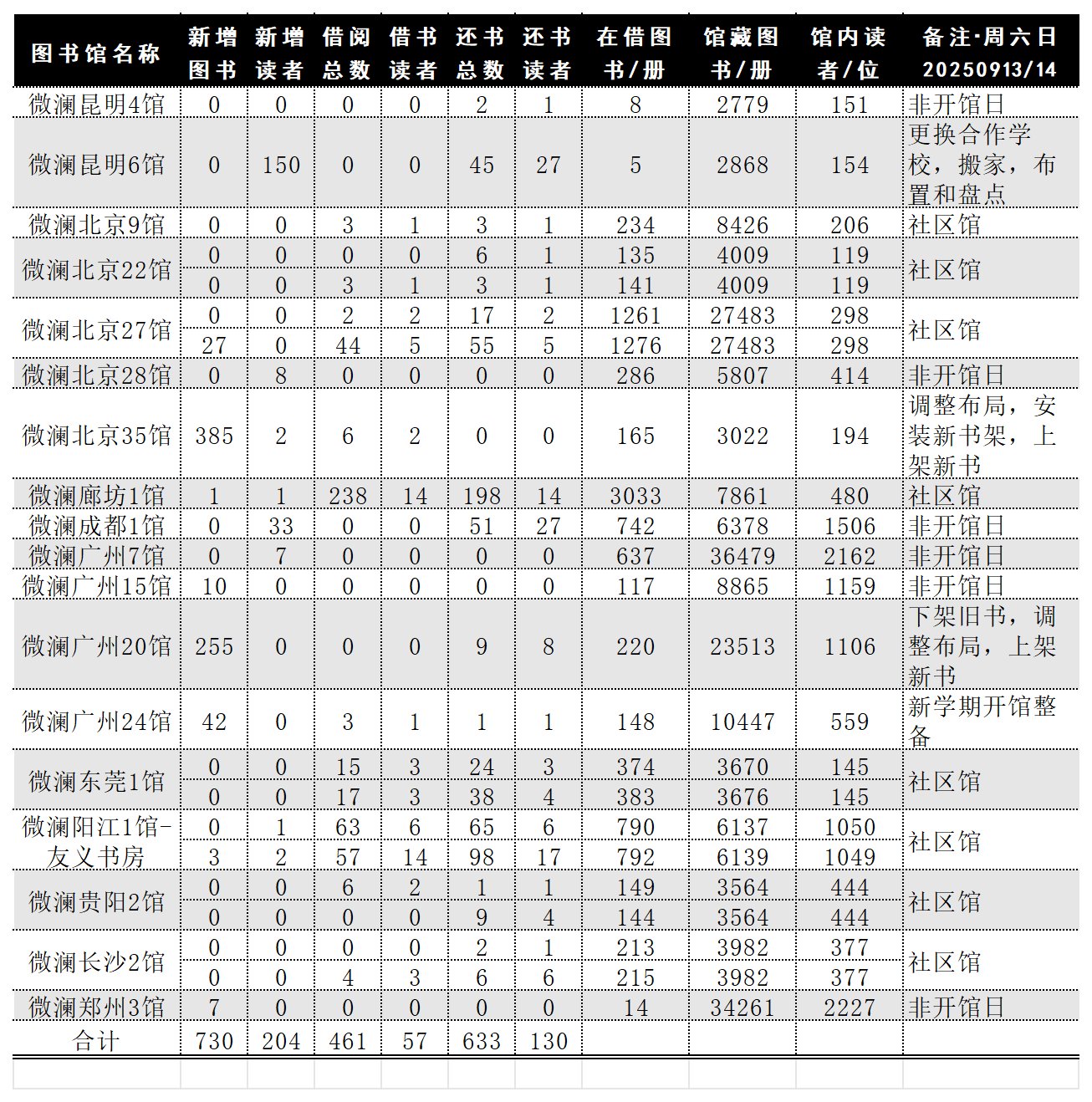 昆明6馆紧急搬家,广州20、24馆、北京35馆整备,8所社区馆日常开放借阅,为57位读者借阅图书461册次,处理归还图633册(130人);各馆购买/受捐/学校馆藏等录入上架图书730册,各馆录入新读者204位。
