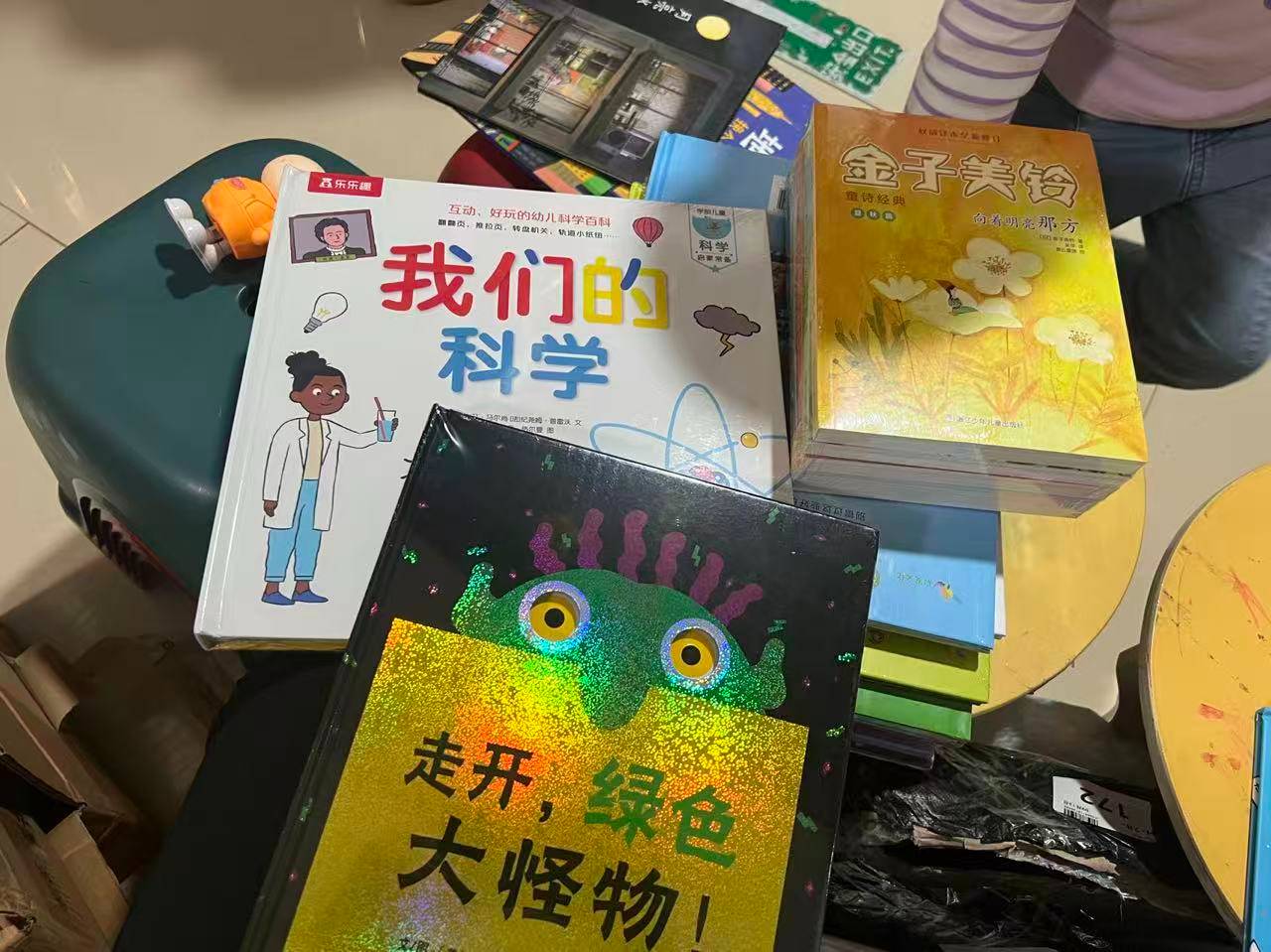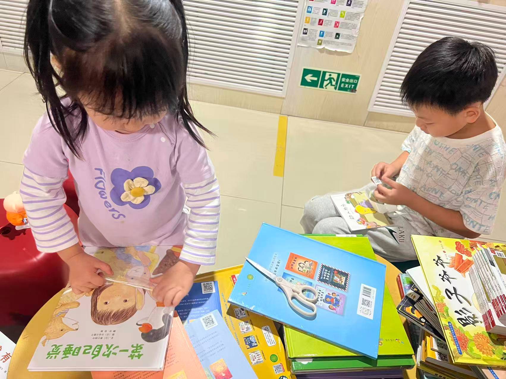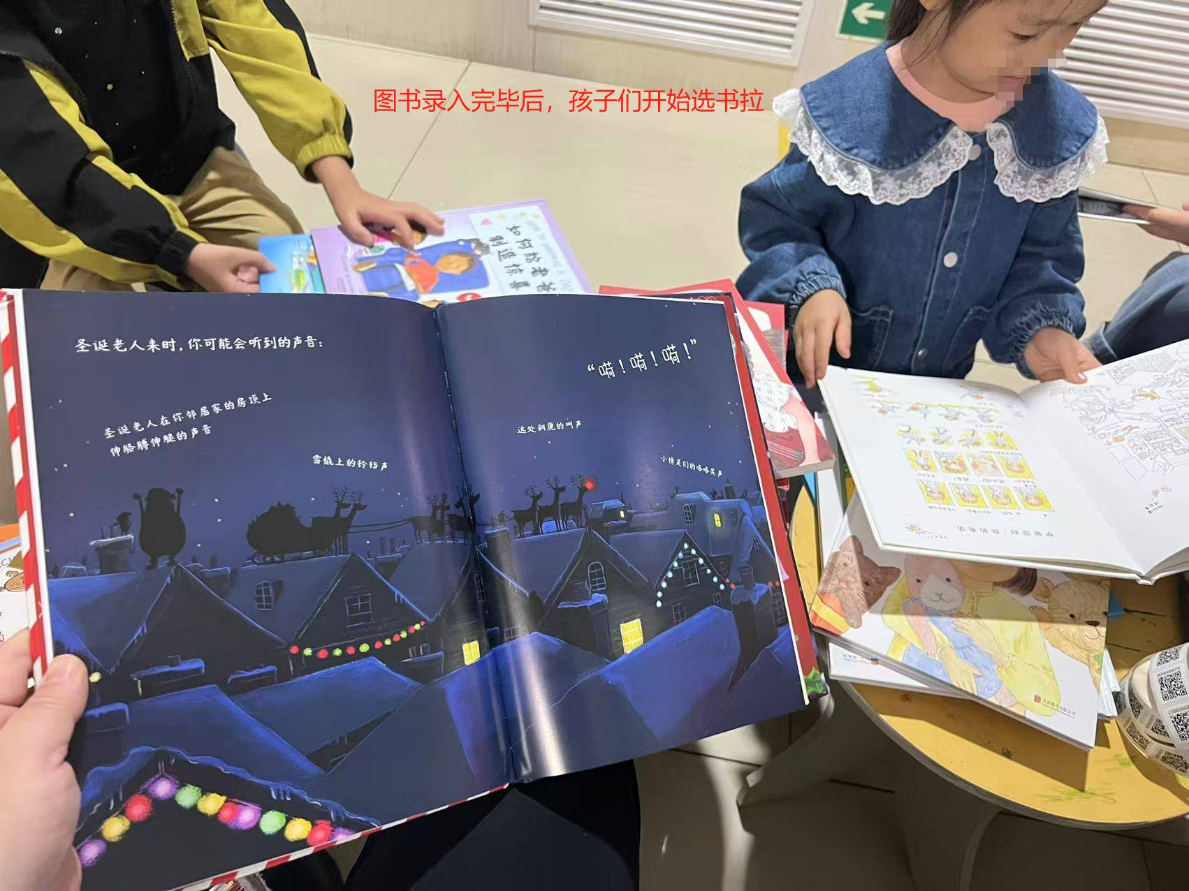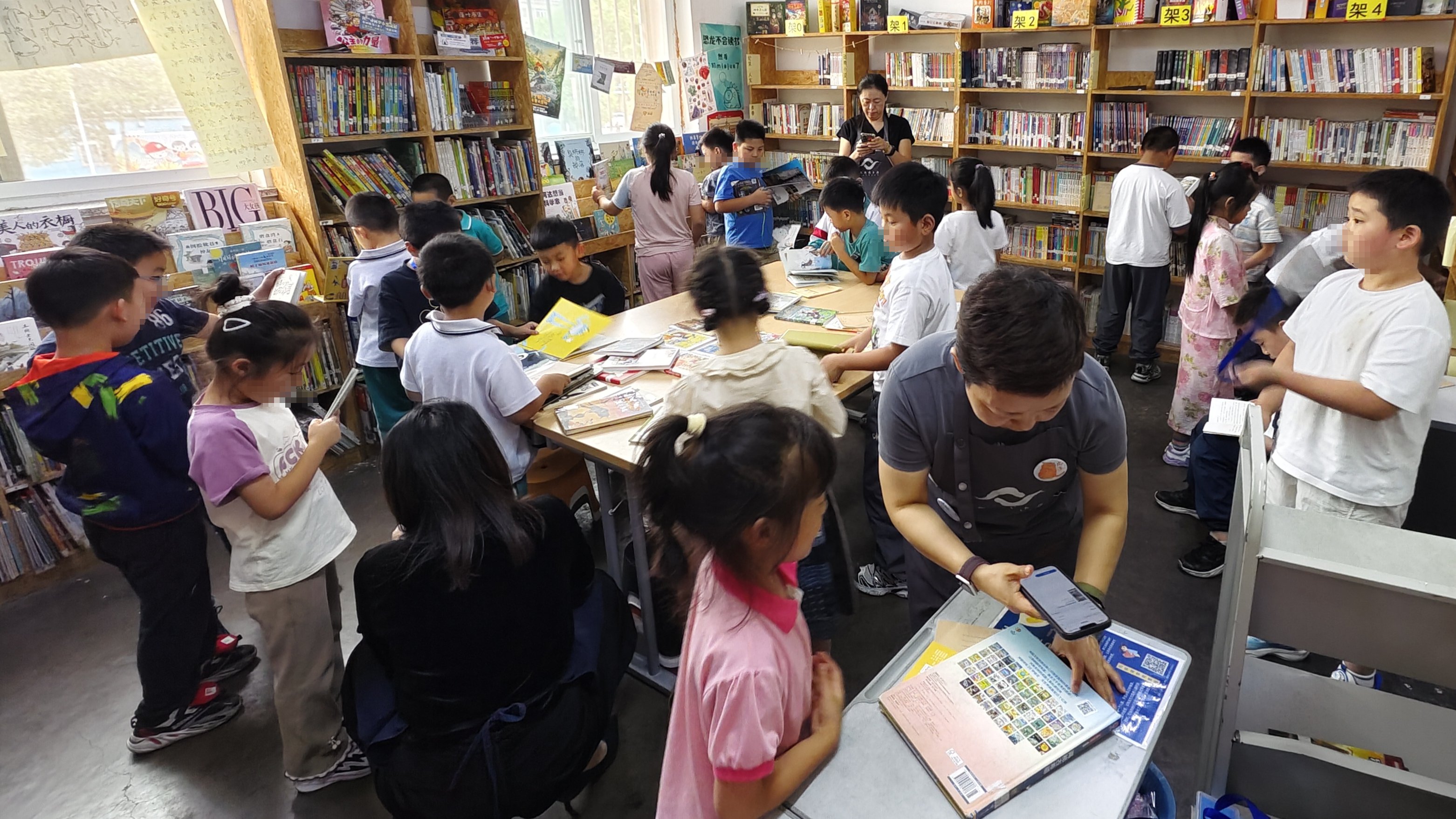 ak和爸爸来。ak接力mm的工作,帮忙给新拆封的书开封,并贴码,我继续工作,大家逐渐来,很快工作区围满还书,忙完赶紧归还,而孩子们已经在认真自己选书了,一众新书很快被分配完毕。还有的读者,没来得及招呼,大家就每人五本六本,没有借很多,常来吧,之后尽量周二录入新书,周五周六把时间留给孩子和家长最好。