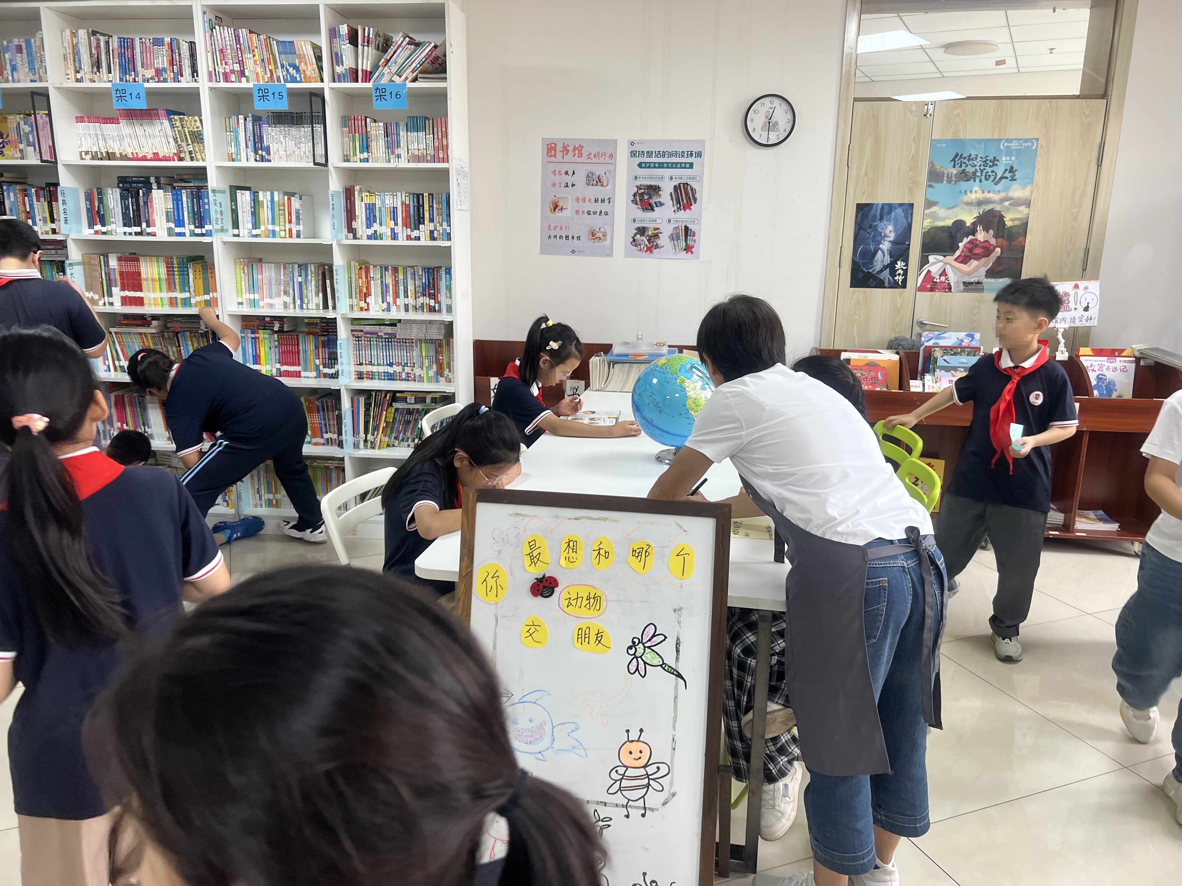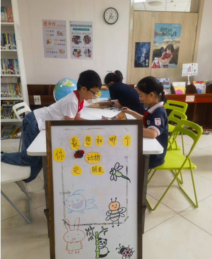 今天和罗辉、刘娟两位老师一起值班。两位老师的业务能力是值得我好好学习的。今天我们为同学们提供借书还书服务,还修补了破损的图书。对学生家长捐助的部分图书,进行了审核、录入、上架。没有审核的捐助图书,整理放固定位置并用字条进行了注明,接下来值班的老师们继续完成相关工作。今天还为十一后的活动进行了热场,号召同学们参加“你最喜欢和哪个动物做朋友?”的活动,我们三位老师也制作了海报。同学们积极将自己喜欢的小动物,写在卡纸上,张贴上活动栏。今天有些同学带上了一道杠、两道杠,她们特别自豪的向老师耸耸肩膀,让老师看到她们努力的成果。能感觉出同学们不仅喜欢图书馆的图书,也喜欢图书馆的志愿者老师们。说心里话,看到孩子们取得的进步,我们志愿者老师们感到由衷的高兴!