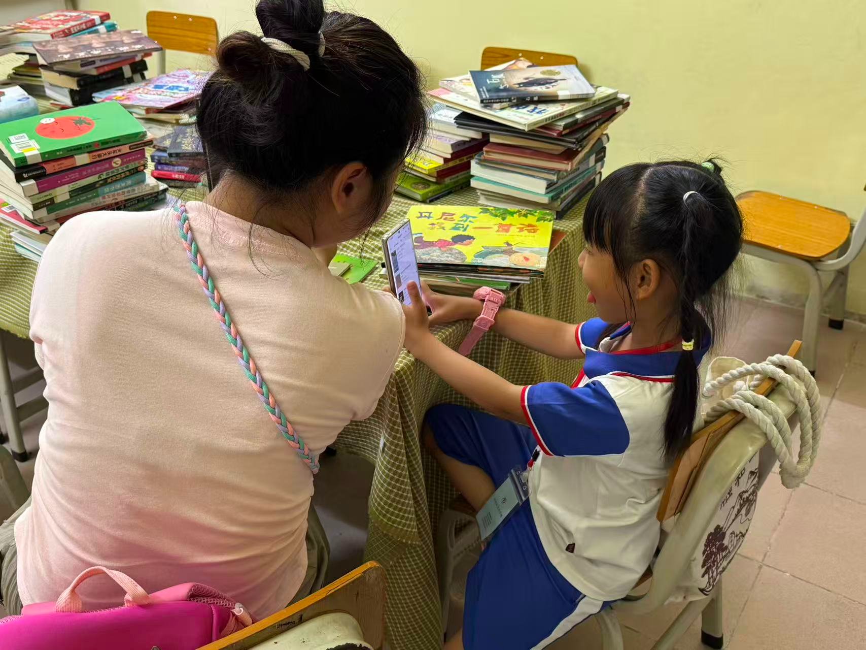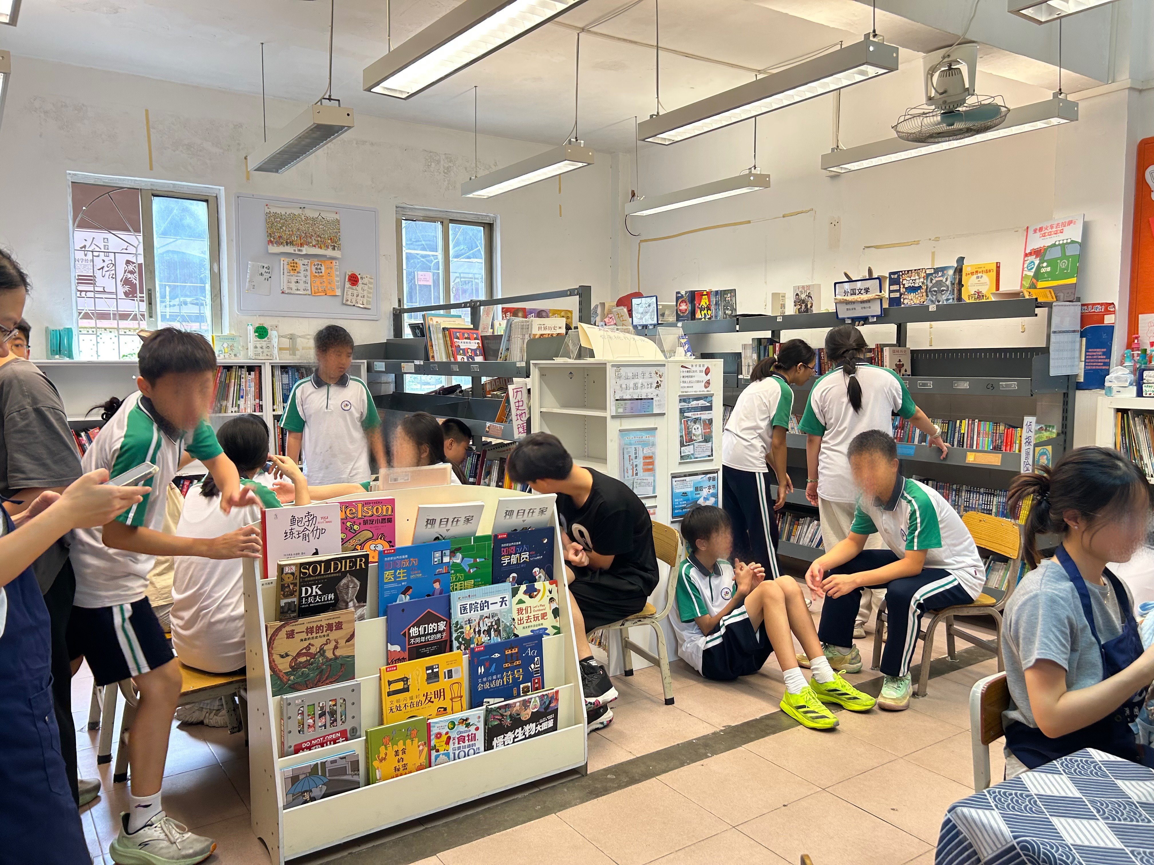 图书馆人气挺旺的。可喜的是,有不少新转来的同学已经习惯于来借书了,有的还主动当读书推广员。有一个新转来的孩子分享了跟妈妈的一段对话:“我们新学校有图书馆!而且给我办了借阅卡。”妈妈:“办卡要钱吗?”“不要。”“ 借书要钱吗?”“不要。”“那你得爱护图书,借了,千万不要弄丢了!”然后问我:“你们谁是经理?”答:“这里没有经理,因为这不是经营的,是公益图书馆。我们是志愿者。”“你们来上班不给你们钱吗?”……孩子对图书馆和我们都充满好奇。