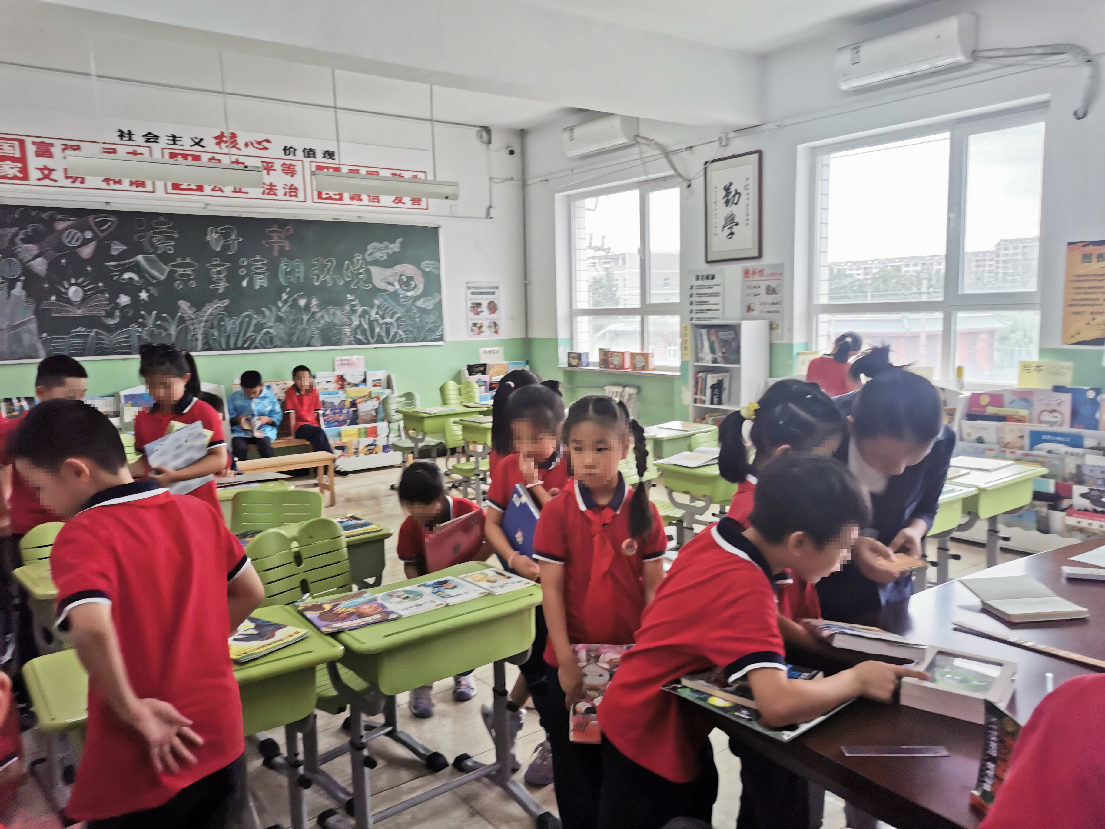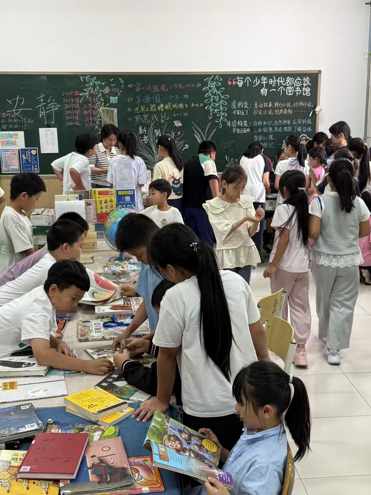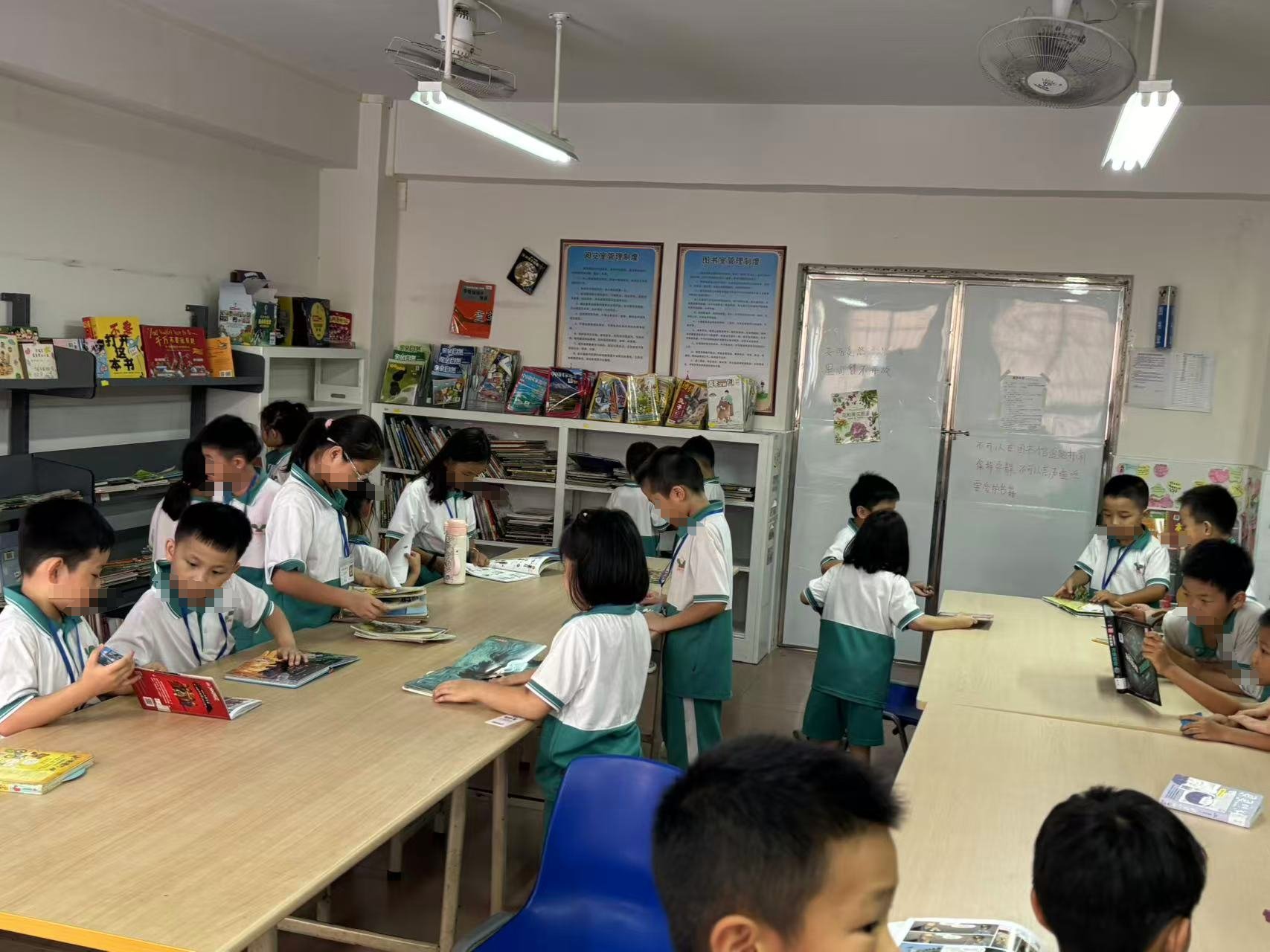 到各班发借书卡。再回到馆里时,发现刚拿到卡的同学已经在馆里找书,有的已借到书,感觉真好。