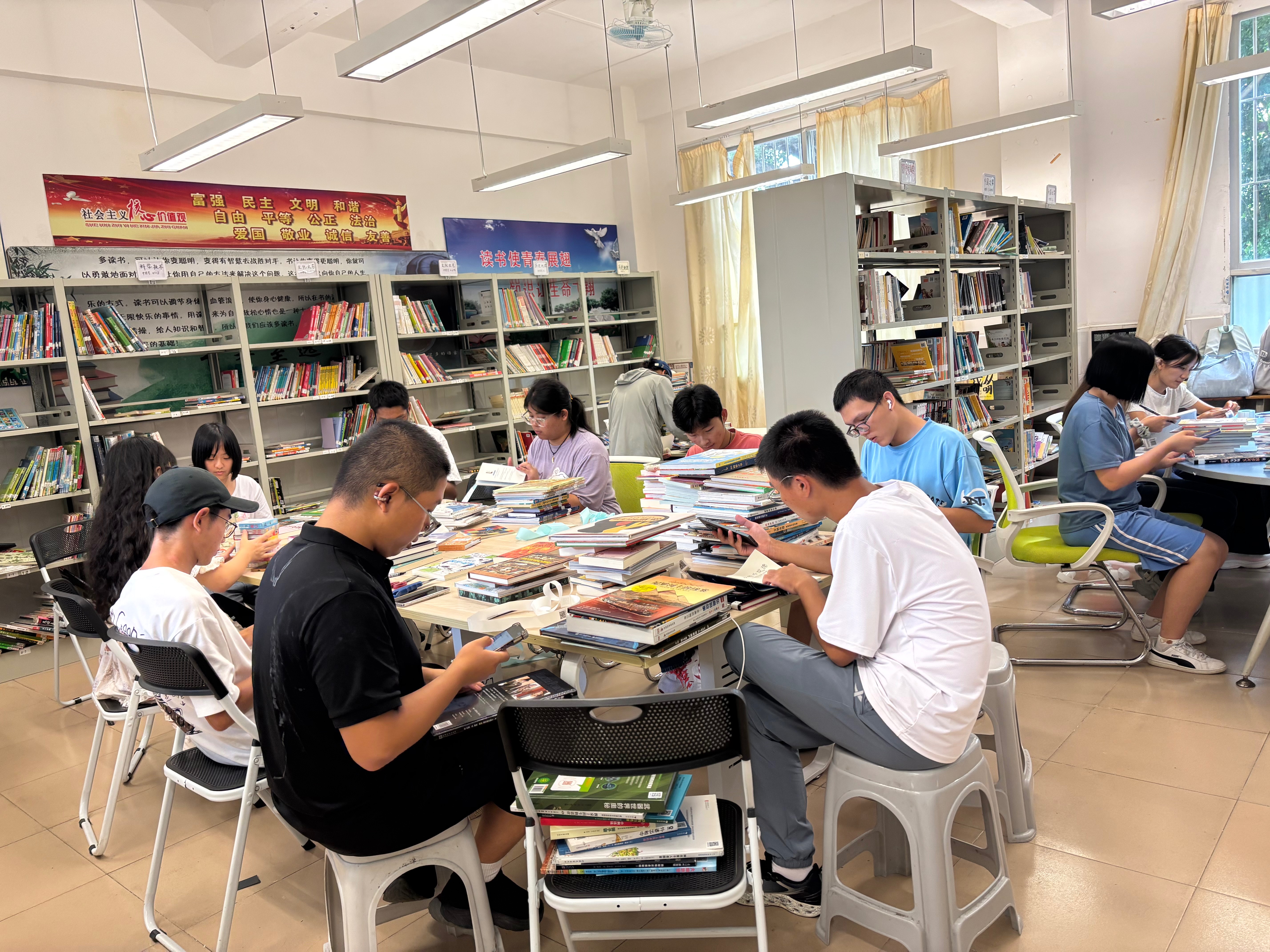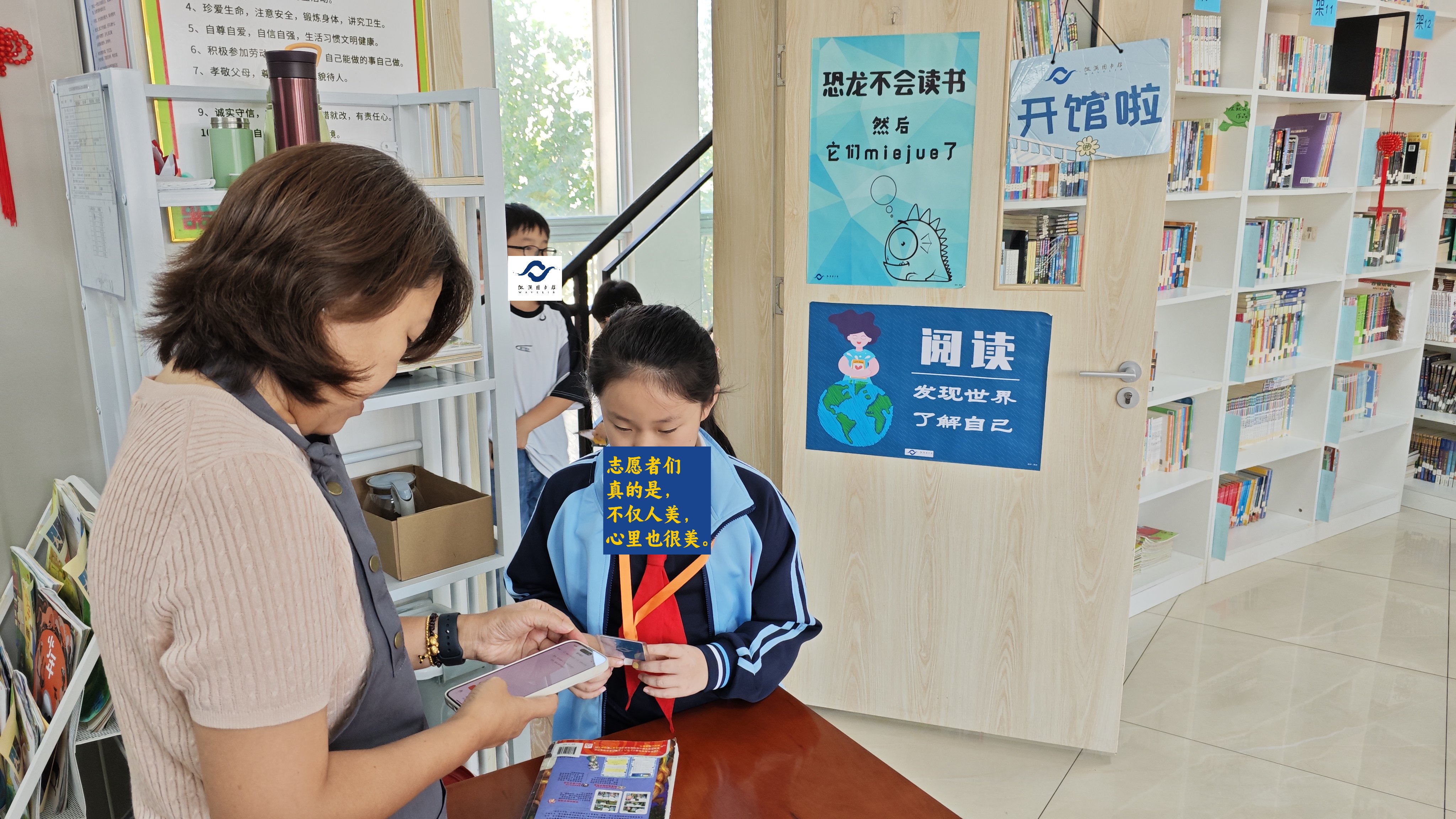 总的来说,虽然和宗老师已是老搭档了,两个人值班还是有些分身乏术,心有余而力不足😂一人兼顾借书和查阅,一人兼顾还书和补卡,常常在课间被同学们团团围住,有些需求和诉求没法听到和满足,偶尔也对同学们感到抱歉。心里不禁大呼,赶紧来个志愿者吧🥹🙏🏻