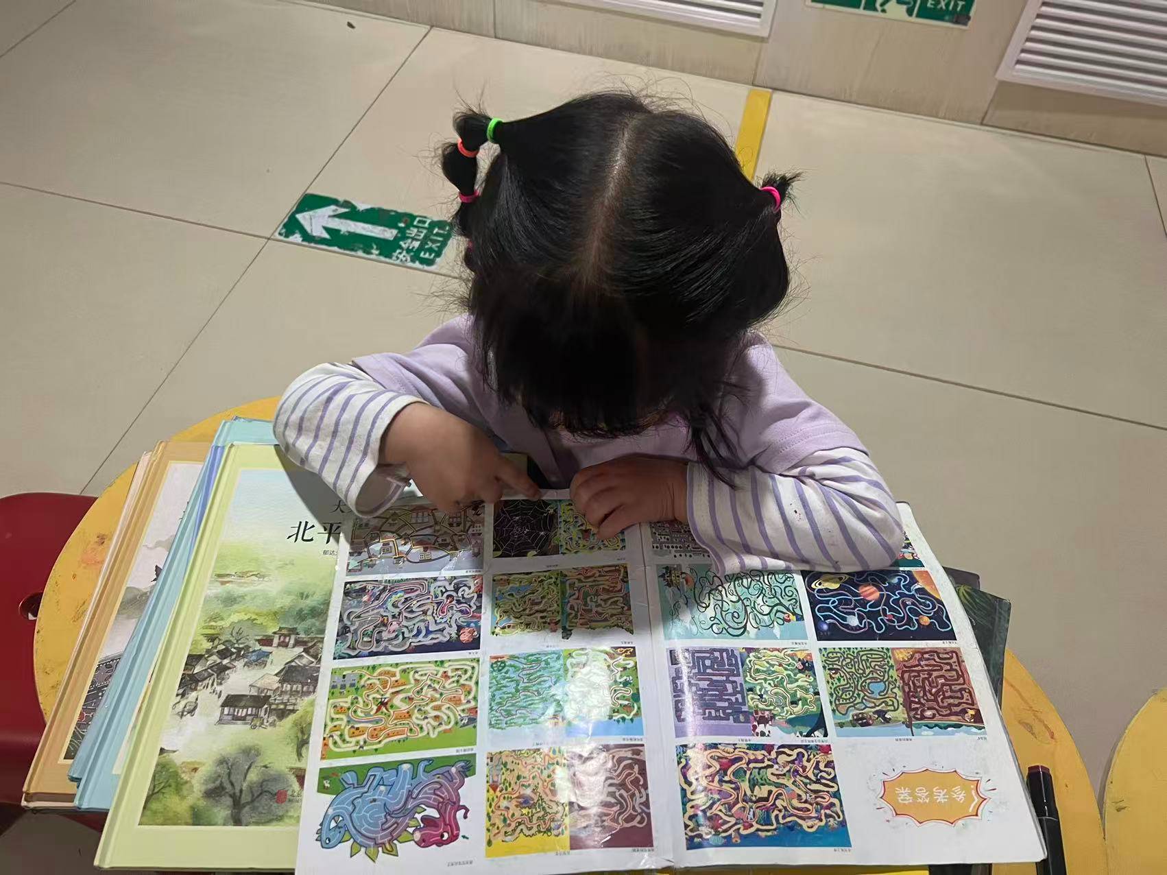 倒是路上遇到rr,主动打了招呼,和妈妈yr一起来图书馆呆了一会儿,我摆好桌椅,正好带了烤地瓜和烤土豆,和小姑娘一起吃了,简单的话语她都听得懂,但比如铺平纸才好画画,就不好说了,总之,今天引导打开笔帽,动手画了线,一圈一圈很会画,不过妈妈好像遇到什么事情突然就带她离开了,说回去一会儿,之后没有再来。