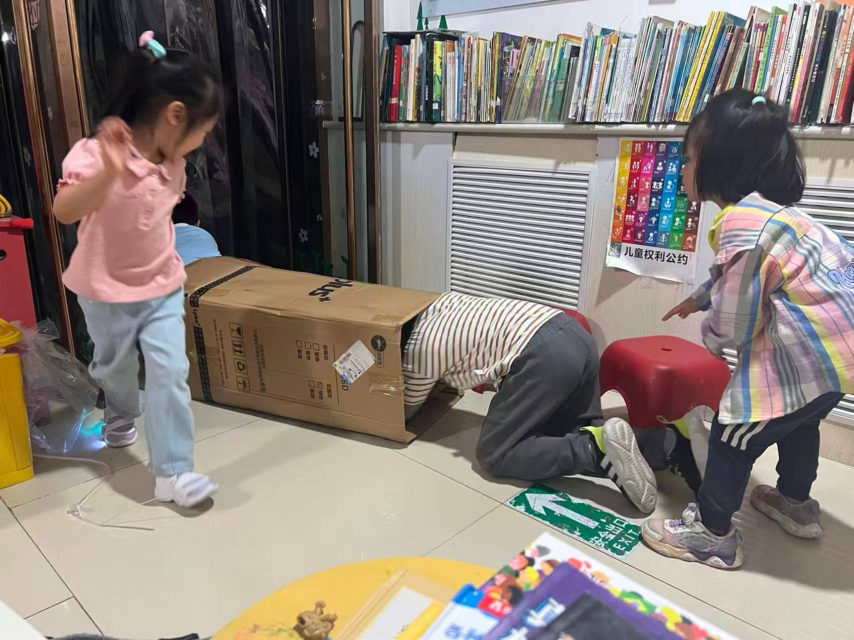 之后mm和zx来,三个人一起读了一整本迷宫,答案页mm页看得很顺畅。。熟悉的孩子们也都来,也有孩子只是来玩的,一晚上倒是热闹。八点多想起快递,拜托孩子们去取,因为有大包装箱,提议箱子可以做玩具后,孩子们简直疯了,哈哈哈,当管道爬,后来周老师剪了洞口,孩子们一个一个穿上走路,还不开心,这时候,感受到童年的快乐好简单好纯粹啊,被感染了。