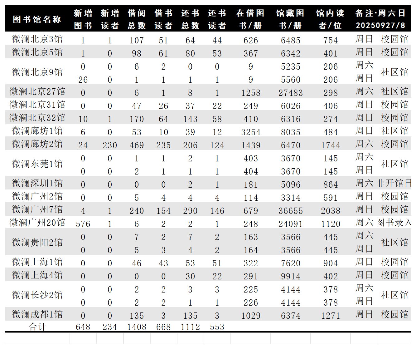 各馆数据日报202500927/8/周六日: