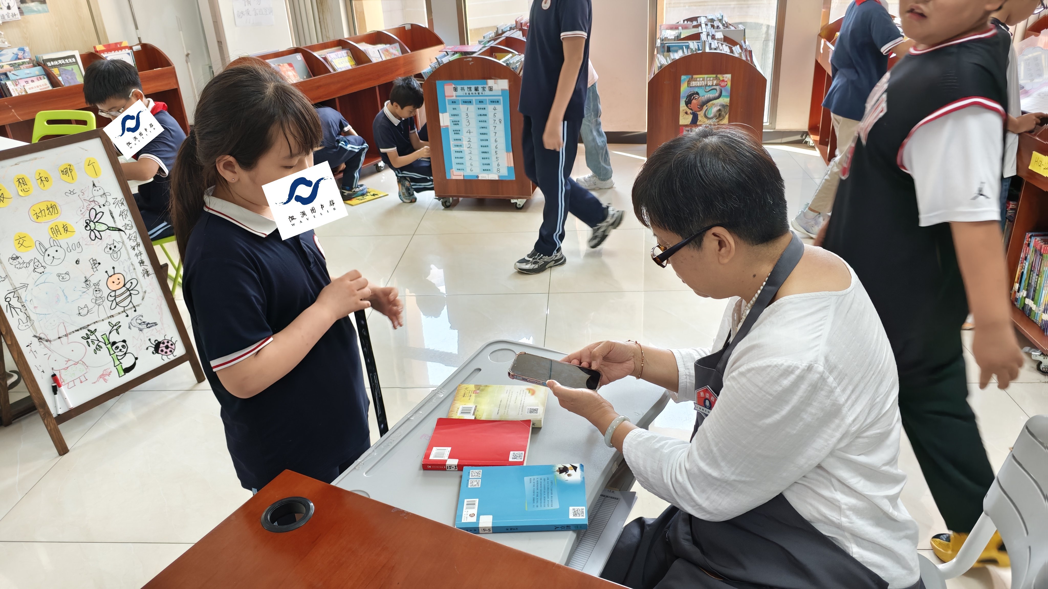 制卡发卡,借阅归还,上架;孩子交流。