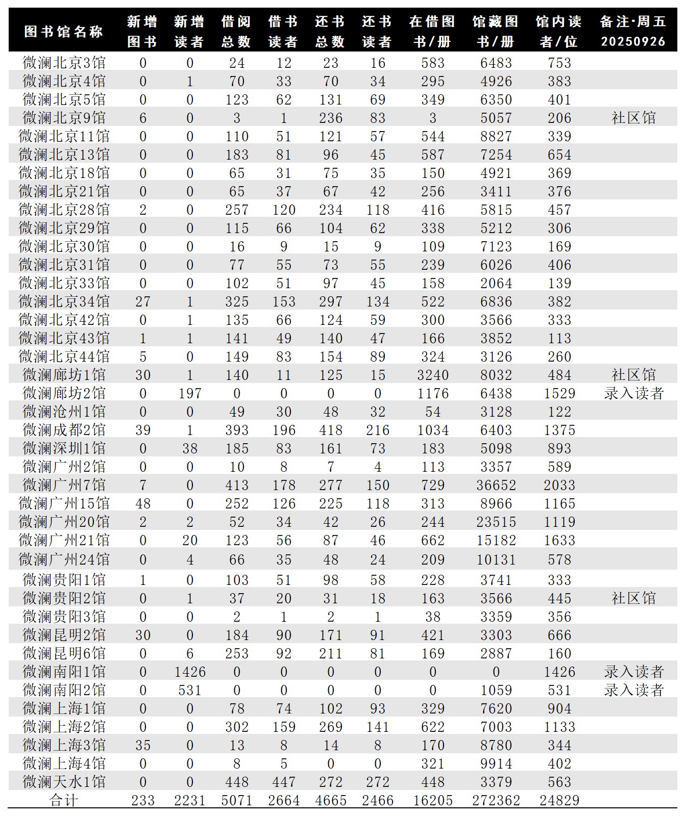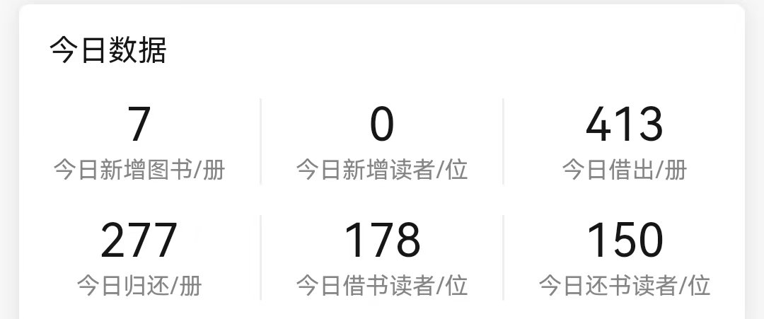 37所图书馆开放借阅,为2664位读者借阅图书5071册次,处理归还图4665册(2466人);各馆购买/受捐/学校馆藏等录入上架图书233册,各馆录入新读者2231位(包含新馆南阳1、2馆读者1957位)。