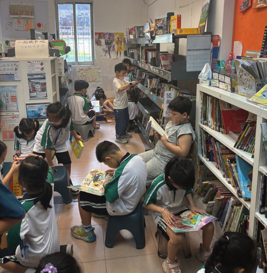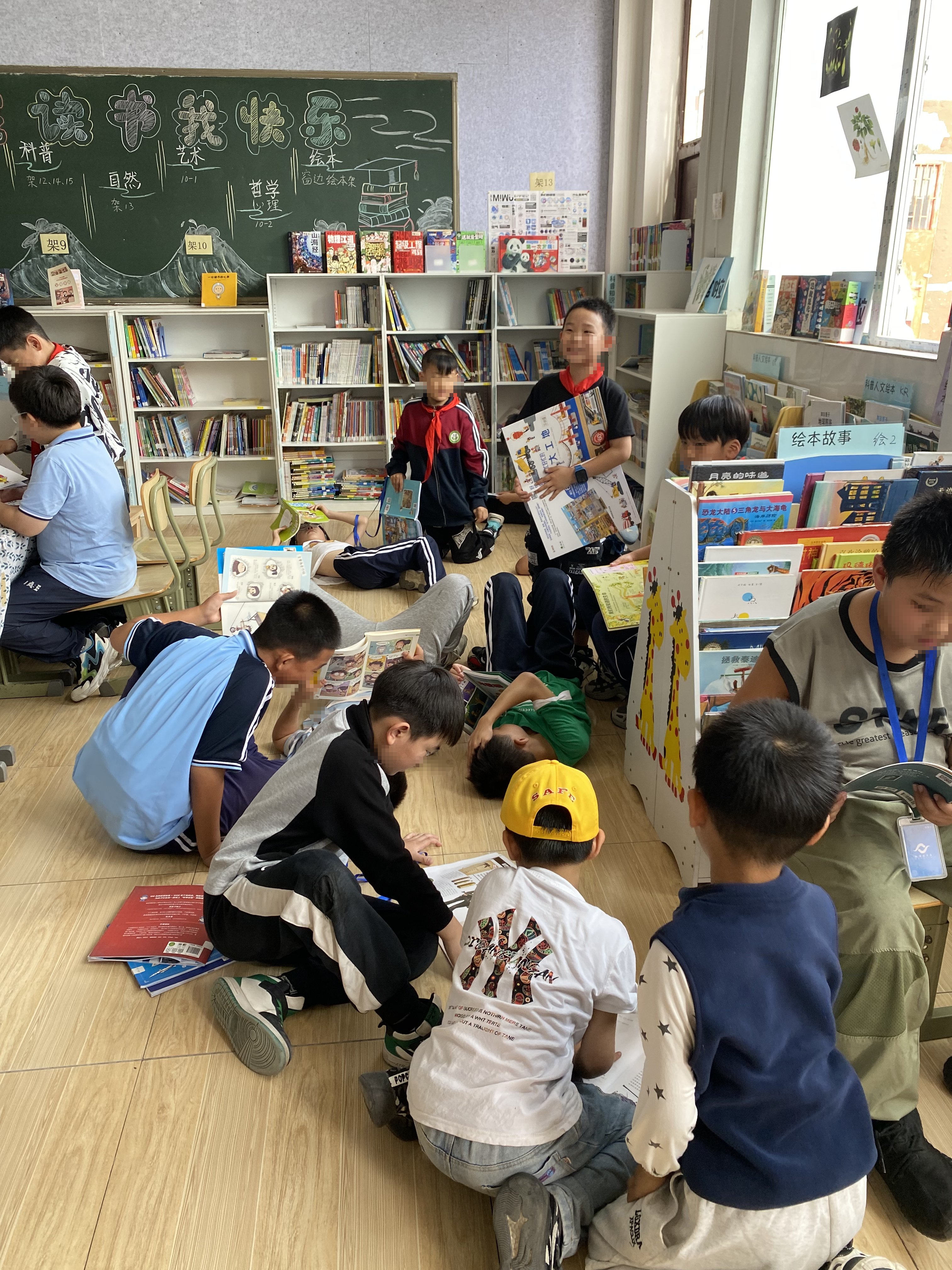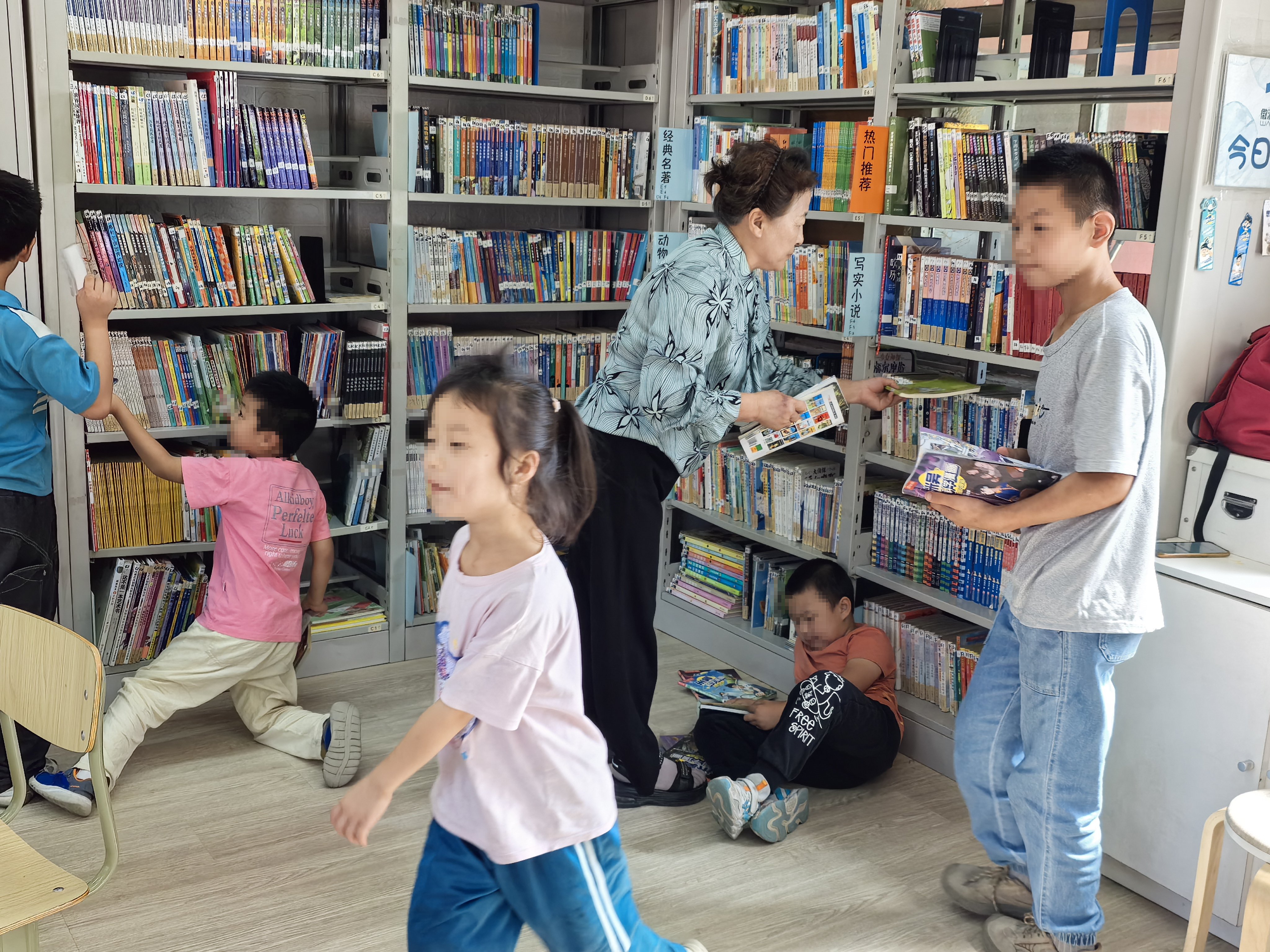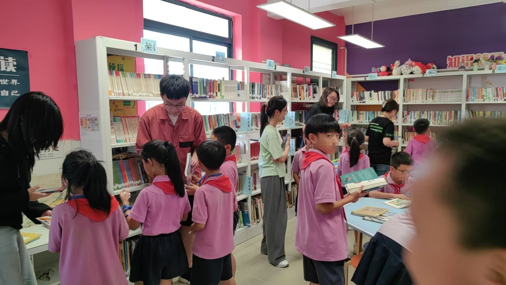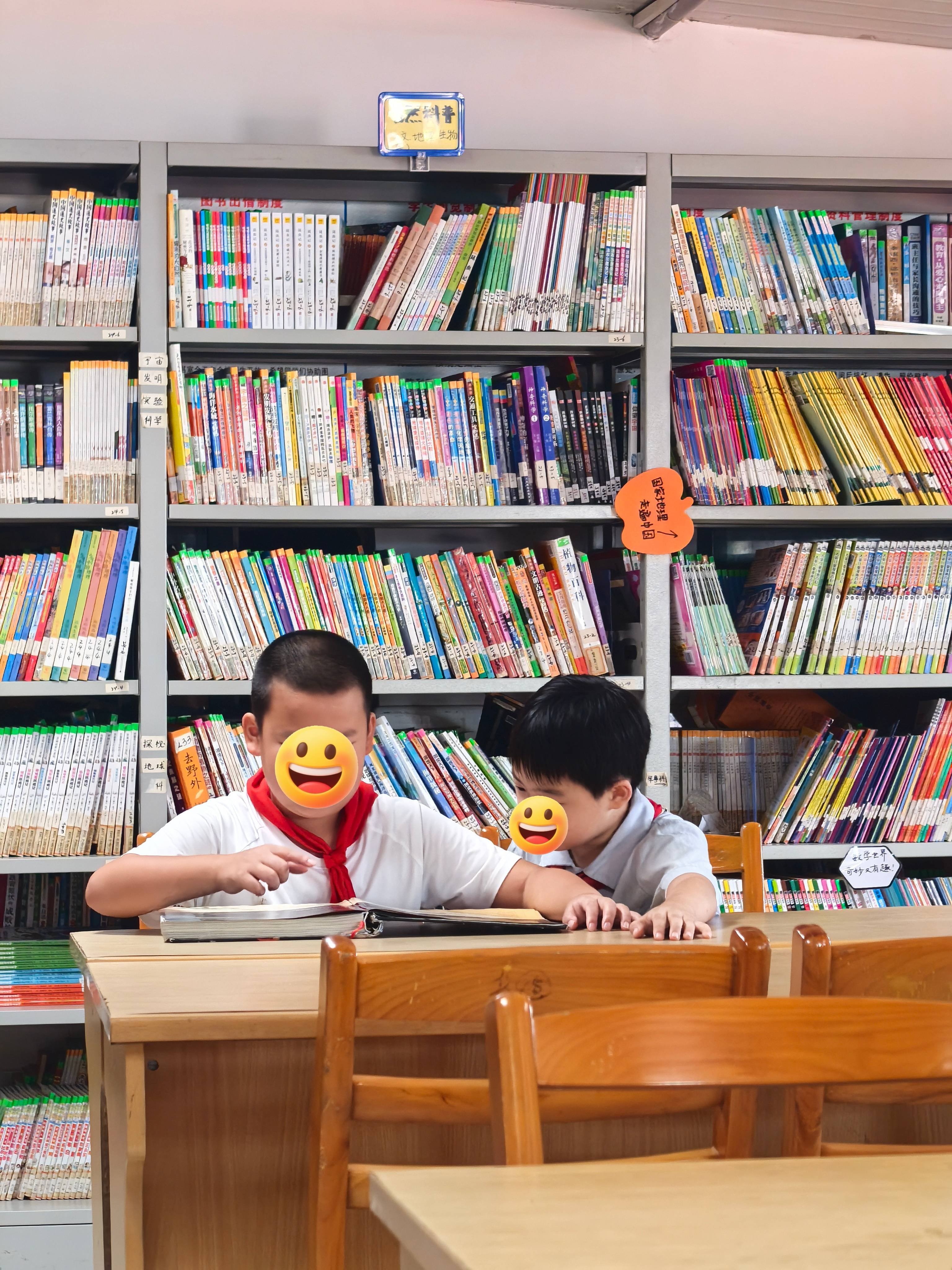 午休时间,馆里恢复了往日的热闹,低年级孩子看书松弛感极强,高年级孩子也少了追逐打闹,或坐着看书或轻声聊天,一派和谐,我们仨借、还、上架分工合作,顺利度过。