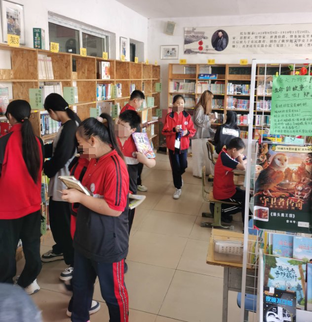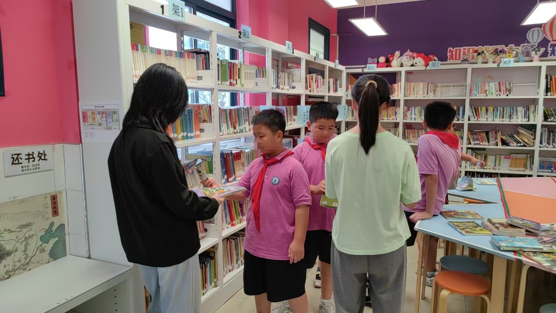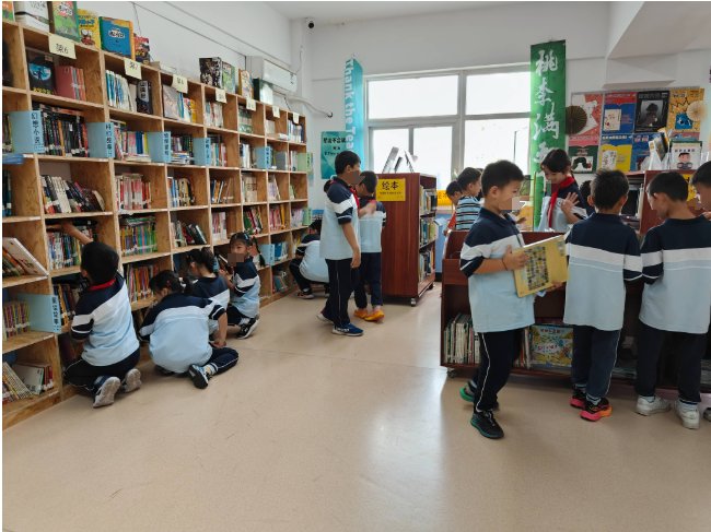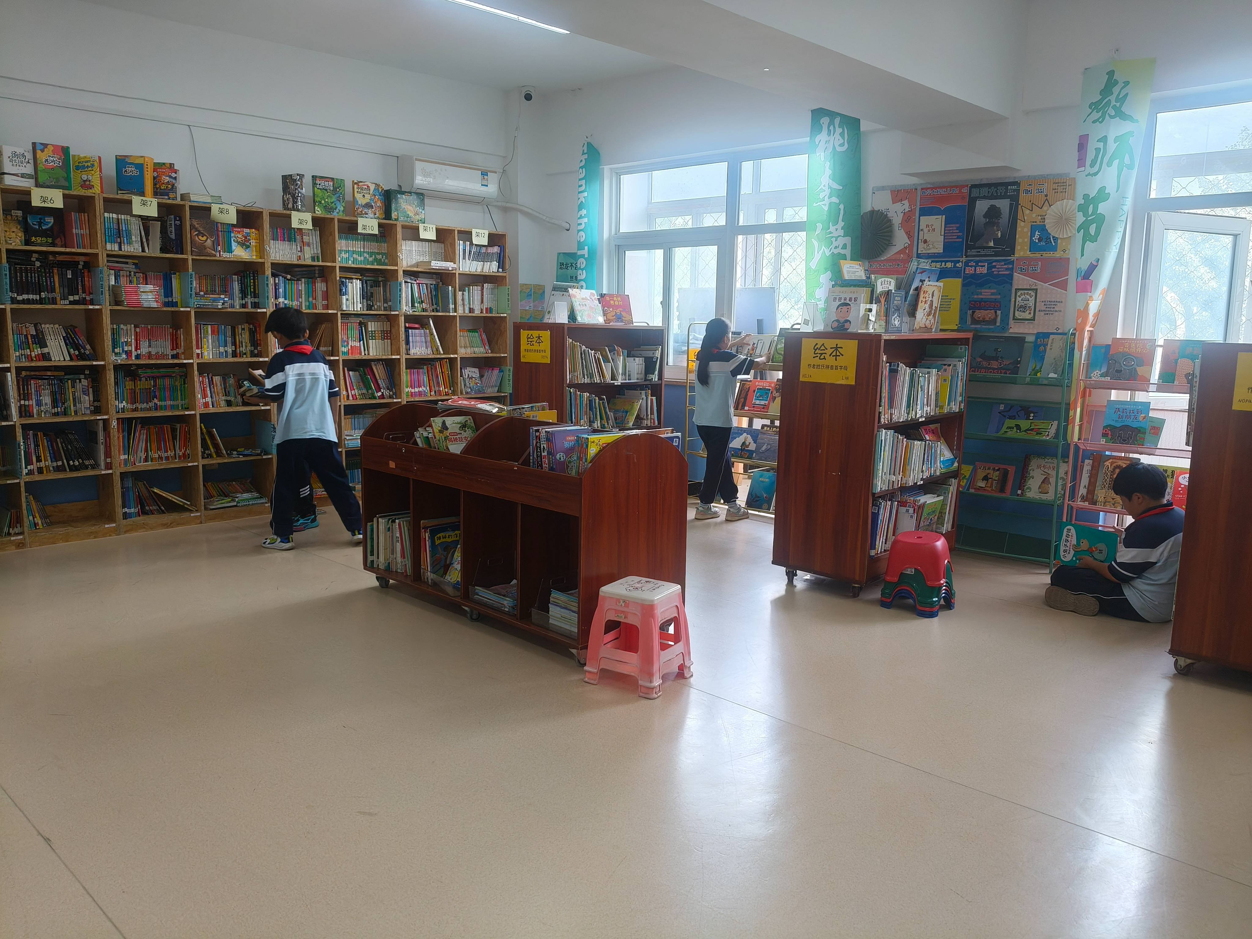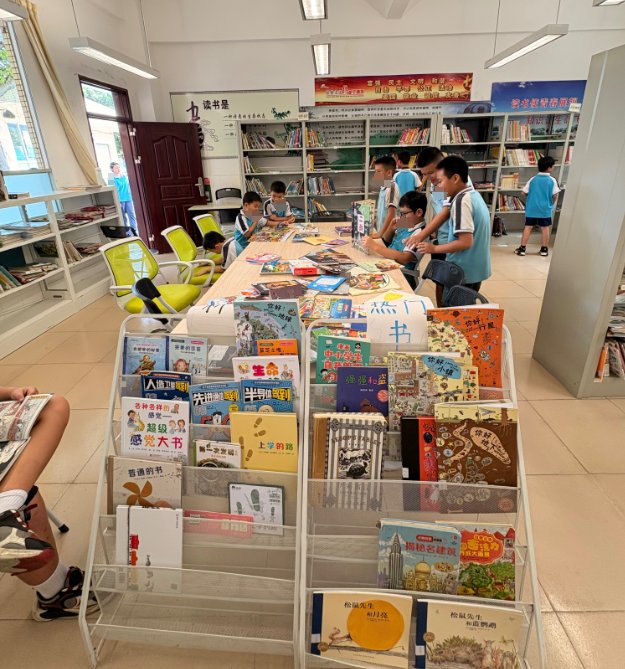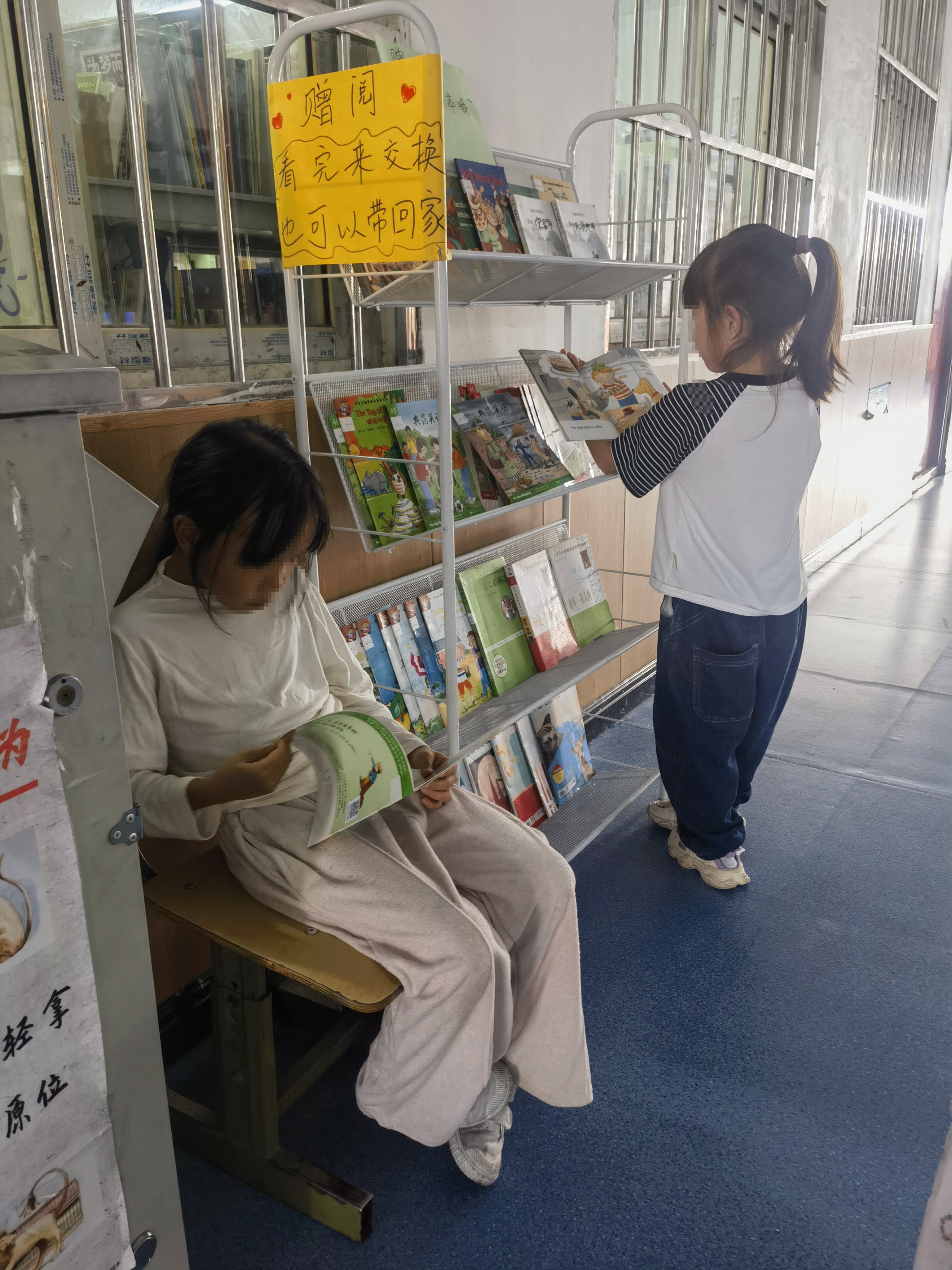 午休时间,馆里恢复了往日的热闹,低年级孩子看书松弛感极强,高年级孩子也少了追逐打闹,或坐着看书或轻声聊天,一派和谐,我们仨借、还、上架分工合作,顺利度过。