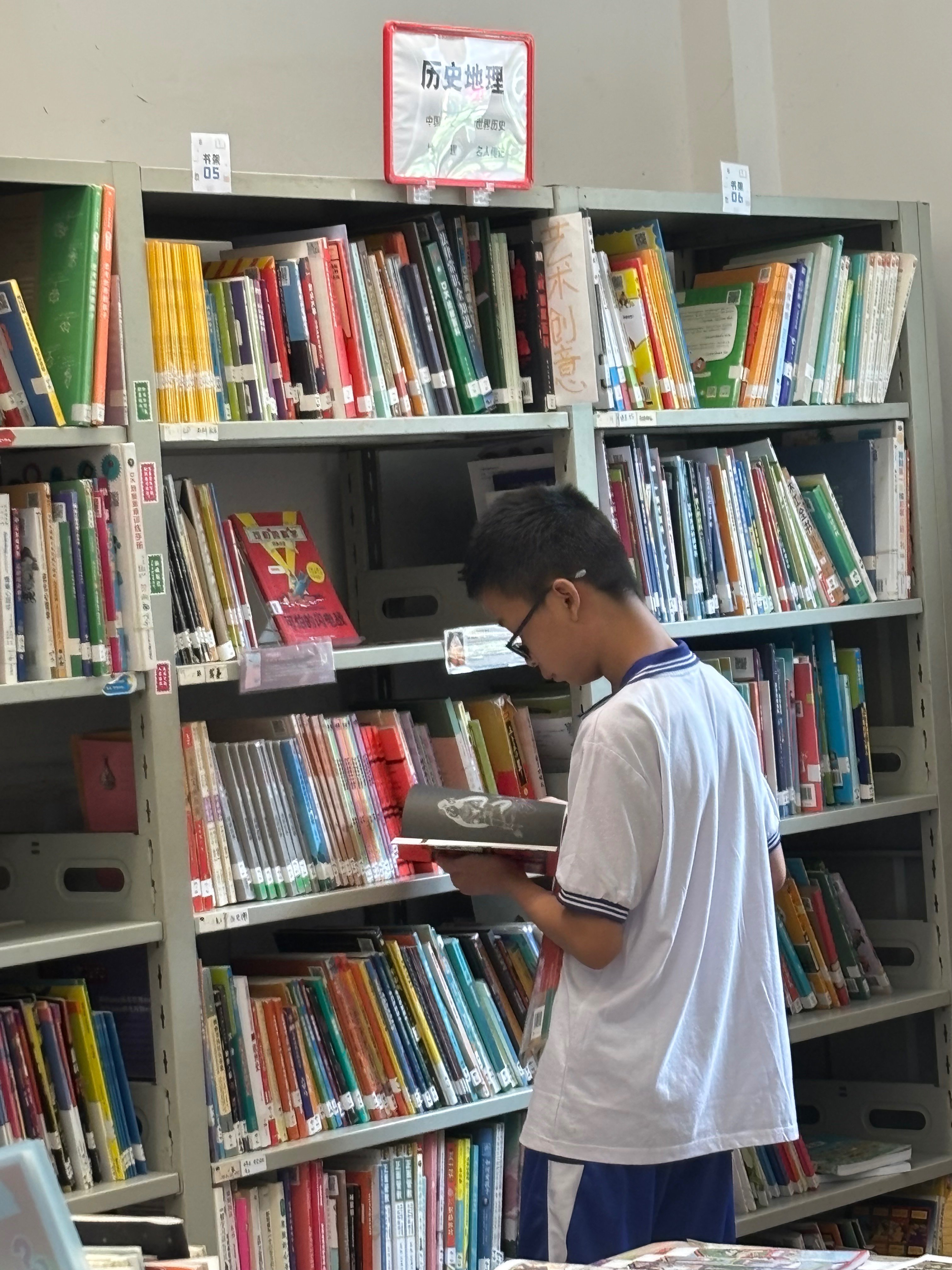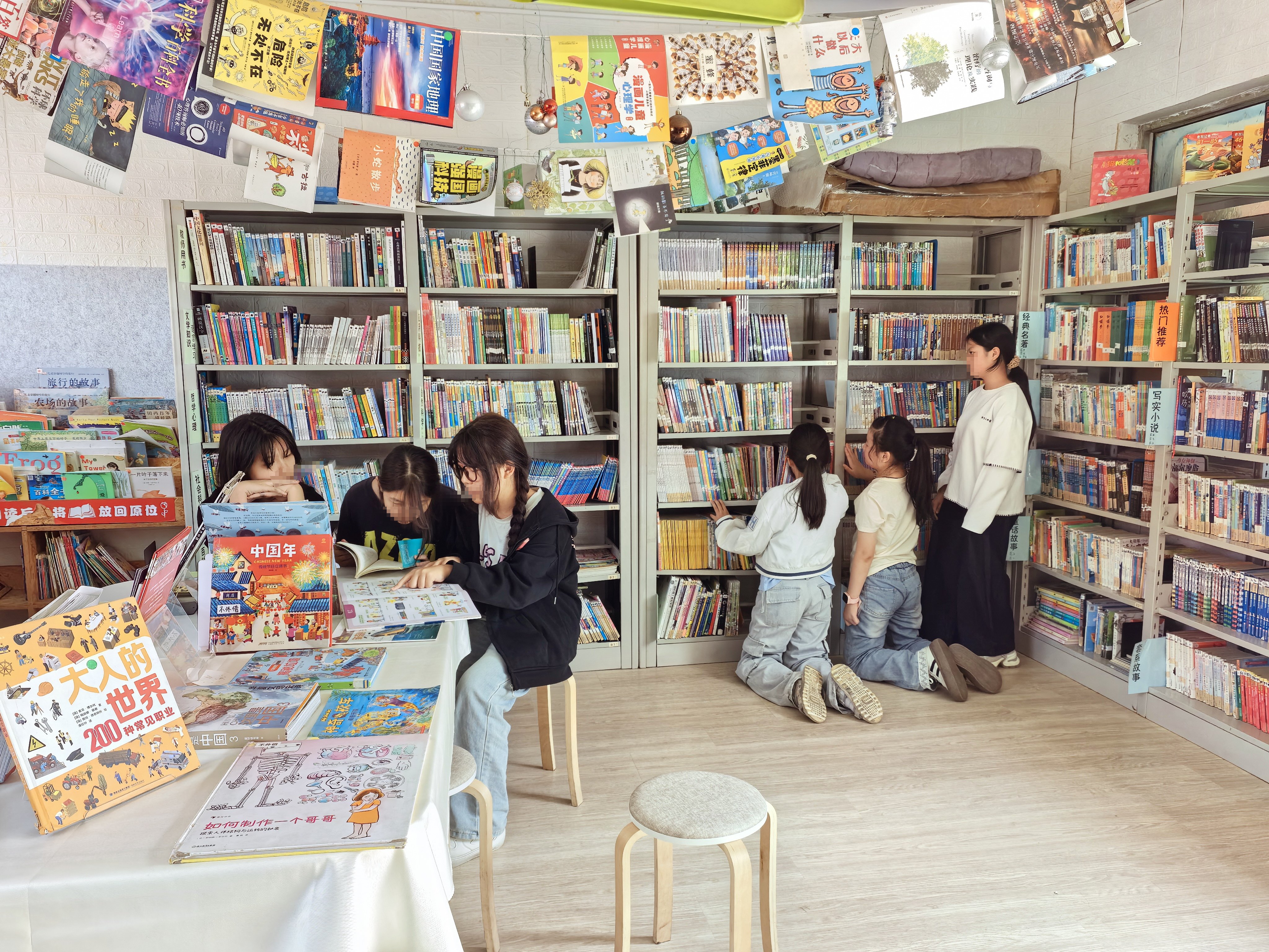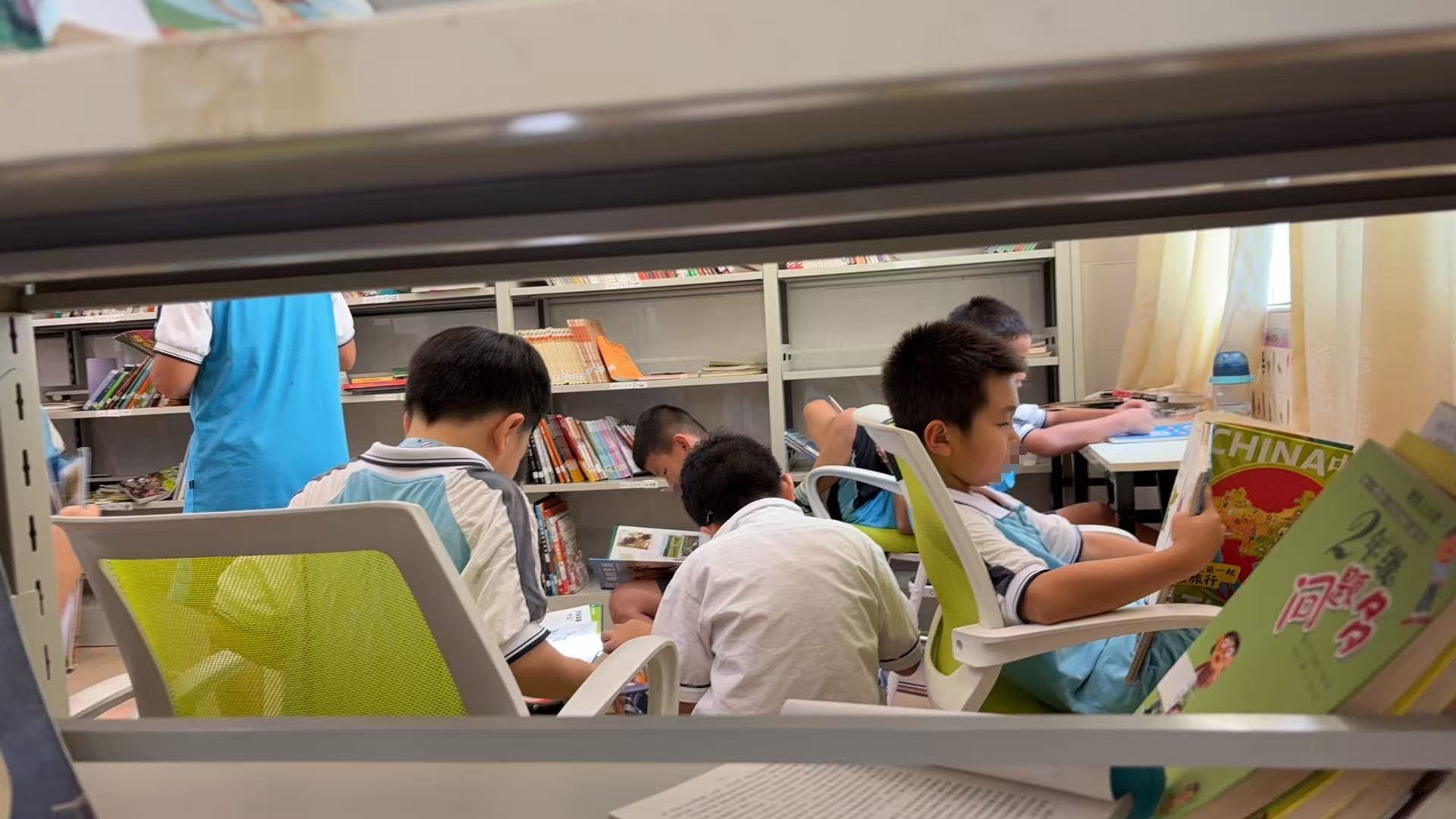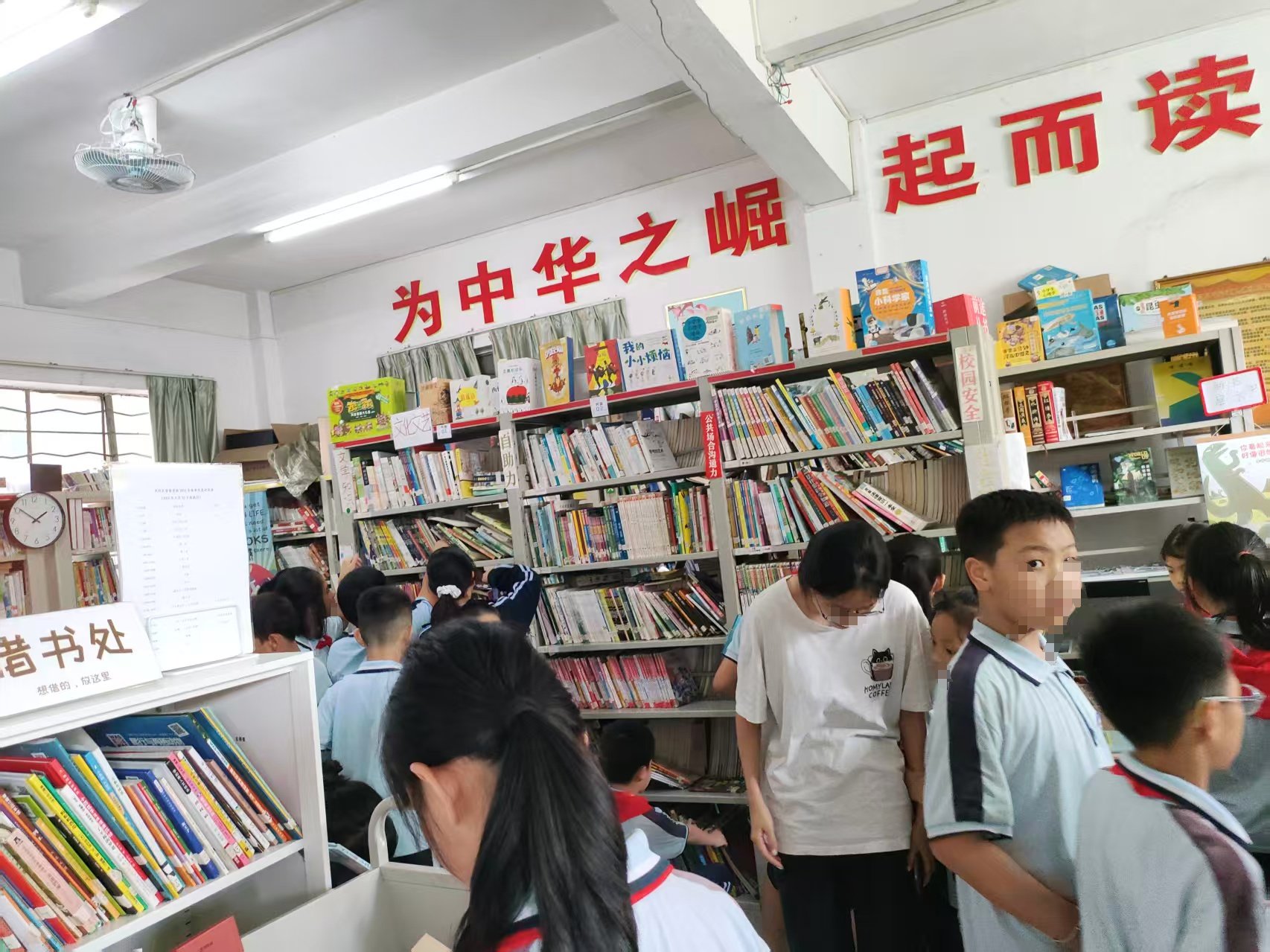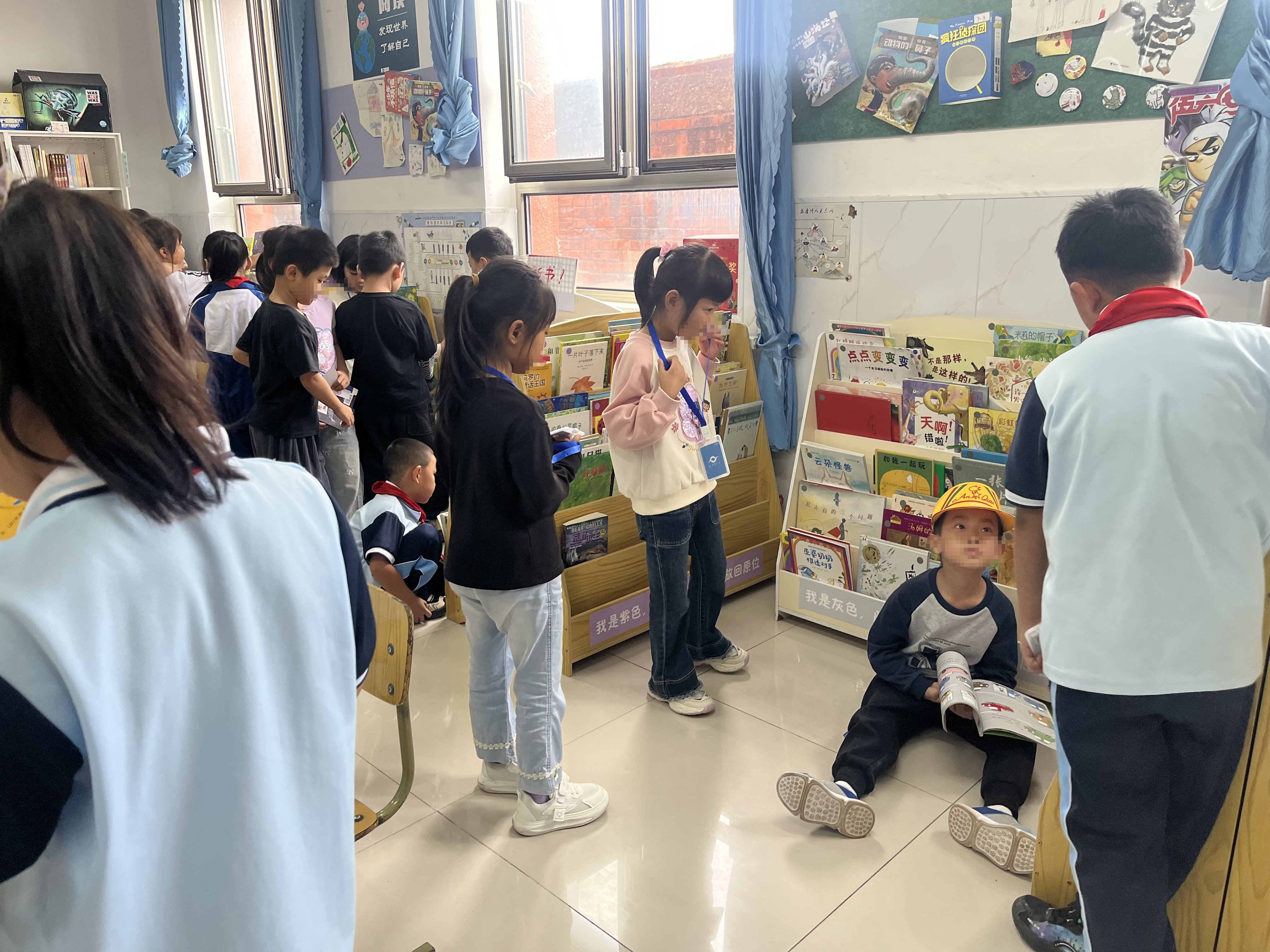 午休时间,馆里恢复了往日的热闹,低年级孩子看书松弛感极强,高年级孩子也少了追逐打闹,或坐着看书或轻声聊天,一派和谐,我们仨借、还、上架分工合作,顺利度过。