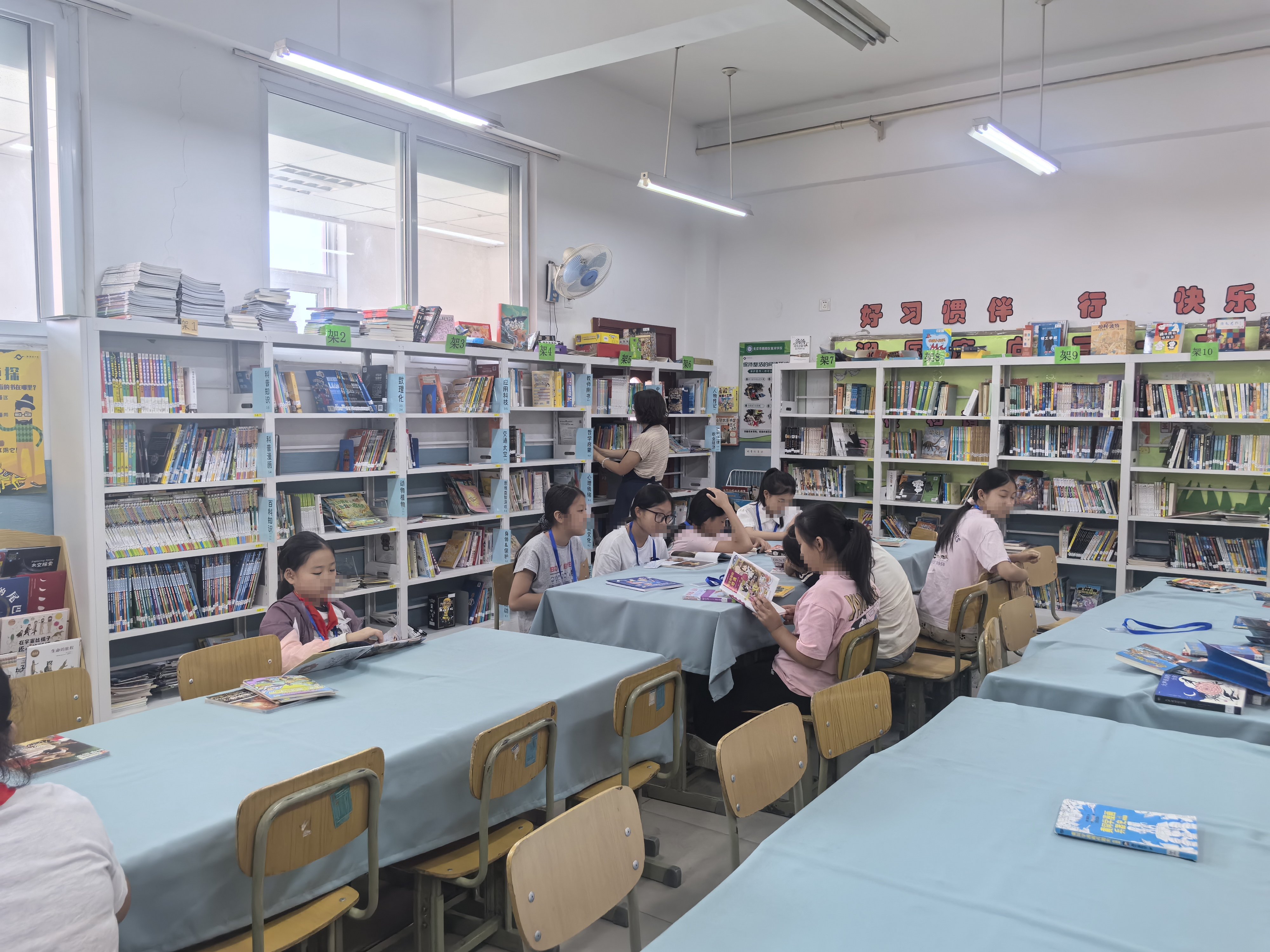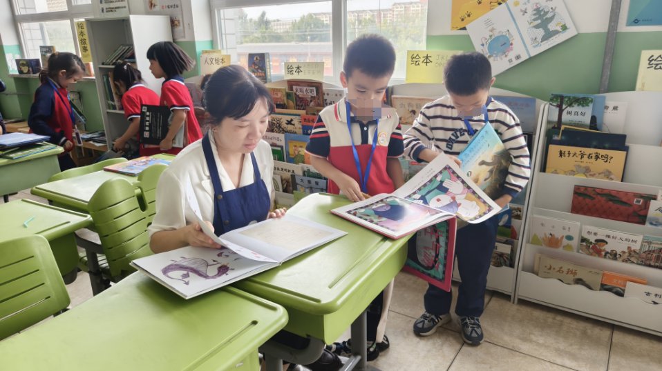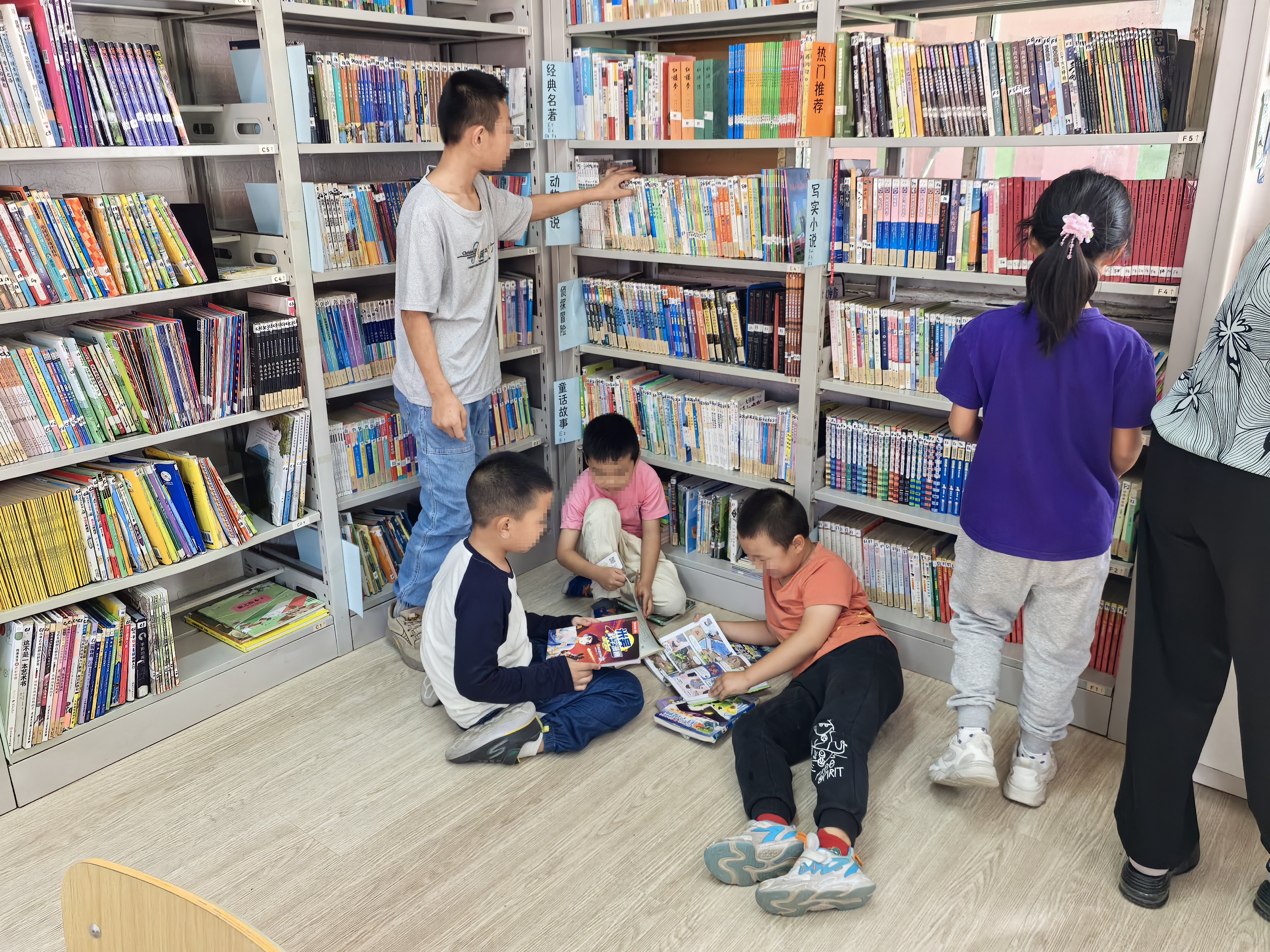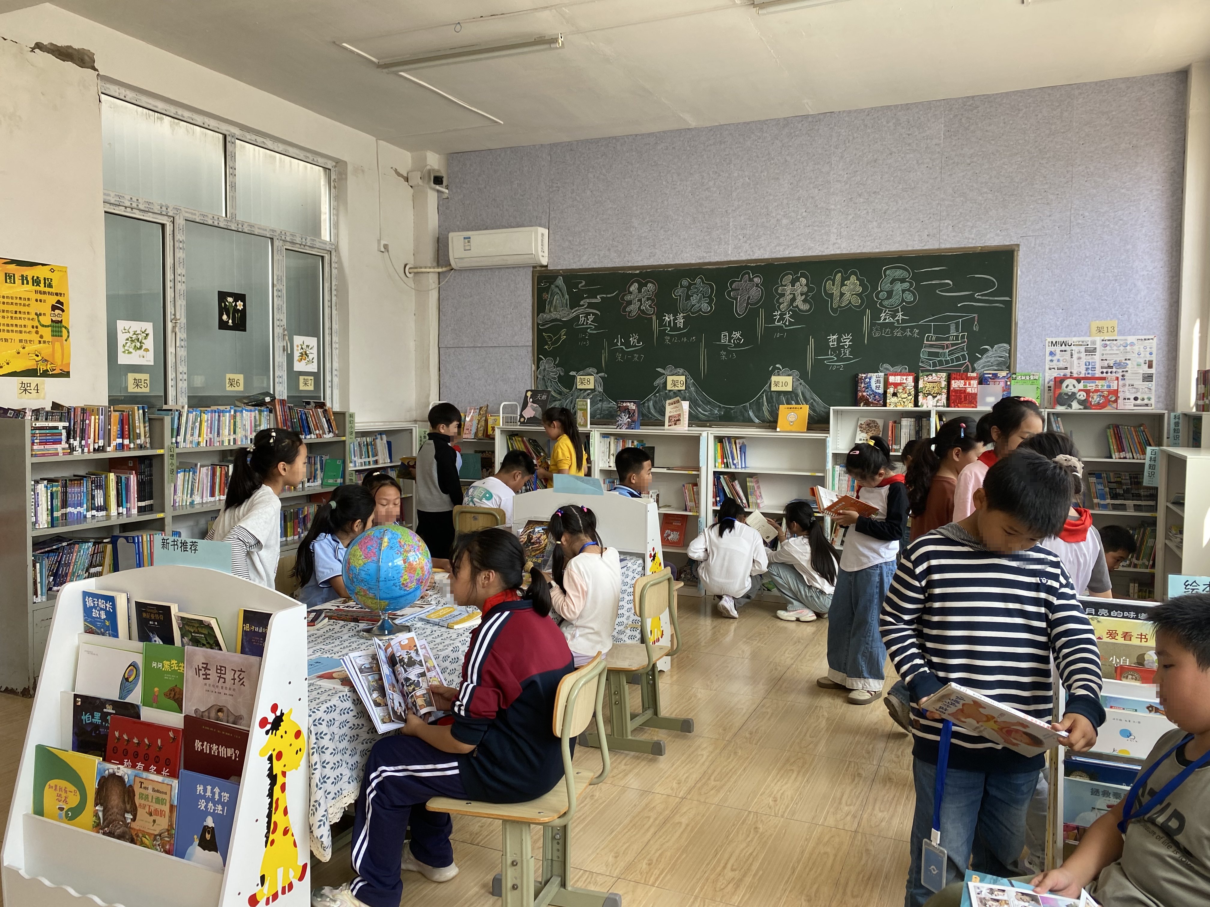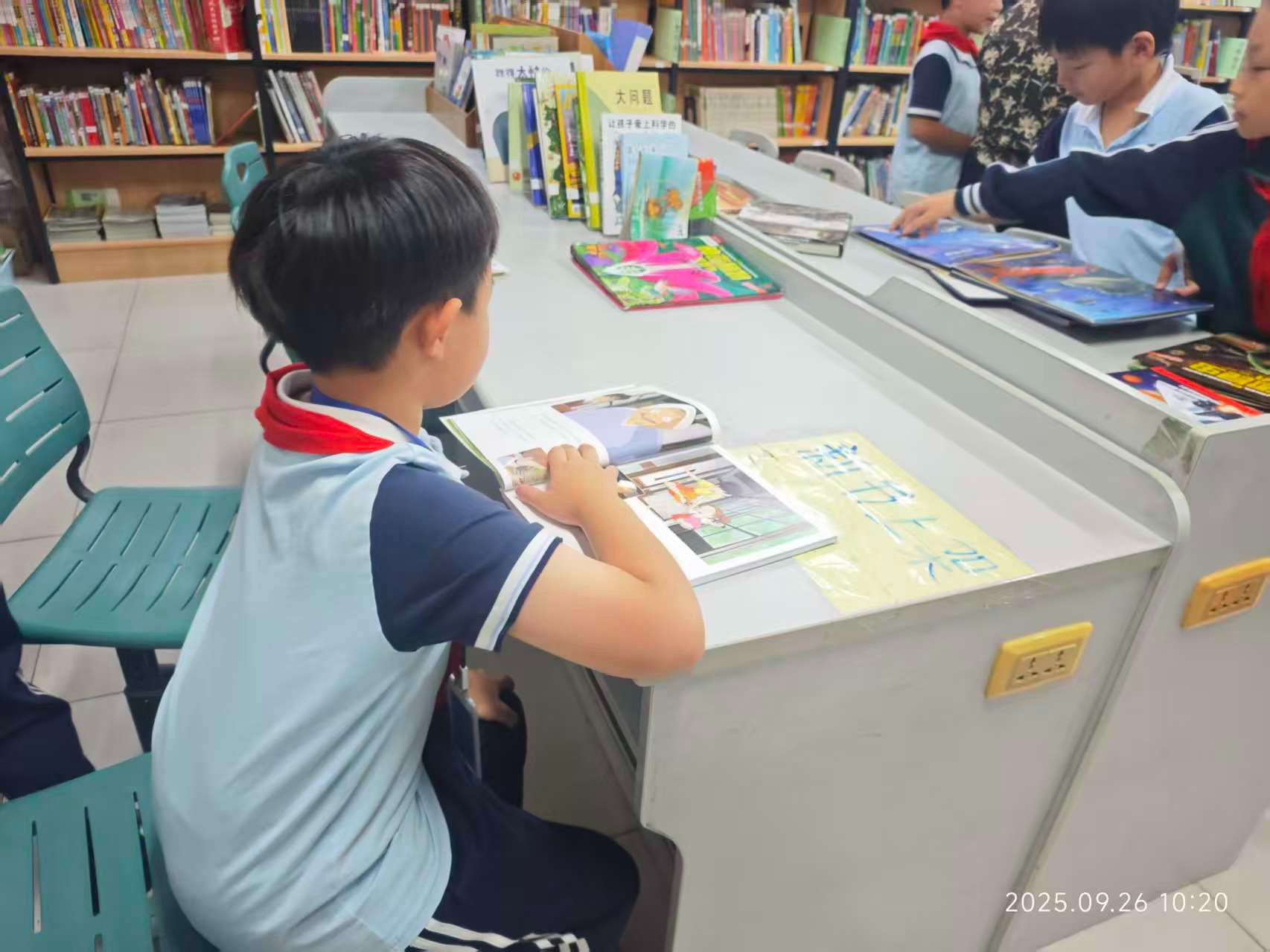 午休时间,馆里恢复了往日的热闹,低年级孩子看书松弛感极强,高年级孩子也少了追逐打闹,或坐着看书或轻声聊天,一派和谐,我们仨借、还、上架分工合作,顺利度过。