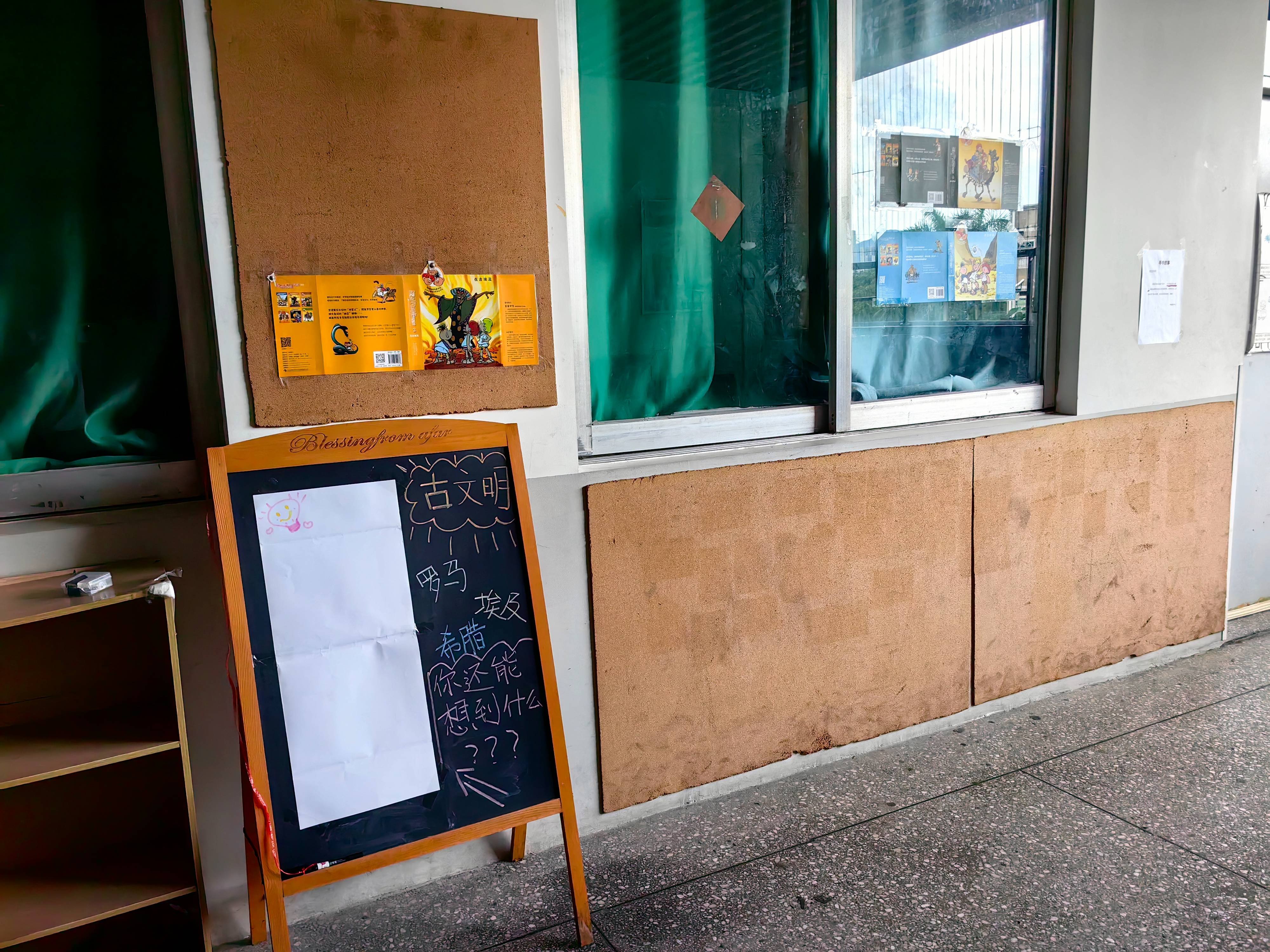 超强台风“桦加沙”过后,馆内地面有一点水,整体没受风雨侵入/渗入,只是馆外的各种海报更旧了。撤下来后,张贴了三张新书海报,Jesse很快就做好的小黑板的相应引导性布置。