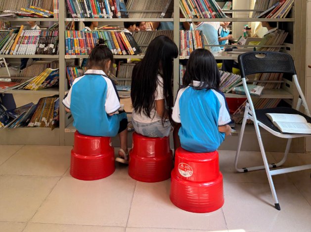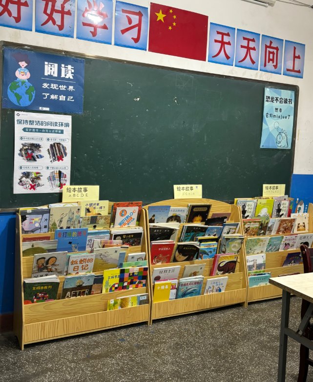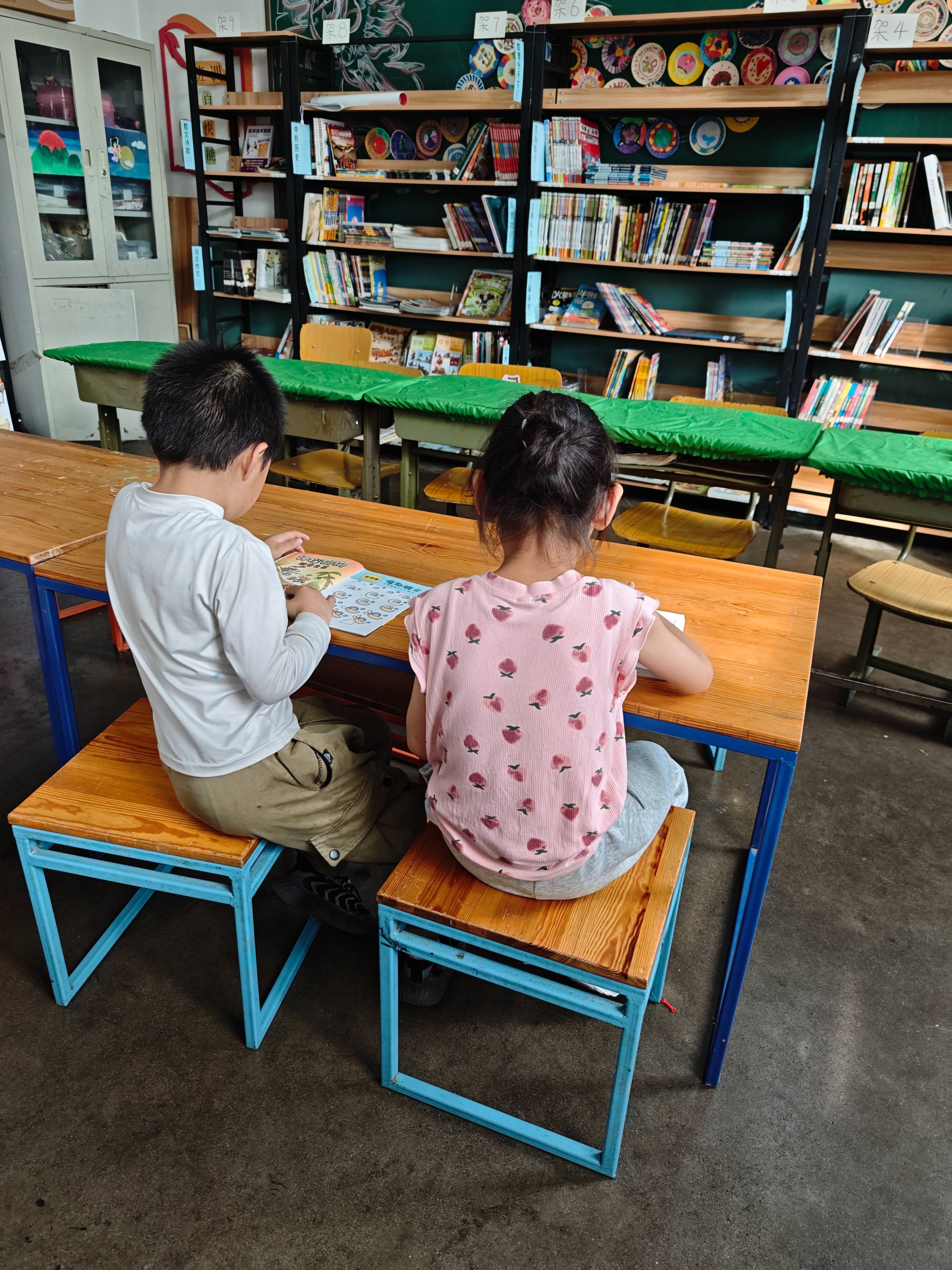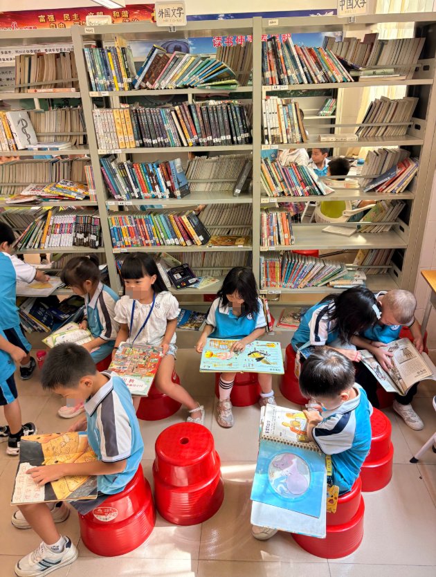 下午有阅读课,三个老师看管,有些孩子被要求不能看书,趴在桌子上写小作文。其他孩子找凳子坐,感觉桌子和凳子不搭配,小孩子手拿重重的绘本坐在小板凳上看。桌子少,又偏大