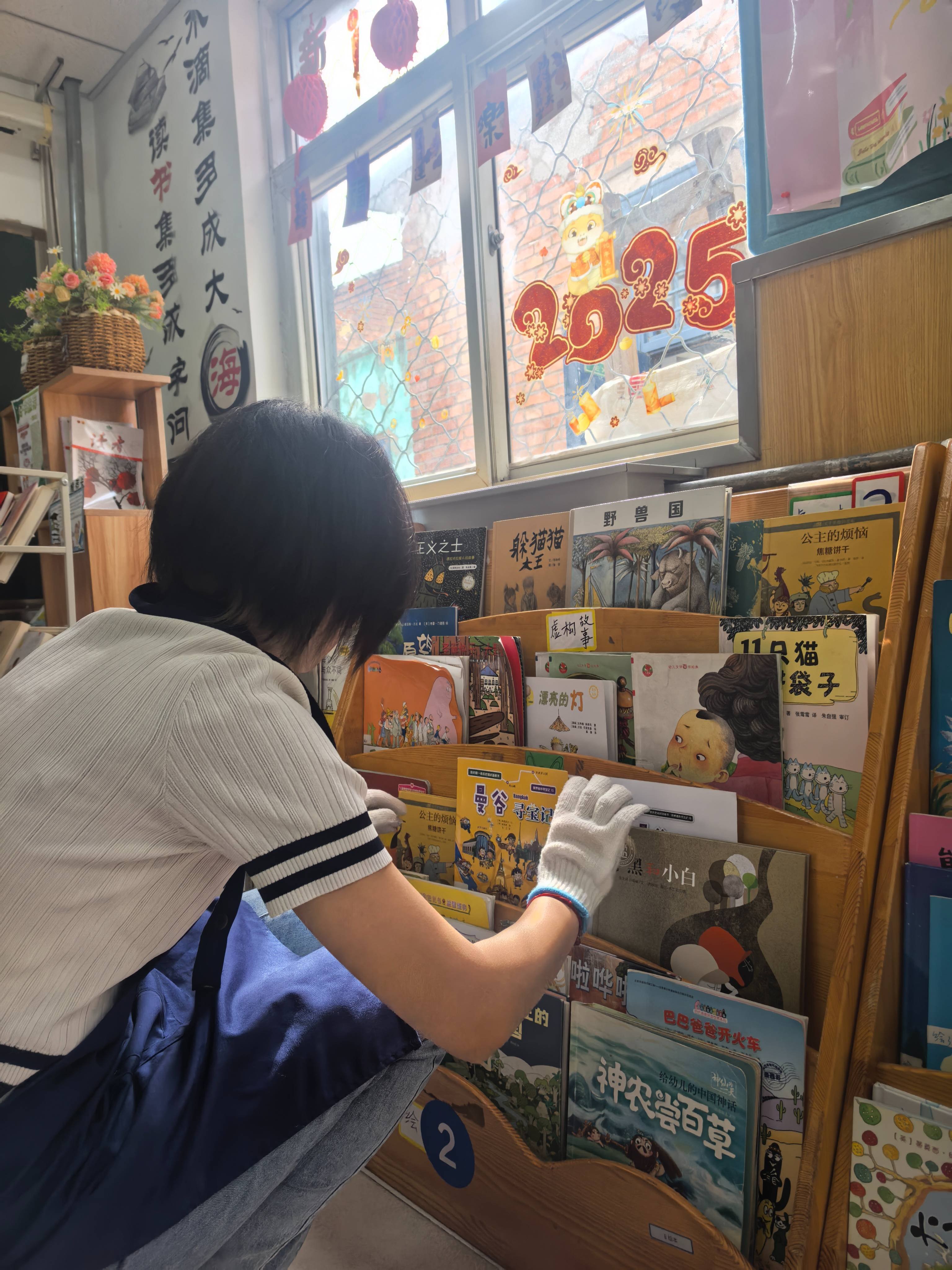 帮助小朋友借、还书;张贴海报;整理书架;对书脊上书架号标记模糊的书进行重补