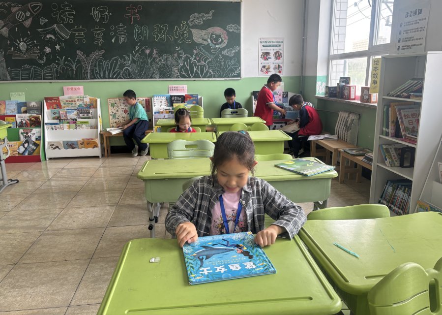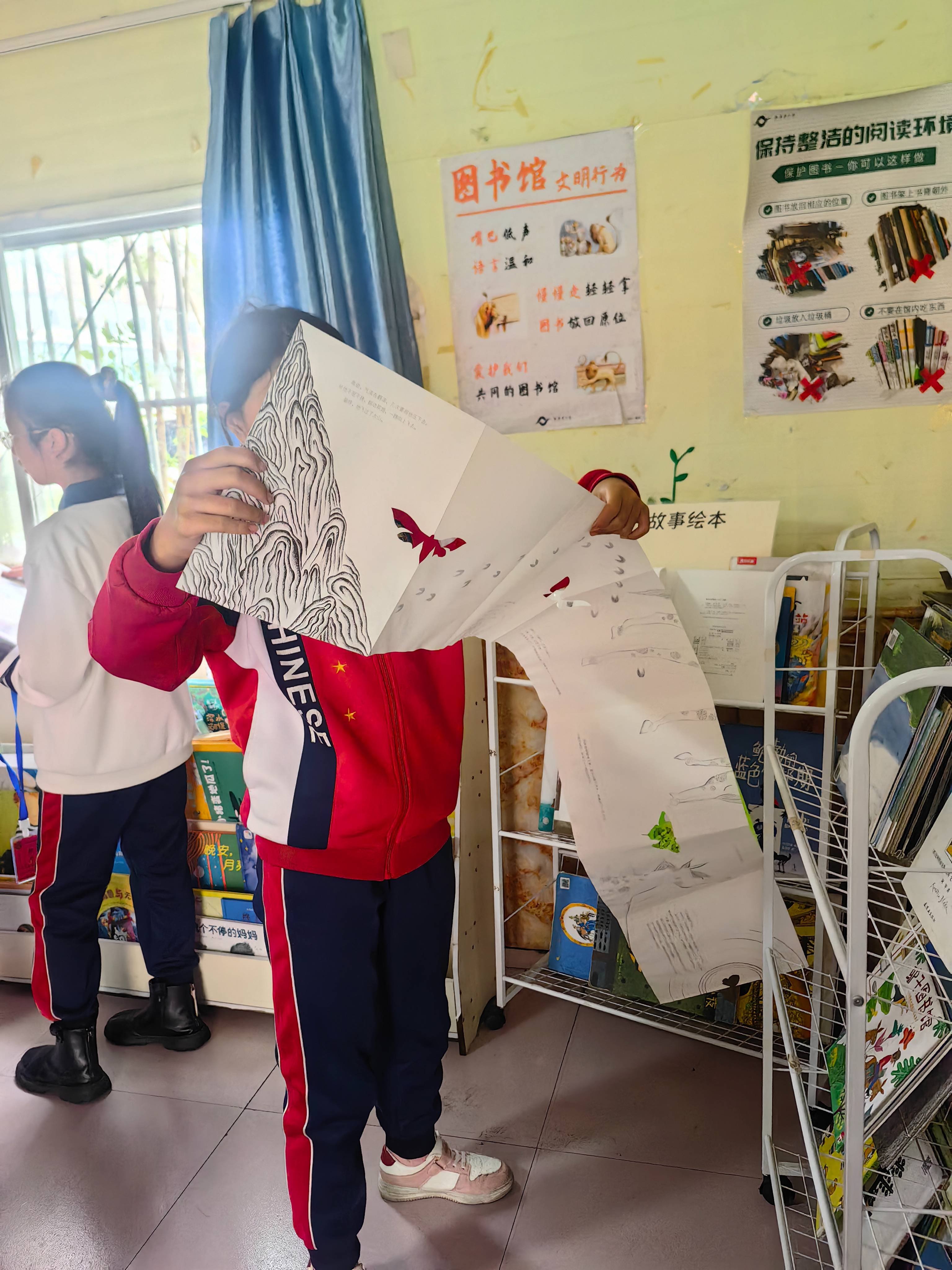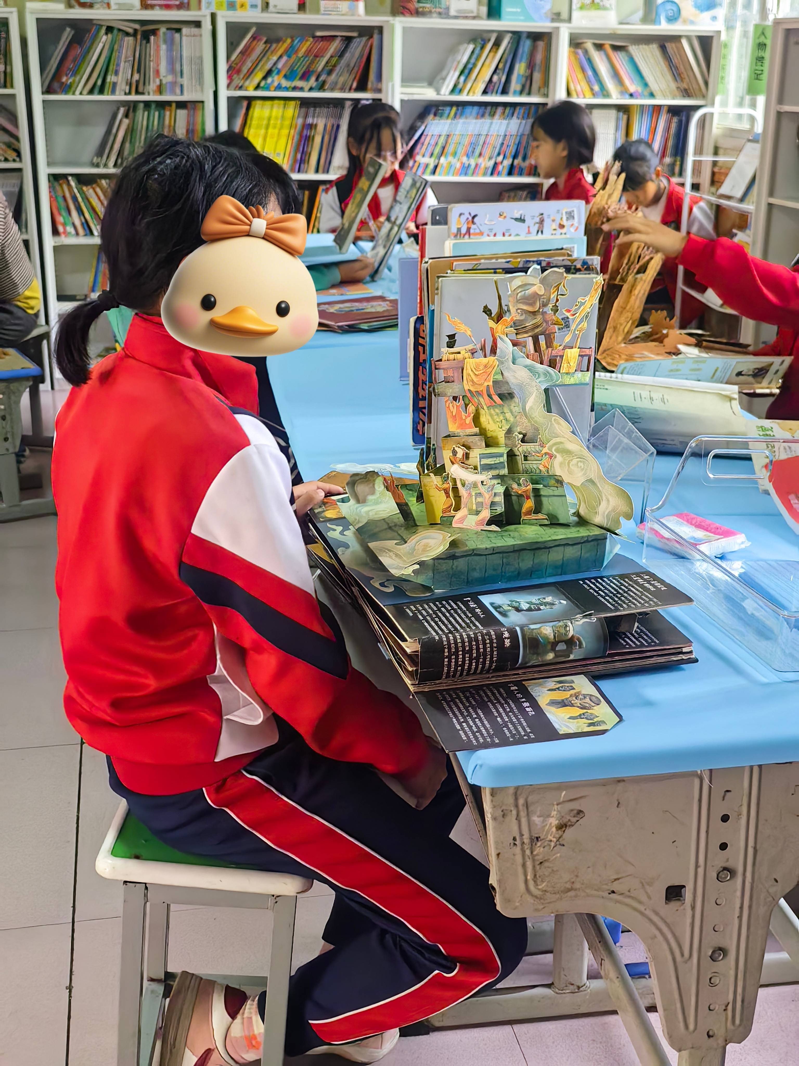 两个小伙伴,随着大课间的音乐节奏一边摇晃,一边挤在一张凳子上共看一本书。一个女孩今天专门在研究立体绘本。愿意走进图书馆的孩子,总有小小的趣味。
