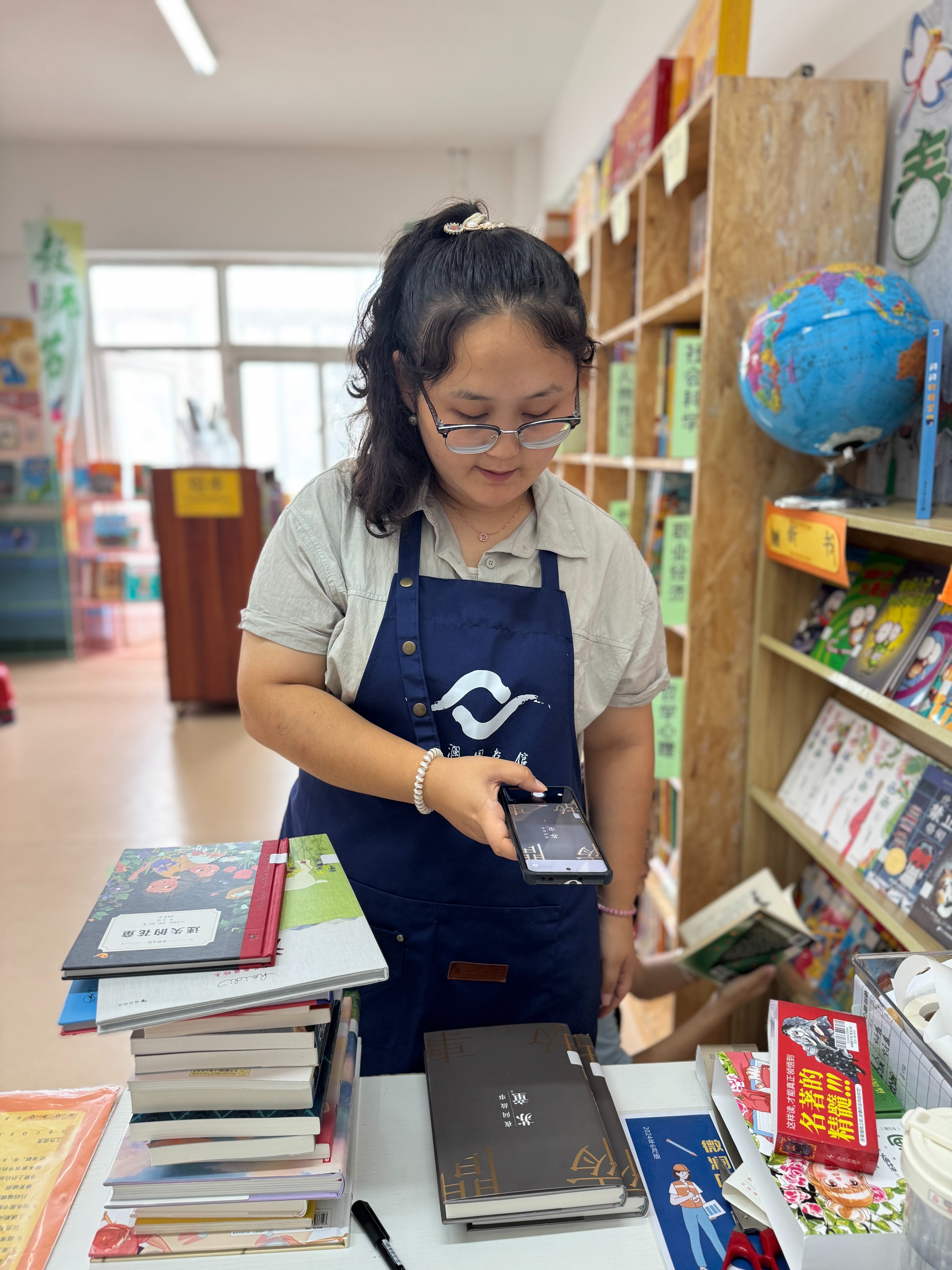 那个喜欢往借书处里面走的小男孩,好奇的围观。我问他想帮忙吗?他说想。我说那做点什么呢?他说你做什么我做什么。于是我们一起开始撕二手书后面的多抓鱼二维码。他真的好会撕,我说你可真厉害,这么快。他说我可是中国速度。满满骄傲。