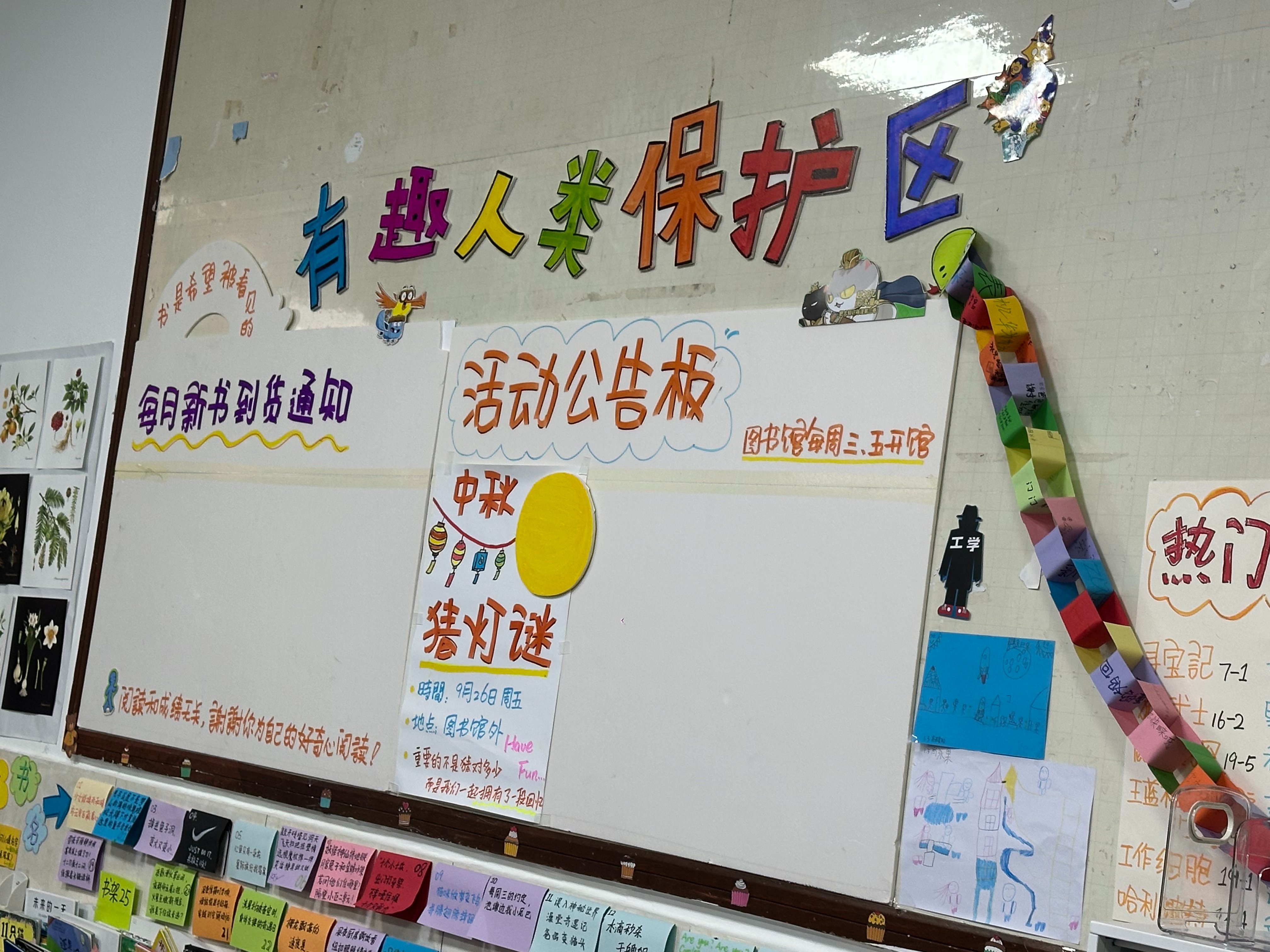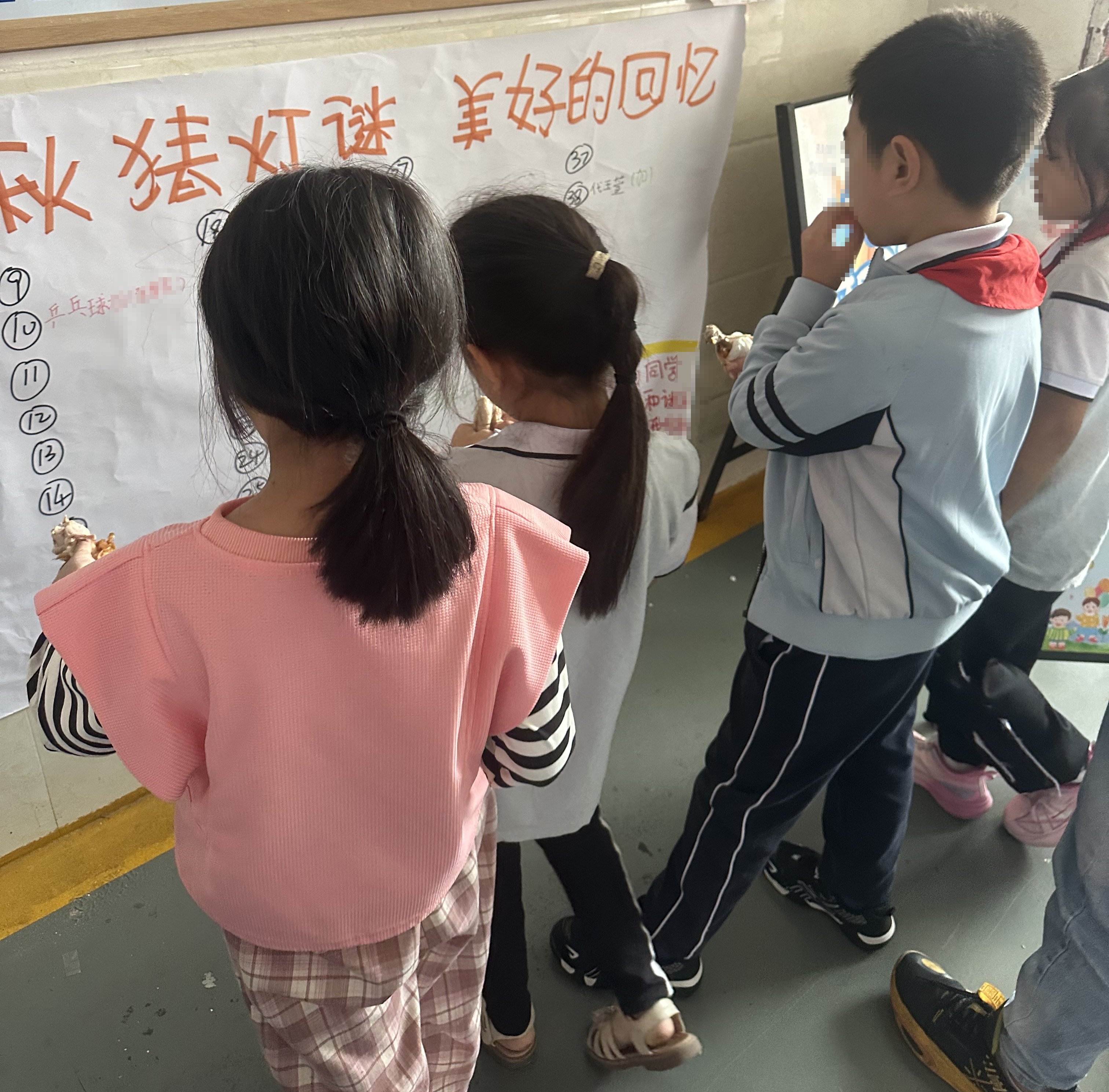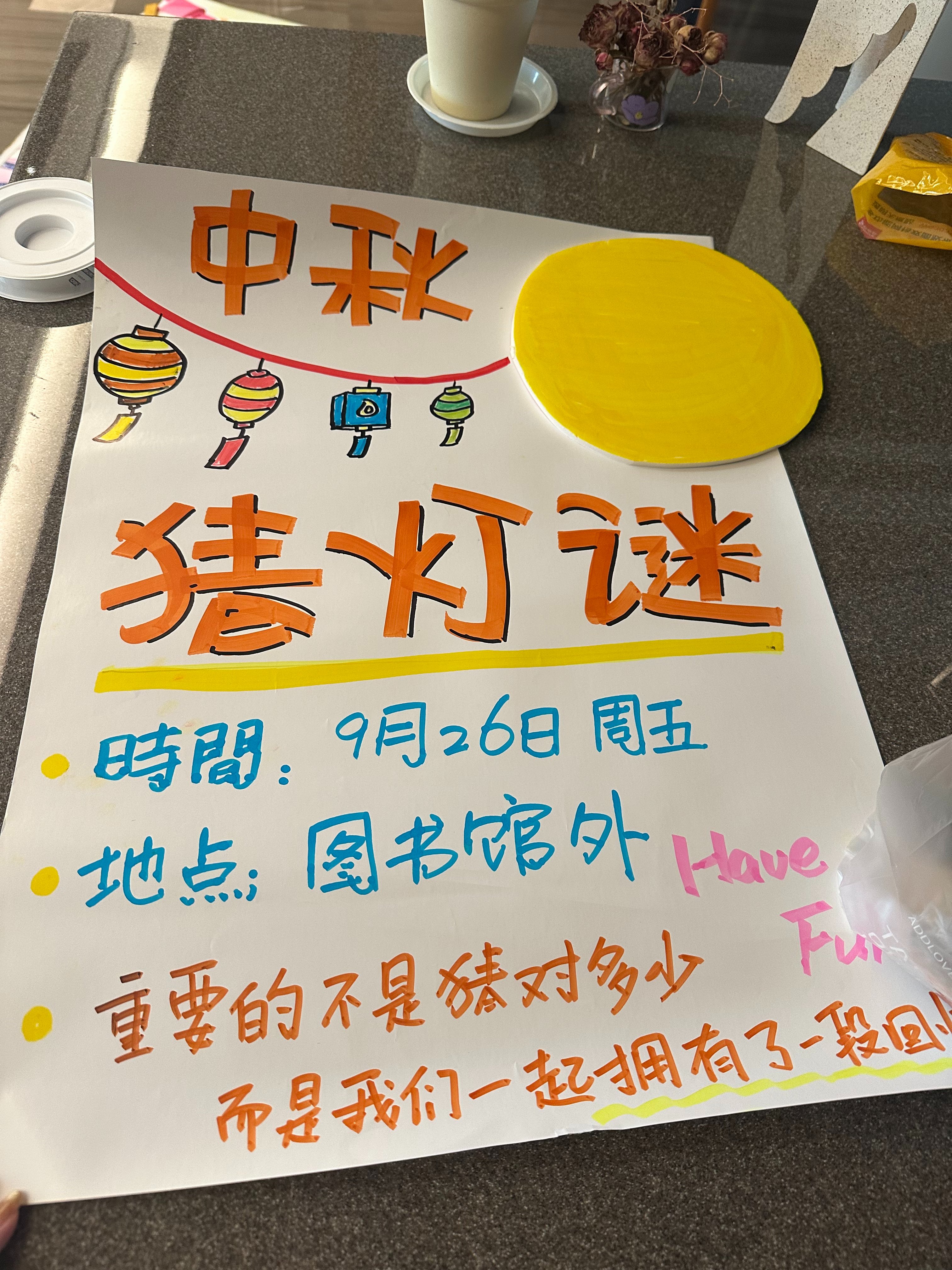 中秋猜灯谜活动很顺利,继老2馆当时送赠品导致场面混乱的经验后,这次策划取消了答对有礼物。换成了光荣榜,第一个答对的可以在海报上写上自己的名字和谜底。孩子们从开始问有奖品吗,到后面自豪的写上名字,还有一些同学拉着好朋友一起想,写不来字一起想办法,光荣榜上也一起写上了好朋友的名字。想想真是美好的回忆啊。