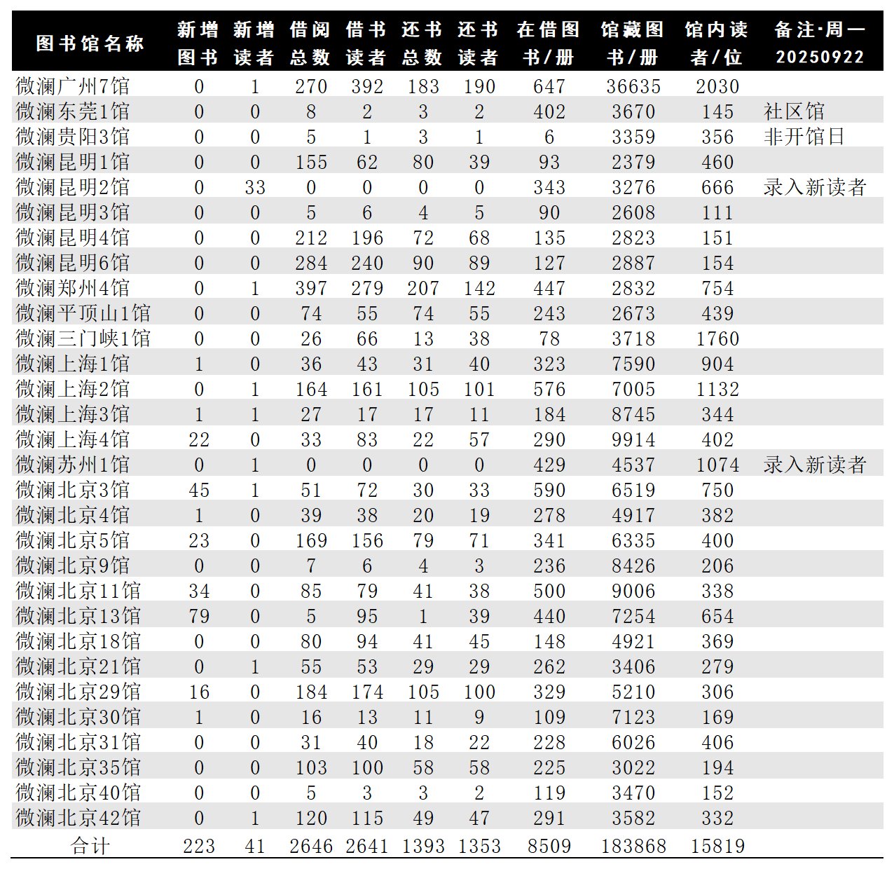 28所图书馆开放借阅,为1393位读者借阅图书2646册次,处理归还图2641册(1353人);各馆购买/受捐/学校馆藏等录入上架图书223册,各馆录入新读者41位。
