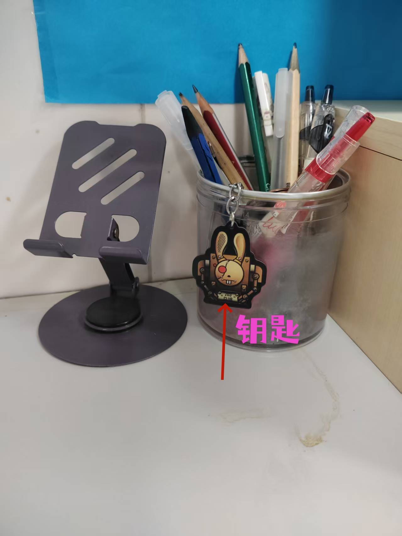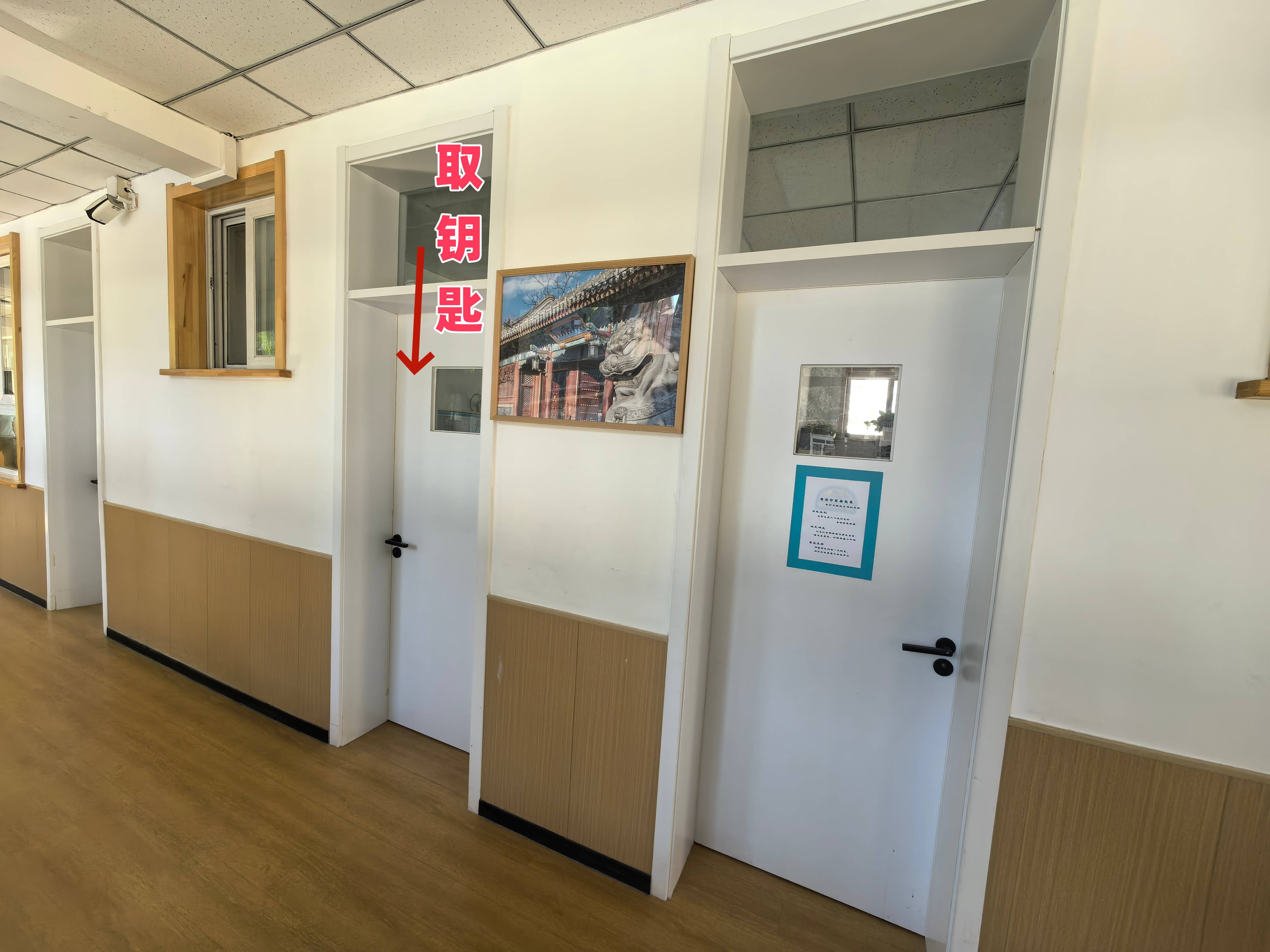 钥匙在一层曹鸿运老师的办公室领取(钥匙链为绘有兔子图案的黑色塑料牌),闭馆后放回此办公室曹老师桌面的笔筒即可;